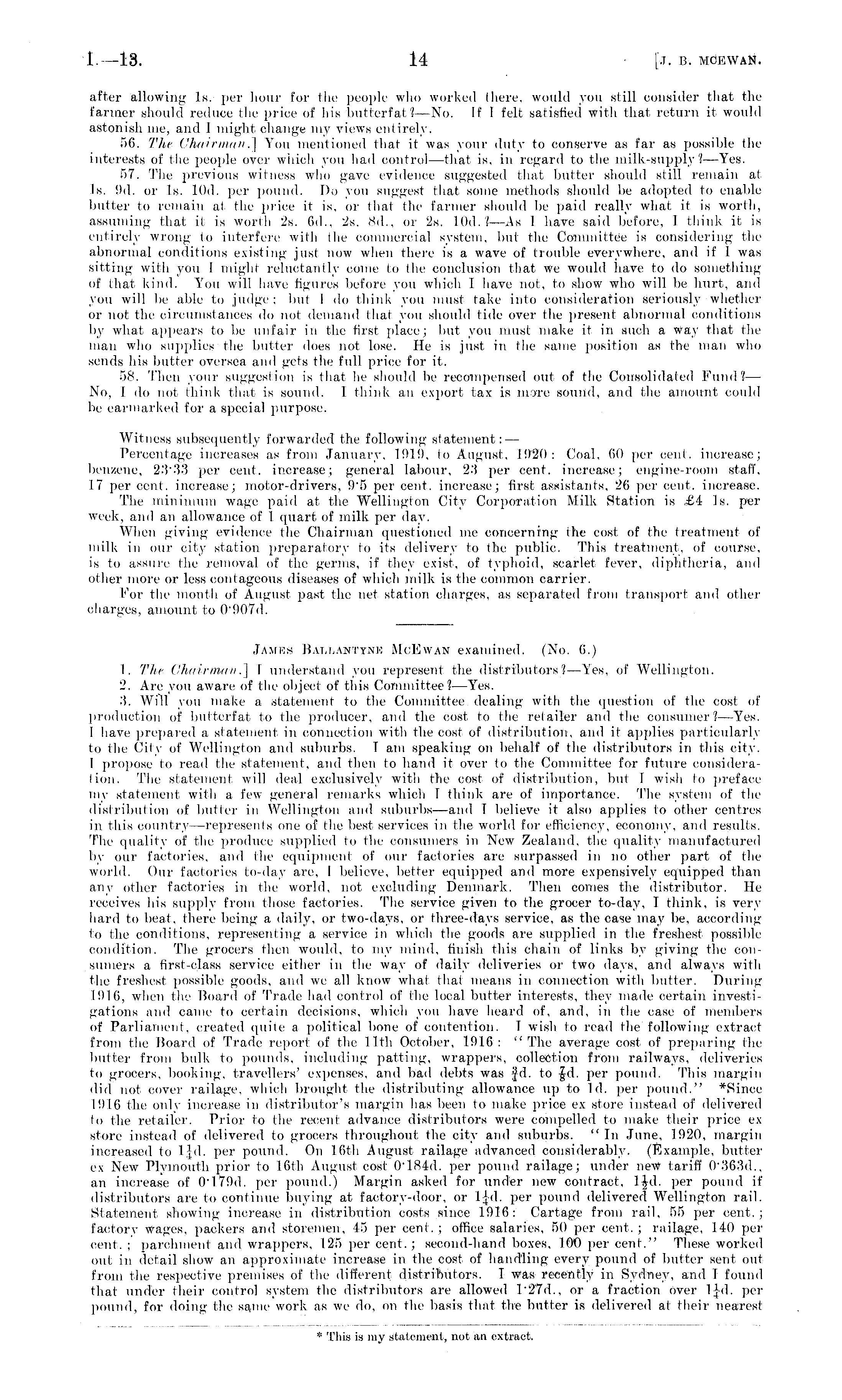 after allowing Is. per hour for Ihe people who worked (here, would you still consider that the farmer should reduce the price of his butterfat?—No. If 1 felt satisfied with that return it would astonish me, and I might change my views entirely. 56. The Chairman.] You mentioned that it was your duty to conserve as far as possible Ihe interests of the people over which you had control—that is, in regard to the milk-supply?— Yes. 57. The previous witness who gave evidence suggested that butter should slill remain at Is. 9d. or Is. lOtl. per pound. Do you suggest that some methods should be adopted to enable butter to remain at the price it is, or that the farmer should be paid really what it is worth, assuming that it is worth 2s. (id., 2s. Bd., or 2s. 10d.?—As I have said before, I think it is entirely wrong to interfere with the commercial system, but the Committee is considering the abnormal conditions existing just now when there is a wave of trouble everywhere, and if I was sitting with you 1 might reluctantly come lo Ihe conclusion that we would have to do something of that kind. You will have figures before you which I have not, to show who will be hurt, and you will be able to judge; but I do think you must take into consideration seriously whether or not the circumstances do not demand (hat you should tide over ihe present abnormal conditions by what appears to lie unfair in the first place; but you must make it in such a way that the man who supplies the butter does not lose. He is just in die same position as the man who sends his butter oversea and gets the full price for it. 58. Then your suggestion is that he should be recompensed otil of the Consolidated Fund ?— No, I do not think that is sound. I think an export tax is mire sound, and the amount could be earmarked for a special purpose. Witness subsequently forwarded the following statement: — Percentage increases as from January, 1919, lo August, 1920: Coal, 60 per cent, increase; benzene, 2333 per cent, increase; general labour, 23 per cent, increase; engine-room staff, 17 per cent, increase; motor-drivers, 95 per cent, increase; first, assistants, 26 per cent, increase. The minimum wage paid at the Wellington City Corporation Milk Station is £4 Is. per week, and an allowance of 1 quart of milk per day. When giving evidence the Chairman questioned me concerning ihe cost of Ihe treatment of milk in our city station preparatory lo its delivery to the public. This treatment, of course, is to assure the removal of the germs, if they exist, of typhoid, scarlet fever, diphtheria, anil other more or less contageous diseases of which milk is the common carrier. For the month of August past the net station charges, as separated from transport and other charges, amount to 0'907d. JAMESS Bai.i.antynk McEwak examined. (No. 6.) 1. The Chairman .j I understand you represent the distributors?— Yes, of Wellington. 2. Are you aware of the object of this Committee?— Yes. 3. Will you make a statement to the Committee dealing with the question of the cost of production of bulterfat to the producer, and the cost to the retailer and the consumer? —Yes. 1 have prepared a statement in connection with the cost of distribution, antl it applies particularly to the City of Wellington and suburbs. I ant speaking on behalf of the distributors in this city. I propose to read the statement, and then to hand it over to the Committee for future consideration. The statement will deal exclusively with the cost of distribution, but I wish lo preface my statement with a few general remarks which I think are of importance. The system of the distribution of butter in Wellington and suburbs—and I believe it also applies to other centres in this country—represenls one of the best services in the world for' efficiency, economy, and results. The quality of the produce supplied to the consumers in New Zealand, the quality manufactured by our factories, and the equipment of our factories are surpassed in no other part of the world. Our factories to-day are, I believe, better equipped anil more expensively equipped than any other factories in the world, not excluding Denmark. Then comes the distributor. He receives his supply from those factories. The service given to the grocer to-day, I think, is very hard to beat, there being a daily, or two-days, or three-days service, as the case may be, according to the conditions, representing a service in which Ihe goods are supplied in the freshest possible condition. The grocers then would, to my mind, finish this chain of links by giving Ihe consumers a first-class service either in the way of daily deliveries or two days, and always with the freshest possible goods, and we all know what that means in connection with butter. During 1916, when the Board of Trade had control of the local butter interests, they made certain investigations and came to certain decisions, which you have heard of, and, in the case of members of Parliament, created quite a political bone of contention. I wish to read the following extract from the Board of Trade report of the 11th October, 1916: "The average cost of preparing the butler from bulk to pounds, including patting, wrappers, collection from railways, deliveries to grocers, booking, travellers' expenses, and bad debts was Jd. to £d. per pound. This margin did not cover railage, which brought the distributing allowance up to Id, per pound." *Since 1916 the only increase in distributor's margin has been to make price ex store instead of delivered to the retailer. Prior to the recent advance distributors were compelled to make their price ex store instead of delivered to grocers throughout the city and suburbs. "In June, 1920, margin increased to lid. per pound. On 16th August railage advanced considerably. (Example, butter ex New Plymouth prior to 16th August cost o'lß4d. per pound railage; under new tariff 0'363d., an increase of 0*179(1. per pound.) Margin asked fo