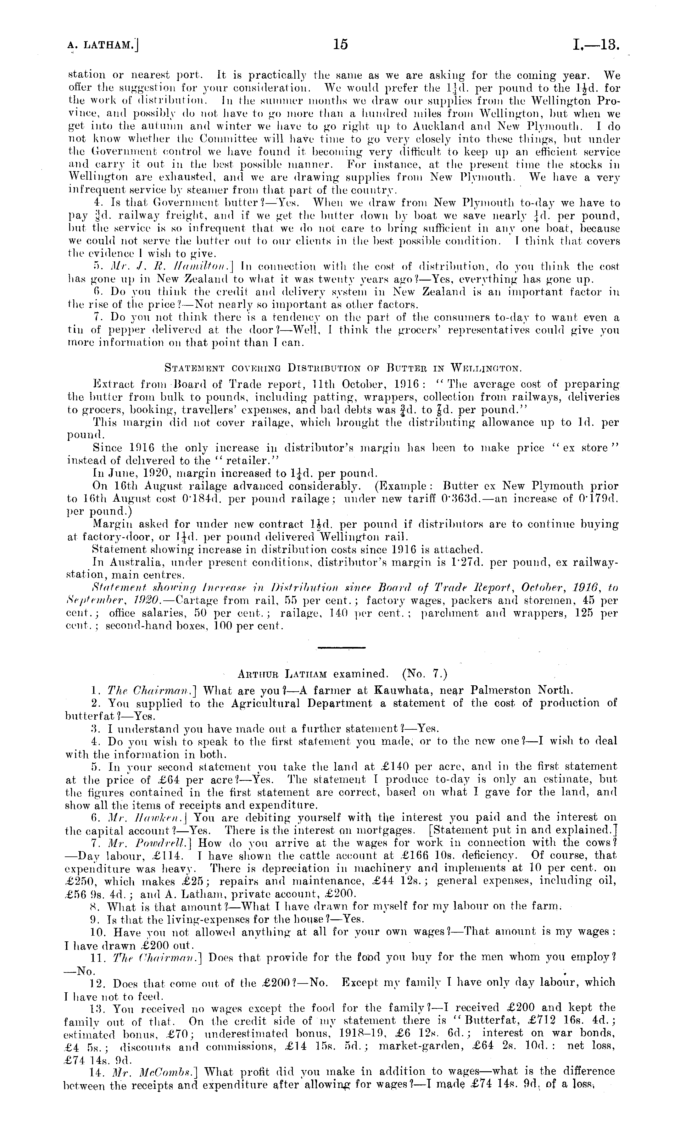 station or nearest port. It is practically the same as we are asking for the coming year. We offer the suggestion for your consideration, We would prefer the Ijd. per pound to the 1-4 d. for the work of distribution. In the summer months we draw our supplies from the Wellington Province, and possibly do not have to go more than a hundred miles from Wellington, but when we get into the autumn and winter we have to go right up to Auckland and New Plymouth. I do not know whether the Committee will have time to go very closely into these things, but under the Government control we have found it becoming very difficult to keep up an efficient service and carry it out in the best possible manner. For instance, at, the presenl time the stocks in Wellington are exhausted, and we are drawing supplies from New Plymouth. We have a very infrequent service by steamer from that part of the country. 4. Is that Government butter? —Yes. When we draw from New Plymouth to-day we have to pay |d. railway freight, and if we gel the butter down by boat we save nearly Jd. per pound, but the service is so infrequent that we do nol care to bring sufficient in any one boat, because we could not serve the buffer out lo our clients in Ihe best possible condition. I think that covers the evidence I wish to give. 5. Mr. .1. It. Hamilton ,| In connection with the cost of distribution, do you think the cost has gone up in New Zealand to what it was twenty years ago?— Yes, everything has gone up. 6. Do you think the credit and delivery system in New Zealand is an important factor in ihe rise of the price?— Not nearly so important as other factors. 7. Do you not think there is a tendency on the part of the consumers to-day to want even a tin of pepper delivered at the door? —Well, 1 think the grocers' representatives could give you more information on that point than I can. Statement coveiung Distiubution op Butter in Wellington, Extract, from Hoard of Trade report, 11th October, 1916: "The average cost of preparing the butter from bulk to pounds, including patting, wrappers, collection from, railways, deliveries lo grocers, booking, travellers' expenses, and bad debts was |d. to \A. per pound." This margin did not cover railage, which brought the distributing allowance up to Id. per pound. Since 1916 the only increase in distributor's margin has been to make price " ex store " instead of delivered to the " retailer." In June, 1920, margin increased to 14cl. per pound. On 16th August railage advanced considerably. (Example : Butler ex New Plymouth prior to Kith August cost o'lß4d. per pound railage; under new tariff 0'363d. —an increase of 0'179d. pei' pound.) Margin asked for under new contract \\A. per pound if distributors are to continue buying at factory-door, or I|d. per pound delivered Wellington rail. Statement showing increase in distribution costs since 1916 is attached. In Australia, under present conditions, distributor's margin is I'27d. per pound, ex railwaystation, main centres. Statement, showing Increase in Uistrilrulion since Board of Trade Report, October, 191(1, to September, 1920. —Cartage from rail, 55 per cent.; factory wages, packers and storemen, 45 per cent.; office salaries, 50 per cent.; railage, 140 per cent.; parchment and wrappers, 125 per cent. ; second-hand boxes, 100 per cent. AiiTiiau Latham examined. (No, 7.) 1. The, Chairman,] What are you?—A farmer at Kauwhata, near Pabnerston North. 2. You supplied to the Agricultural Department a statement of the cost of production of butterfat?—Yes. 3. I understand you have made out a further statement ?—Yes. 4. Do you wish to speak to the first statement you made, or to the new one?—l wish to deal with the information in both. 5. In your second statement you take the land at £140 per acre, and in the first, statement at the price of £64 per acre? —Yes. The statement 1 produce to-day is only an estimate, but the figures contained in the first statement are correct, based on what I gave for the land, and show all the items of receipts and expenditure. 6. Mr. Hawken.\ You are debiting yourself with the interest you paid and the interest on the capital account?— Yes. There is the interest on mortgages. [Statement put in and explained.} 7. Mr. Powdrell,] How do you arrive at the wages for work in connection with the cows? —Day labour, £1.14. I have shown the cattle account at £166 10s. deficiency. Of course, that, expenditure was heavy. There is depreciation in machinery and implements at 10 per cent, on £250, which makes £25; repairs and maintenance, £44 125.; general expenses, including oil, £56 9s. 4d. ; and A. Latham, private account, £200. 8. What is that amount?— What T have drawn for myself for my labour on the farm. 9. Is that the living-expenses for the house? —Yes. 10. Have you not allowed anything at all for your own wages?— That amount is my wages: I have drawn £200 out. 11. The Chairman.] Does that provide for flat food you buy for the men whom you employ? —No. 12. Does thai come out of the £200? —No. Except my family I have only day labour, which I have not to feed. 13. You received no wages except the food for the family?—l received £200 and kept the family out of that. On the credit side of my statement there is "Butterfat, £712 16s. 4d. ; estimated bonus, £70; underestimated bonus, 1918-19, £6 12s. 6d.; interest on war bonds, £4 55.; discounts and commissions, £14 15s. sd. ; market-garden, £64 2s. lOd. : net loss, £74 14s. 9d. 14. Mr. McCombs.] What profit did you make in addition to wages—what is the difference between the receipts and expenditure after allowing for wages?—l made £7-1 Ms. 9<l. of a loss,