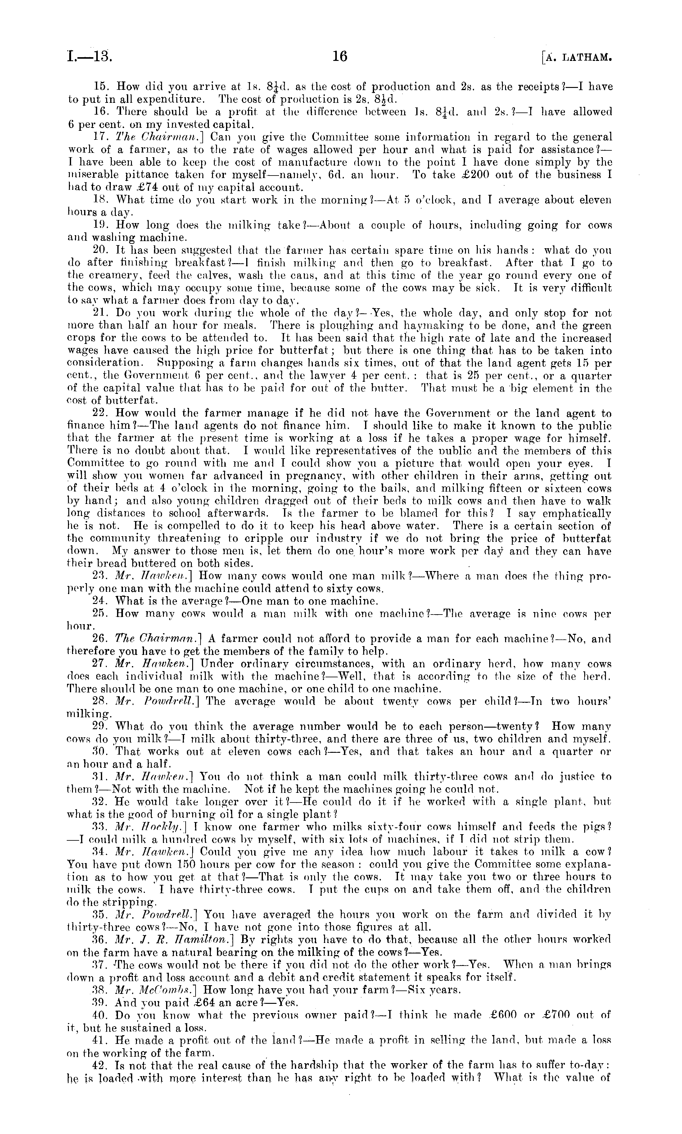15. How did you arrive at Is. BJd. as the cost of production and 2s. as the receipts? —I have to put in all expenditure. The cost of production is 2s. BJd. 16. There should be a profit at the difference between Is. 8!d. and 2s.? —I have allowed 6 per cent, on my invested capital. 17. The Chairman.] Can you give the Committee some information in regard to the general work of a farmer, as to the rate of wages allowed per hour and what is paid for assistance?— I have been able to keep the cost of manufacture down to the point I have clone simply by the miserable pittance taken for myself —namely, (id. an hour. To take £200 out of the business I had to draw £74 out of my capital account. 18. What time do you start work in the morning?—At 5 o'clock, and I average about eleven hours a day. 19. How long does the milking take? —About a couple of hours, including going for cows and washing machine. 20. It has been suggested that the farmer has certain spare time on his hands : what do you do after finishing breakfast? —I finish milking and then go to breakfast. After that 1 go to the creamery, feed the calves, wash the cans, and at this time of the year go round every one of the cows, which may occupy some time, because some of the cows may be sick. It is very difficult lo say what a farmer does from day to day. 21. Do you work during the whole of the day?—-Yes, the whole day, and only stop for not more than half an. hour for meals. There is ploughing and haymaking to be done, and the green crops for the cows to be attended to. It has been said that the high rate of late and the increased wages have caused the high price for butterfat; but there is one thing that has to be taken into consideration. Supposing a farm changes hands six times, out of that the land agent gets 15 per cent., the Government 6 per cent., and the lawyer 4 per cent. : that is 25 per cent., or a quarter of the capital value that has to be paid for out of the butter. That must be a big element in the cost of butterfat. 22. How would the farmer manage if he did not have the Government or the land agent to finance him? —The land agents do not finance him. T should like to make it known to the public that the farmer at the present time is working at a loss if he takes a proper wage for himself. There is no doubt about that. I would like representatives of the uublic and the members of this Committee to go round with me and I could show you a picture that would open your eyes. I will show you women far advanced in pregnancy, with other children in their arms, getting out of their beds at 4 o'clock in Ihe morning, going to the bails, and milking fifteen or sixteen cows by hand; and also young children dragged out of their beds to milk cows and then have to walk long distances to school afterwards. Is the farmer to be blamed for this? I say emphatically he is not. He is compelled to do if to keep his head above water. There is a certain section of the community threatening to cripple our industry if we do not bring the price of butterfat, down. My answer to those men is, let them do one hour's more work per da)' and they can have their bread buttered on both sides. 23. Mr. Hawken,] How many cows would one man milk?— Where a man does the thing properly one man with the machine could attend to sixty cows. 24. What is the average?— One man to one machine. 25. How many cows would a man milk with one machine?— The average is nine cows per hour. 26. The Chairman.] A farmer could not afford to provide a man for each machine?—No, and therefore you have to get the members of the family to help. 27. Mr. Hawken,] Under ordinary circumstances, with an ordinary herd, how many cows does each individual milk with the machine? —Well, that is according to the size of the herd. There should be one man to one machine, or one child to one machine. 28. Mr. Powdrell.] The average would be about twenty cows per child?—Tn two hours' milking. 29. What do you think the average number would be to each person—twenty? How many cows do you milk?—l milk about thirty-three, and there are three of us, two children and myself. 30. That works out at eleven cows each? —Yes, and that takes an hour and a quarter or an hour and a half. 31. Mr. Hawken . | You do not think a man could milk thirty-three cows and do justice to them?— Not with the machine. Not if he kept the machines going he could not. 32. He would take longer over it?—He could do it. if he worked with a single plant, but what is the good of burning oil for a single plant? 33. Mr. Hockly.\ T know one farmer who milks sixty-four cows himself and feeds the pigs? —I could milk a hundred cows by myself, with six lots of machines, if I did not strip them. 34. Mr. Hawken.] Could you give me any idea how much labour it takes to milk a cow? You have put down 150 hours per cow for the season : could you give the Committee some explanation as to how you get at that?— That is only the cows. It may take you two or three hours to milk the cows, I have thirty-three cows. T put the cups on and take them off, and the children do the stripping. 35. Mr. Powdrell.] You have averaged the hours you work on the farm and divided it by thirty-three cows?—No, I have not gone into those figures at all. 36. Mr. J. R. Hamilton.] By rights you have to do that, because all the other hours worked on the farm have a natural bearing on the milking of the cows ?—Yes. 37. The cows would not be there if you did not do the other work? —Yes. When a man brings down a profit and loss account and a debit and credit statement it speaks for itself. 38. Mr. McCombs.] How long have you had your farm ?—Six years. 39. And you paid £64 an acre? —Yes. 40. Do yon know what the previous owner paid?—T think he made £600 or £700 out of it, but he sustained a loss. 41. He, made a profit out, of the land? —He made a profit in selling the land, lint made a loss on the working of the farm. 42. Is not 