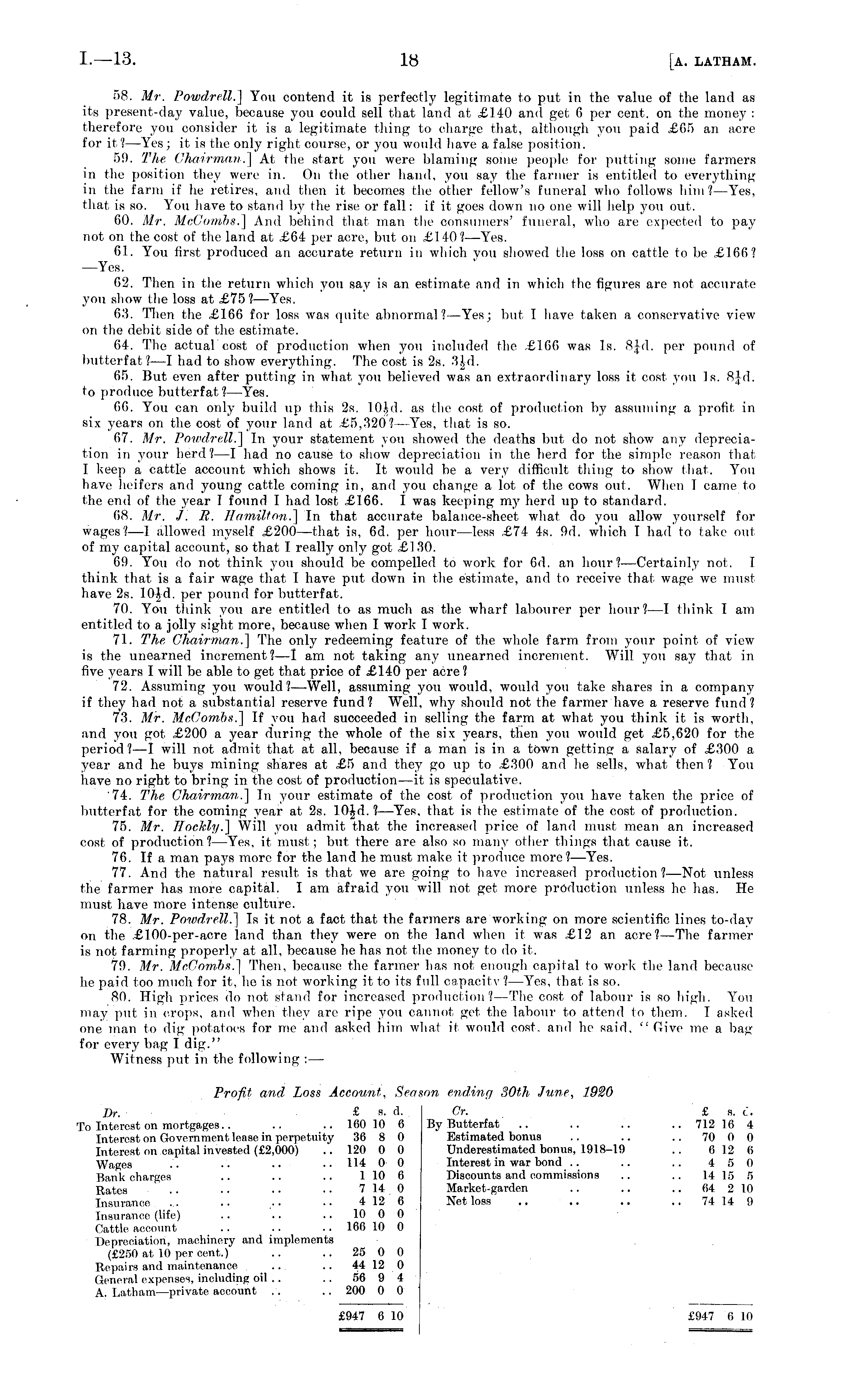 58. Mr. Powdrell.] You contend it is perfectly legitimate to put in the value of the land as its present-day value, because you could sell that land at £140 and get 6 per cent, on the money : therefore you consider it is a legitimate thing to charge that, although you paid £65 an acre for it?— Yes; it is the only right course, or you would have a false position. 59. The Chairman,] At the start you were blaming some people for putting some farmers in the position they were in. On the other hand, you say the farmer is entitled to everything in the farm if he retires, and then it becomes the other fellow's funeral who follows him? —Yes, that is so. You have to stand by the rise or fall: if it goes down no one will help you out. 60. Mr. McCombs.] And behind that man the consumers' funeral, who are expected to pay not on the cost of the land at £64 per acre, but on £1 40 ?—Yes. 61. You first produced an accurate return in which you showed the loss on cattle to be £166? —Yes. 62. Then in the return which you say is an estimate and in which the figures are not accurate you show the loss at £75 ? —Yes. 63. Then the £166 for loss was quite abnormal? —Yes; but. I have taken a conservative view on the debit side of the estimate. 64. The actual cost of production when you included the ,£166 was Is. BJ-d. per pound of butterfat?—l had to show everything. The cost is 2s. 3|d. 65. But even after putting in what, you believed was an extraordinary loss it cost you Is. 84/1. to produce butterfat? —Yes. 66. You can only build up this 2s. IOJd. as the cost of production by assuming a profit in six years on the cost of your land at £5,320? —Yes, that is so. 67. Mr. Powdrell.] In your statement you showed the deaths but do not show any depreciation in your herd?—l had no cause to show depreciation in the herd for the simple reason that I keep a cattle account which shows it. It would be a very difficult thing to show that. You have heifers and young cattle coming in, and you change a lot of the cows out. When I came to the end of the year I found I had lost £166. I was keeping my herd up to standard. 68. Mr. J. R. Hamilton.] In that accurate balance-sheet what do you allow yourself for wages?—l allowed myself £200—that is, 6d. per hour—less £74 4s. 9d. which I had to take out of my capital account, so that I really only got £1 30. 69. You do not think you should be compelled to work for 6d. an hour?— Certainly not. 1 think that is a fair wage that I have put down in the estimate, and to receive that wage we must have 2s. 10-|d, per pound for butterfat. 70. You think you are entitled to as much as the wharf labourer per hour? —I think I am entitled to a jolly sight more, because when I work I work. 71. The, Chairman.] The only redeeming feature of the whole farm from your point of view is the unearned increment?—l am not taking any unearned increment. Will you say that in five years I will be able to get that price of £140 per acre ? 72. Assuming you would?— Well, assuming you would, would you take shares in a company if they had not a substantial reserve fund? Well, why should not the farmer have a reserve fund? 73. Mr. McCombs.] If you had succeeded in selling the farm at what you think it is worth, and you got £200 a year during the whole of the six years, then you would get £5,620 for the period?—l will not admit that at all, because if a man is in a town getting a Salary of £300 a year and he buys mining shares at £5 and they go up to £300 and he sells, what then ? You have no right to bring in the cost of production—it is speculative. '74. The Chairman.] In your estimate of the cost of production you have taken the price of butterfat for the coming year at 2s. 1 OJd. ? —Yes. that is the estimate of the cost of production. 75. Mr. Hockly.] Will you admit that the increased price of land must mean an increased cost of production? —Yes, it must; but there are also so many other things that cause it. 76. If a man pays more for the land he must make it produce more?— Yes. 77. And the natural result is that we are going to have increased production ?—Not unless the farmer has more capital. lam afraid you will not get more production unless he has. He must have more intense culture. 78. Mr. Powdrell.] Is it not, a fact that, the farmers are working on more scientific lines to-day on the £100-per-acre land than they were on the land when it was £12 an acre?— The farmer is not farming properly at all, because he has not the money to do it. 79. Mr. McCombs.] Then, because the farmer has not enough capital to work the land because he paid too much for it, ho is not working it to its full capacity ?—Yes, that is so, 80. High prices do not stand for increased production?— The cost of labour is so high. You may put in crops, and when they are ripe you cannot get, the labour to attend to them. T asked one man to dig potatoes for me and asked him what il would cost, and he said. "Give me a bag for every bag I dig." Witness put in the following : — Profi,t and Loss Account, Season ending 30th June, 1920 Dr. £ s. d. Or. £ s. C. To Intercut on mortgages.. .. .. 160 10 6 By Butterfat .. .. .. .. 712 16 4 Interest on Government lease in perpetuity 36 8 0 Estimated bonus .. .. .. 70 0 0 Interest on capital invested (£2,000) .. 120 0 0 Underestimated bonus, 1918-19 .. 012 6 Wages .'. .. .. •• 114 0- 0 Interest in war bond .. .. .. 4 5 0 Bank charges .. .. .. 110 6 Discounts and commissions .. .. 14 15 5 Rates .. .. .. ■• 714 0 Market-garden .. .. .. 04 210 Insurance ... .. ... •• 412 6 Net loss .. .. .. .. 74 14 9 Insurance (life) .. .. .. 10 0 0 Cattle account .. ; . .. 160 10 0 Depreciation, machinery and implements (£250 at 10 percent.) .. .. 25 0 0 Repairs and maintenance , .. .. 44 12 0 General expenses, including oil .. .. 56 9 4 A. Latham —private account .. .. 200 0 0 £947 6 10 £947 6 10