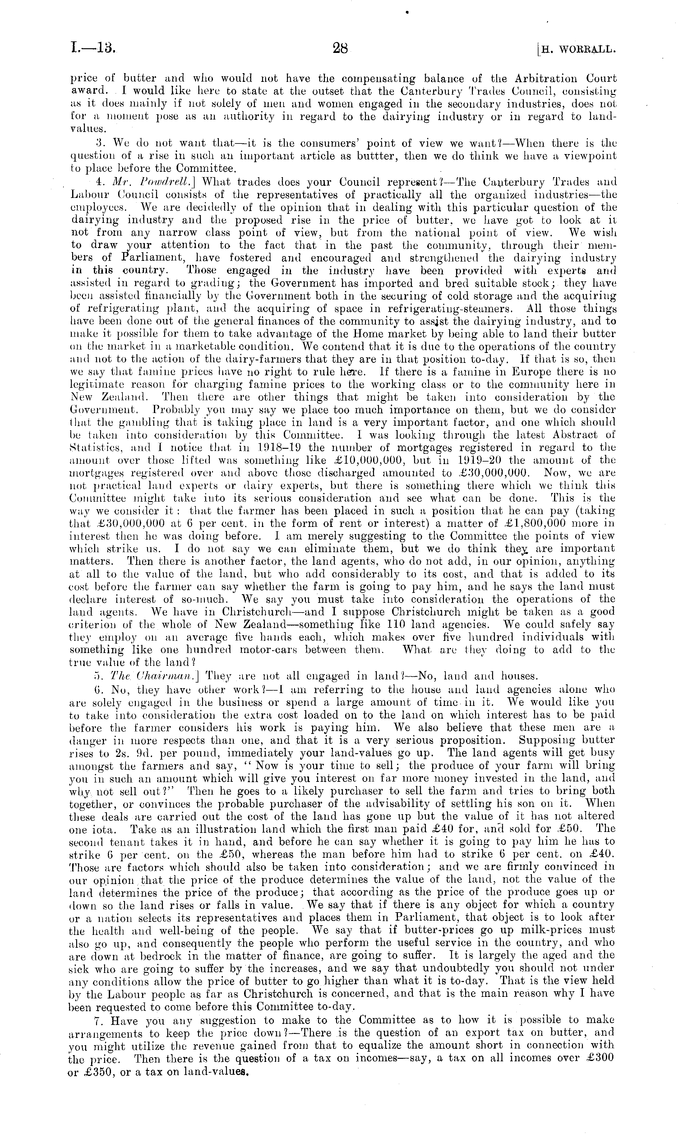price of butter and who would not have the compensating balance of the Arbitration Court award. I would like here to state at the outset that the Canterbury Trades Council, consisting as it does mainly if not solely of men and women engaged in the secondary industries, does not for a moment pose its an authority in regard to the dairying industry or in regard to landvalues. 3. We do not want that—it is the consumers' point of view we want? —When there is the question of a rise in such an important article as buttter, then we do think we have a viewpoint to place before the Committee. 4. Mr. Powdrell.] What trades does your Council represent? —The Canterbury Trades and Labour Council consists of the representatives of practically all the organized industries —the employees. We are decidedly of the opinion that in dealing with this particular question of the dairying industry and the proposed rise in the price of butter, we have got to look at it not from any narrow class point of view, but from the national point of view. We wish to draw }-our attention to the fact that in the past the community, through their members of Parliament, have fostered and encouraged and strengthened the dairying industry in this country. Those engaged in the industry have been provided with experts and assisted in regard to grading; the Government has imported and bred suitable stock; they have been assisted financially by the Government both in the securing of cold storage and the acquiring of refrigerating plant, and the acquiring of space in refrigerating-steamers. All those things have been done out of the general finances of the community to assist the dairying industry, and to make it possible for them to take advantage of the Home market by being able to land their butter on the market in a marketable condition. We contend that it is due to the operations of the country and not to the action of the dairy-farmers that they are in that position to-day. If that is so, then we say that famine prices have no right to rule here. If there is a famine in Europe there is no legitimate reason for charging famine prices to the working class or to the community here in New Zealand. Then there are other things that might be taken into consideration by the Government. Probably you may say we place too much importance on them, but we do consider thai tin: gambling that is taking place in land is a very important factor, and one which should be taken into consideration by this Committee. I was looking through (he latest Abstract of Statistics, and I notice that in 1918-19 the number of mortgages registered in regard to the amount over those lifted was something like £10,000,000, but in 1919-20 the amount of the mortgages registered over antl above those discharged amounted to £30,000,000. Now, we are not practical land experts or dairy experts, but there is something there which we think this Committee might take into its serious consideration and see what can be done. This is the way we consider it, : that the farmer has been placed in such a position that he can pay (taking that £30,000,000 at 6 per cent, in the form of rent or interest.) a matter of £1,800,000 more in interest then he was doing before. J am merely suggesting to the Committee the points of view which strike us. I do not say we can eliminate them, but we do think they, are important matters. Then there is another factor, the land agents, who do not. add, in our opinion, anything at all to the value of the land, but who add considerably to its cost, and that is added to its cost before the farmer can say whether the farm is going to pay him, and he says the land must declare interest of so-much. We say you must take into consideration the operations of the land agents. We have in Christchurch —and I suppose Christchurch might be taken as a good criterion of the whole of New Zealand —something like lit) land agencies. We could safely say they employ on an average five hands each, which makes over five hundred individuals with something like one hundred motor-cars between them: What are they doing to add to the true value of the land ? 5. The Chairman.] They are not all engaged in land?—No, land and houses. 6. No, they have other work? —I am referring to the house and land agencies alone who are solely engaged in the business or spend a large amount of time-in it. We would like you to take into consideration the extra cost loaded on to the land on which interest has to be paid before the farmer considers his work is paying him. We also believe that these men are a danger in more respects than one, and that it is a very serious proposition. Supposing butter rises to 2s. 9d. per pound, immediately your land-values go up. The land agents will get busy amongst the farmers antl say, " Now is your time to sell; the produce of your farm will bringyon in such an amount which will give you interest on far more money invested in the land, and why not sell out?" Then he goes to a likely purchaser to sell the farm and tries to bring both together, or convinces the probable purchaser of the advisability of settling his son on it. When these deals are carried out the cost of the land has gone up but the value of it, has not altered one iota. Take as an illustration land which the first man paid £40 for, and sold for £50. The second tenant takes it in hand, and before he can say whether it is going to pay him he has to strike 6 per cent, on the £50, whereas the man before him had to strike 6 per cent, on £40. Those are factors which should also be taken into consideration; and we are firmly convinced in our opinion that the price of the produce determines the value of the land, not the value of the land determines the price of the produce; that according as the price of the produce goes up or down so the land rises or falls in value. We say that if there is any object for which a country or a nation selects its representatives and places them in