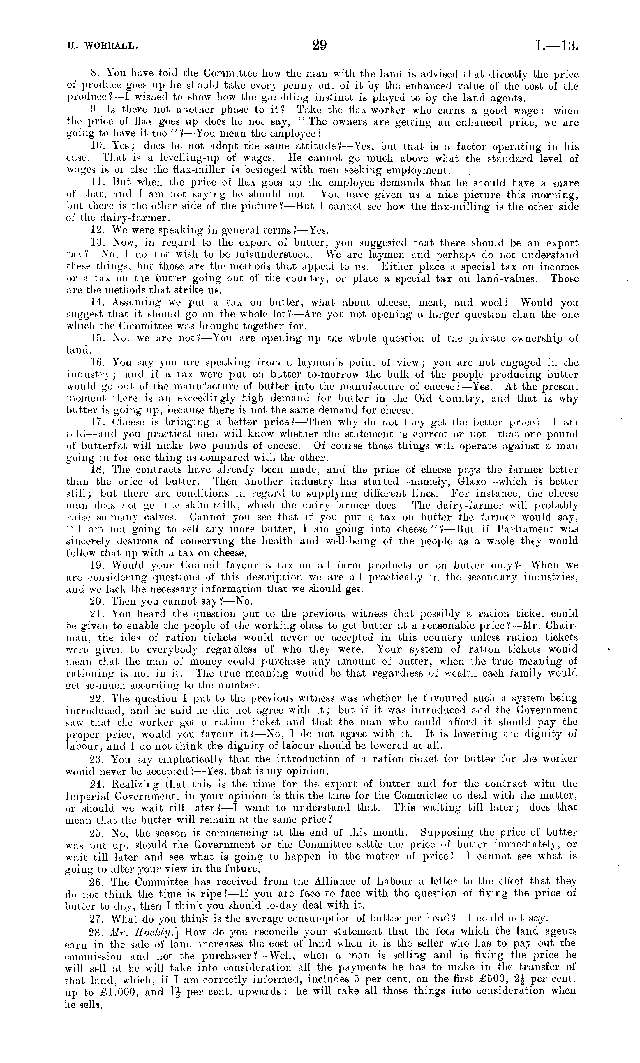 8. You have tohl the Committee how the man with the land is advised that directly the price of produce goes up he should take every penny out of it by the enhanced value of the cost of the produce? —I wished to show how the gambling instinct is played to by the land agents. 9. Is there not another phase to it? Take the flax-worker who earns a good wage: when the price of Hax goes up does he not say, " The owners are getting an enhanced price, we are going to have it too " I—You1 —You mean the employee? 10. Yes; does he not adopt the same attitude? —Yes, but that is a factor operating in his case. That is a levelling-up of wages. He cannot go much above what the standard level of wages is or else the flax-miller is besieged with men seeking employment. 11. But when the price of flax goes up the employee demands that he should have a share of that, and I am not saying he should not. You have given us a nice picture this morning, but there is the other side of the picture?— But I cannot see how the flax-milling is the other side of the dairy-farmer. 12. We were speaking in general terms? —Yes. 13. Now, in regard to the export of butter, you suggested that there should be an export tax?—No, I do not wish to be misunderstood. We are laymen and perhaps do not understand these things, but those are the methods that appeal to us. Either place a special tax on incomes or a tax on the butter going out of the country, or place a special tax on land-values. Those are the methods that strike us. 14. Assuming we put a tax on butter, what about cheese, meat, and wool? Would you suggest that it should go on the whole lot?— Are you not opening a larger question than the one which the Committee was brought together for. .1.5. No, we are not? —You are opening up the whole question of the private ownership of land. 16. You say you are speaking from a layman's point of view; you are not engaged in the industry; and if a tax were put on butter to-morrow the bulk of the people producing butter would go out of the manufacture of butter into the manufacture of cheese? —Yes. At the present moment there is an exceedingly high demand for butter in the Old Country, and that is why butter is going up, because there is not the same demand for cheese. f7. Cheese is bringing a better price?— Then why do not they get the better price? 1 am told—antl you practical men will know whether the statement is correct or not —that one pound of butterfat will make two pounds of cheese. Of course those things will operate against a man going in for one thing as compared with the other. 18. The contracts have already been made, and the price of cheese pays the farmer better than the price of butter. Then another industry has started —namely, Glaxo—which is better still; but there are conditions in regard to supplying different lines. For instance, the cheese man does not get the skim-milk, which the dairy-farmer does. The dairy-farmer will probably raise so-many calves. Cannot you see that if you put a tax on butter the farmer would say, "1 am not going to sell any more butter, 1 am going into cheese"?— But if Parliament was sincerely desirous of conserving the health and well-being of the people as a whole they would follow that up with a tax on cheese. 19. Would your Council favour a tax on all farm products or on butter only?— When we are considering questions of this description we are all practically in the secondary industries, and we lack the necessary information that we should get. 20. Then you cannot say?— No. 21. You heard the question put to the previous witness that possibly a ration ticket could be given to enable the people of the working class to get butter at a reasonable price?— Mr. Chairman, the idea of ration tickets would never be accepted in this country unless ration tickets were given to everybody regardless of who they were. Your system of ration tickets would mean that, the man of money could purchase any amount of butter, when the true meaning of rationing is not in it. The true meaning would be that regardless of wealth each family would get so-much according to the number. 22. The question I put to the previous witness was whether he favoured such a system being introduced, and he said he did not agree with it; but if it was introduced and the Government saw that the worker got a ration ticket and that the man who could afford it should pay the proper price, would you favour it?—No, 1 do not agree with it. It is lowering the dignity of labour, and I do not think the dignity of labour should be lowered at all. 23. You say emphatically that the introduction of a ration ticket for butter for the worker would never be accepted?— Yes, that is my opinion. 24. Idealizing that this is the time for the export of butter antl for the contract with the Imperial Government, in your opinion is this the time for the Committee to deal with the matter, or should we wait till later? —I want to understand that. This waiting till later; does that mean that the butter will remain at the same price ? 25. No, the season is commencing at the end of this month. Supposing the price of butter was put up, should the Government or the Committee settle the price of butter immediately, or wait till later and sec what is going to happen in the matter of price?—l cannot see what is going to alter your view in the future. 26. The Committee has received from the Alliance of Labour a letter to the effect that they do not think the time is ripe? —If you arc face to face with the question of fixing the price of butter to-day, then I think you should to-day deal with it. 27. What do you think is the average consumption of butter per head?—l could not say. 28. Mr. Hockly.] How do you reconcile your statement that the fees which the land agents earn in the sale of land increases the cost of land when it is the seller who has to pay out the commission and not the purchaser?— Well, when a man is