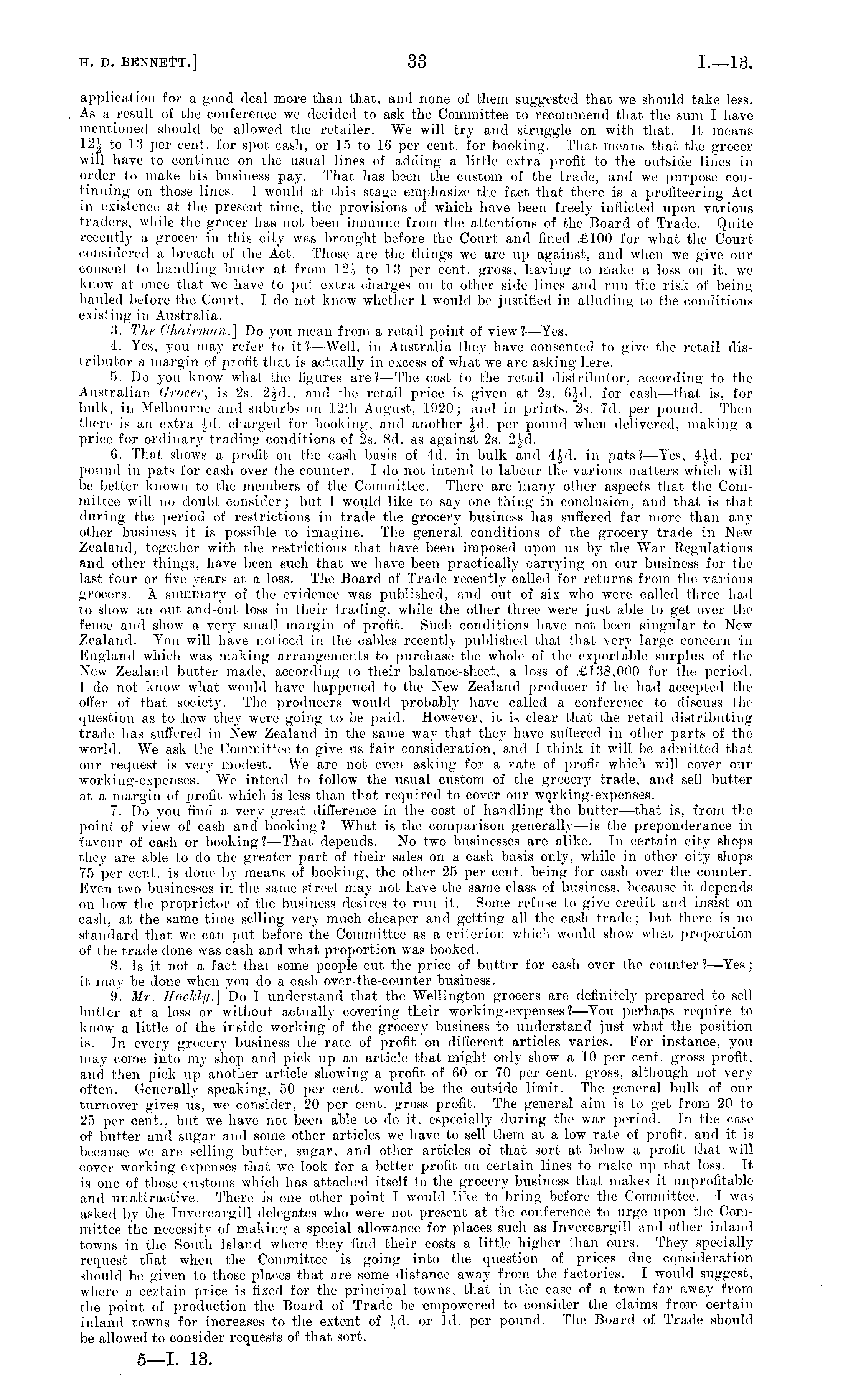 application for a good deal more than that, and none of them suggested that we should take less. As a result of the conference we decided to ask the Committee to recommend that the sum I have mentioned should be allowed the retailer. We will try and struggle on with that. It means 12i to 13 per cent, for spot cash, or 15 to 16 per cent, for booking. That means that the grocer will have to continue on the usual lines of adding a little extra profit to the outside lines in order to make his business pay. That has been the custom of the trade, and we purpose, continuing on those lines. I would at this stage emphasize the fact that there is a profiteering Act in existence at the present time, the provisions of which have been freely inflicted upon various traders, while the grocer has not been immune from the attentions of the Board of Trade. Quite recently a grocer in this city was brought before the Court and fined £100 for what the Court considered a breach of the Act. Those are the things we are up against, and when we give our consent to handling butter at from 12. 1 , to 13 per cent, gross, having to make a loss on it, we know at once that we have to put extra charges on to other side lines and run the risk of being hauled before the Court. Ido not know whether I would be justified in alluding to the conditions existing in Australia. 3. The Chairman.] Do you mean from a retail point of view?— Yes. 4. Yes, you may refer to it? —Well, in Australia they have consented to give the retail distributor a margin of profit that is actually in excess of what we are asking here. 5. Do you know what the figures are?— The cost to the retail distributor, according to the Australian Grocer, is 2s. 2 : d., and the retail price is given at 2s. 63,(1. for cash—that is, for bulk, in Melbourne, and suburbs on 12th August, 1920; and in prints, 2s. 7<l. per pound. Then there is an extra |d. charged for booking, and another _d. per pound when delivered, making a price for ordinary trading conditions of 2s. Bd. as against 2s. 2. I ,d. 6. That shows a profit on the cash basis of 4(1. in bulk and in pats?— Yes, 4|d. per pound in pats for cash over the counter. Ido not intend to labour the various matters which will be better known to the members of the Committee. There arc 'many other aspects that the Committee will no doubt consider; but I would like to say one thing in conclusion, and that is I hat during the period of restrictions in trade the grocery business has suffered far more than any other business it is possible to imagine. The general conditions of the grocery trade in New Zealand, together with the restrictions that have been imposed upon us by the War Regulations and other things, have been such that we have been practically carrying on our business for the last four or five years at a loss. The Board of Trade recently called for returns from the various grocers. A summary of the evidence was published, and out of six who were called three had to show an out-and-out loss in their trading, while the other three, were just able to get over the fence and show a very small margin of profit. Such conditions have not been singular to New Zealand. You will have noticed in the cables recently published that that very large concern in England which was making arrangements to purchase the whole of the exportable surplus of (he New Zealand butter made, according to their balance-sheet, a loss of £138,000 for the period. I do not know what would have happened to the New Zealand producer if he had accepted the offer of that society. The producers would probably have called a conference to discuss the question as to how they were going to be paid. However, it is clear that the retail distributing trade has suffered in New Zealand in the same way that they have suffered in other parts of the world. We ask the Committee to give us fair consideration, and 1 think if will be admitted that our request is very modest. We are not even asking for a rate of profit which will cover our working-expenses. We intend to follow the usual custom of the grocery trade, and sell butter at a margin of profit which is less than that required to cover our working-expenses. 7. Do you find a very great difference in the cost of handling the butter—that, is, from the point of view of cash and booking? What is the comparison generally—is the preponderance in favour of cash or booking?— That depends. No two businesses are alike. In certain city shops they are able to do the greater part of their sales on a cash basis only, while in other city shops 75 per cent, is done by means of booking, the other 25 per cent, being for cash over the counter. Even two businesses in the same street may not have the same class of business, because it depends on how the proprietor of the business desires to run it. Some refuse to give Credit and insist on cash, at the same time selling very much cheaper and getting all the cash trade; but there is no standard that we can put, before the Committee as a criterion which would show what proportion of the trade done was cash and what proportion was booked. 8. Is it not a fact that some people cut the price of butter for cash over tin- counter?— Yes; it may be done when you do a cash-over-the-counter business. 9. Mr. Hackly.] Do J understand that the Wellington grocers are definitely prepared to sell butler at a loss or without actually covering their working-expenses?— You perhaps require to know a little of the inside, working of the grocery business to understand just what the position is. In every grocery business the rate of profit on different articles varies. For instance, you may come into my shop and pick up an article that might only show a 10 per cent, gross profit, and then pick up another article showing a profit of 60 or 70 per cent, gross, although not very often. Generally speaking, 50 per cent, would be the outside limit. The general bulk of our turnover gives us, we consi