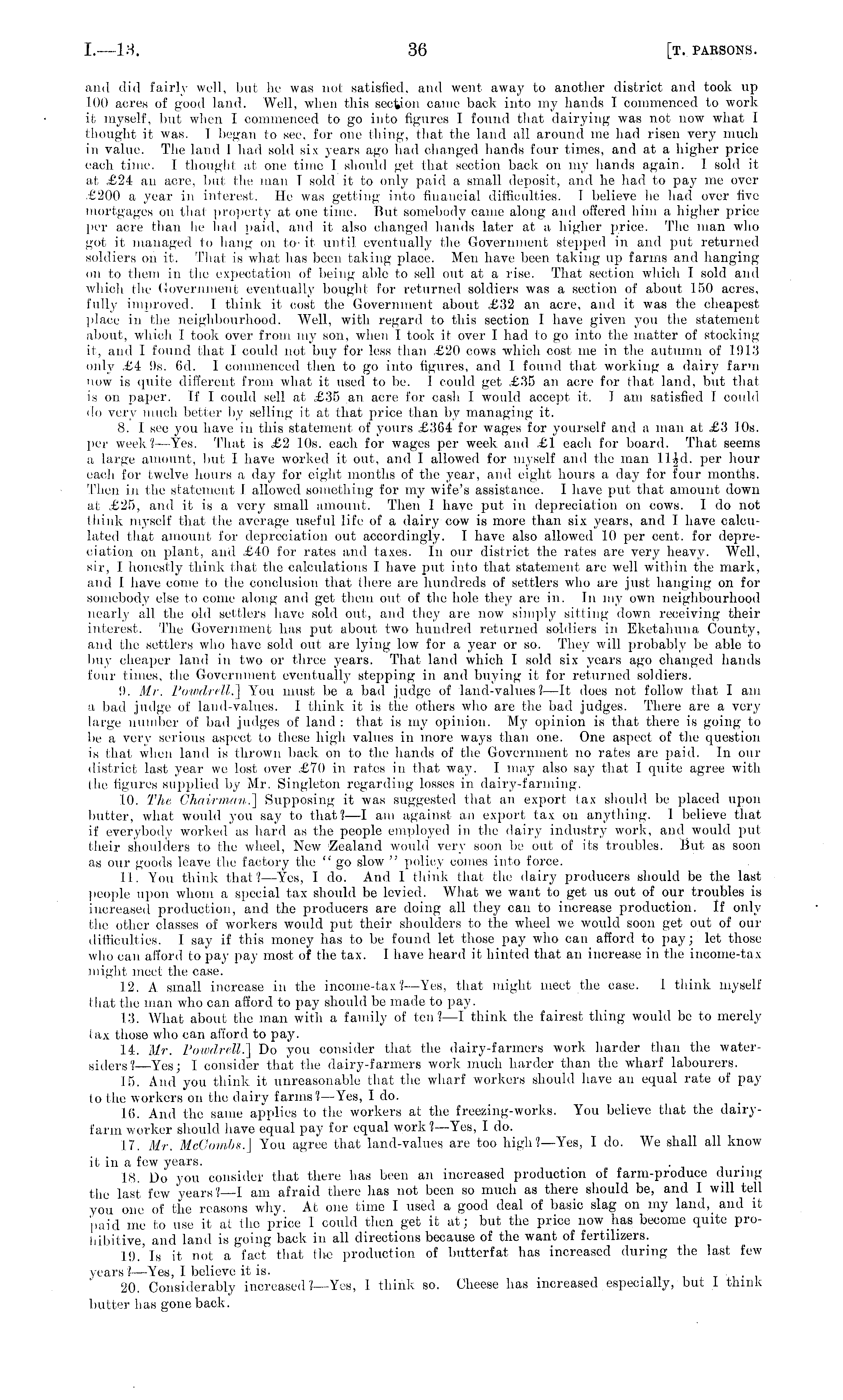 and did fairly well, but he was not satisfied, and went away to another district and took up 100 acres of good land. Well, when this section came back into my hands I commenced to work if, myself, but when I commenced to go into figures I found that dairying was not now what I thought it was. 1 began to see, for one thing, that the land all around me had risen very much in value. The land I had sold six years ago had changed hands four times, and at a higher price each time. I thought at one time I should get that section back on my hands again. I sold it at £24 an acre, but the man I sold it to only paid a small deposit, and he had to pay me over £200 a year in interest. He was getting into financial difficulties. I believe he had over five mortgages on that property at one time. But somebody came along and offered him a higher price per acre than he had paid, and it also changed hands later at a higher price. The man who got it managed to hang on to- it until eventually the Government stepped in and put returned soldiers oh it. That is what has been taking place. Men have been taking up farms and hanging on to them in the expectation of being able to sell out at a rise. That section which I sold and which Ihe Government eventually bought for returned soldiers was a section of about 150 acres, fully improved. I think it cost the Government about £32 an acre, and it was the cheapest place in the neighbourhood. Well, with regard to this section I have given you the statement about, which I took over from my son, when I took" it over I had to go into the matter of stockingit, and 1 found that I could not buy for less than £20 cows which cost me in the autumn of 1913 only £4 9s. 6d. I commenced then to go into figures, and I found that working a dairy farm now is quite different from what it used to be. 1 could get £35 an acre for that land, but that is on paper. If I could sell at £35 an acre for cash I would accept it. 1 am satisfied 1 could do very much better by selling it at that price than by managing it. 8. I see you have in this statement of yours £364 for wages for yourself and a man at £3 10s. per week? —Yes. That is £2 10s. each for wages per week, antl £1 each for board. That seems a large amount, but I have worked it out, and I allowed for myself and the man Hid. per hour each for twelve hours a day for eight months of the year, and eight hours a day for four months. Then in the statement I allowed something for my wife's assistance. I have put that amount down at £25, and it is a very small amount. Then I have put in depreciation on cows. I do not think myself that the average useful life of a dairy cow is more than six years, and I have calculated that amount for depreciation out accordingly. I have also allowed 10 per cent, for depreciation on plant, and £40 for rates and taxes. In our district the rates are very heavy. Well, sir, I honestly think that the calculations I have put into that statement are well within the mark, and I have come to the conclusion that there are hundreds of settlers who are just hanging on for somebodjr else to come along antl get them out of the hole they are in. In my own neighbourhood nearly all the old settlers have sold out, and they are now simply silling down receiving their interest. The Government has put about two hundred returned soldiers in Eketahuna County, and the settlers who have sold out are lying low for a year or so. They will probably be able to buy cheaper land in two or three years. That land which I sold six years ago changed hands four times, the Government eventually stepping in and buying it for returned soldiers. 9. Mr. Powdrell.] You must be a bad judge of land-values? —It does not follow that I am a bad judge of land-values, f think it is the others who are the bad judges. There are a very large number of bad judges of land: that is my opinion. My opinion is that there is going to be a very serious aspect to these high values in more ways than one. One aspect of the question is that when land is thrown back on to the hands of the Government no rates are paid. In our district last year we lost over £70 in rates in that way. I may also say that I quite agree with the figures supplied by Mr. Singleton regarding losses in dairy-farming. 10. The Chairman,] Supposing it was suggested that an export lax should be placed upon butter, what would you say to that?—l am against an export tax on anything. I believe that if everybody worked as hard as the people employed in the dairy industry work, and would put their shoulders to the wheel, New Zealand would very soon be out of its troubles. But as soon as our goods leave the factory the " go slow " policy comes into force. 11. You think that? —Yes, I do. And 1 think that tin- dairy producers should be the last people upon whom a special tax should be levied. What we want to get us out of our troubles is increased production, and the producers are doing all they can to increase production. If only the other classes of workers would put their shoulders to the wheel we would soon get out of our difficulties. I say if this money has to be found let those pay who can afford to pay; let those who can afford to pay pay most of the tax. I have heard it hinted that an increase in the income-tax might meet the case. 12. A small increase in the income-tax? —Yes, that might meet the ease. I think myself that the man who can afford to pay should be made to pay. 13. What about the man with a family of ten?—l think the fairest thing would be to merely lax those who can afford to pay. 14. Mr. Powdrell.] Do you consider that the dairy-farmers work harder than the watersiders? —Yes; I consider that the dairy-farmers work much harder than the wharf labourers. 15. And you think, it unreasonable that the wharf workers should have an equal rate of pay to the workers on the dairy farms?— Yes, I do. 16. And the same applies to the workers at the freezing-works. You believe t