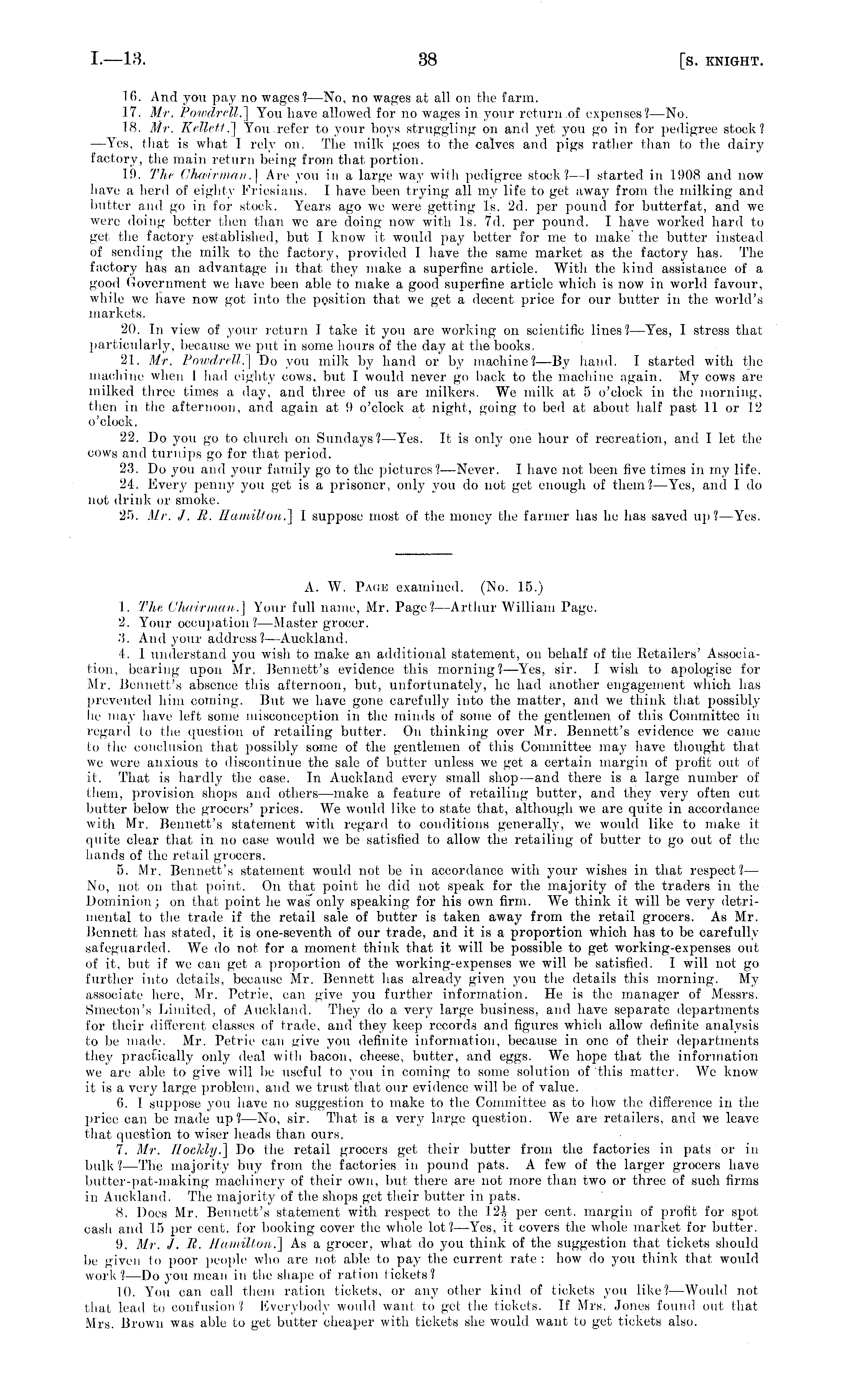 16. And you pay no wages?—No, no wages at all on the farm. 17. Mr. Powdrell.] You have allowed for no wages in your return of expenses?— No. IS. Mr. Kellett.] You refer to your boys struggling on and yet you go in for pedigree stock? —Yes, that is what I rely on. The milk goes to the calves and pigs rather than to the dairy factory, the main return being from that portion. 19. The Chairman . | Are you in a large way with pedigree stock? —1 started in 1908 and now have a herd of eighty Friosians. I have been trying all my life to get away from the milking and butter and go in for stock. Years ago we were getting Is. 2d. per pound for butterfat, and we were doing better then than we are doing now with Is. 7d. per pound. I have worked hard to get the factory established, but I know it would pay better for me to make the butter instead of sending the milk to the factory, provided I have the same market as the factory has. The factory has an advantage in that they make a superfine article. With the kind assistance of a good Government we have been able to make a good superfine article which is now in worltl favour, while we have now got into the position that we get a decent price for our butter in the world's markets. 20. in view of your return I take it you are working on scientific lines? —Yes, I stress that particularly, because we put in some hours of the day at the books, 21. Mr. Powdrell.] Do you milk by hand or by machine? —By hand. I started with the machine when I had eighty cows, but I would never go back to the machine again. My cows are milked three times a day, and three of us are milkers. We milk at 5 o'clock in the morning, then in the afternoon, and again at 9 o'clock at night, going to bed at about half past 11 or 12 o'clock. 22. Do you go to church on Sundays?— Yes. It is only one hour of recreation, and I let the cows and turnips go for that period. 23. Do you and your family go to the pictures?— Never. I have not been five times in my life. 24. Every penny you get is a prisoner, only you do not get enough of them?— Yes, and 1 do not drink or smoke. 25. Mr. J. R. Hamilton.] I suppose most of the money the farmer has he has saved up?— Yes. A. W. Page examined. (No. 15.) 1. The Chairman.] Your full name, Mr. Page?— Arthur William Page. 2. Your occupation?— Master grocer. 3. And your address ?—Auckland. 4. I understand you wish to make an additional statement, on behalf of the .Retailers' Association, bearing upon Mr. Bennett's evidence this morning?— Yes, sir. I wish to apologise for Mr. Bennett's absence this afternoon, but, unfortunately, he had another engagement which has prevented him coming. But we have gone carefully into the matter, and we think that possibly he may have left some misconception in the minds of some of the gentlemen of this Committee in regard to the question of retailing butter. On thinking over Mr. Bennett's evidence we came to the conclusion that possibly some of the gentlemen of this Committee may have thought that we were anxious to discontinue the sale of butter unless we get a certain margin of profit out of it. That is hardly the case. In Auckland every small shop—and there is a large number of them, provision shops and others —make a feature of retailing butter, and they very often cut butter below the grocers' prices. We would like to state that, although we are quite in accordance with Mr. Bennett's statement with regard to conditions generally, we would like to make it quite clear that in no case would we be satisfied to allow the retailing of butter to go out of tlahands of the retail grocers. 5. Mr. Bennett's statement would not be in accordance with your wishes in that respect?— No, not on that point. On that point he did not speak for the majority of the traders in the Dominion; on that point he was'only speaking for his own firm. We think it will be very detrimental to the trade if the retail sale of butter is taken away from the retail grocers. As Mr. Bennett has stated, it is one-seventh of our trade, and it is a proportion which has to be carefully safeguarded. We do not, for a moment think that it will be possible to get working-expenses out of it, but if we can get a proportion of the working-expenses we will be satisfied. I will not go further info details, because Mr, Bennett has already given you the details this morning. My associate here, Mr. Petrie, can give you further information. He is the manager of Messrs. Smeeton's Limited, of Auckland. They do a very large business, and have separate departments for their different classes of trade, and they keep records and figures which allow definite analysis to be made. Mr. Petrie can give you definite information, because in one of their departments they practically only deal with bacon, cheese, butter, and eggs. We hope that the information we are able to give will be useful to you in coming to some solution of this matter. We know it is a very large problem, and we trust that our evidence will be of value. 6. I suppose you have no suggestion to make to the Committee as to how the difference in the price can be made up?—No, sir. That is a very large question. We are retailers, and we leave that question to wiser heads than ours. 7. Mr. Hockly.] Do the retail grocers get their butter from the factories in pals or in bulk? —The majority buy from the factories in pound pats. A few of the larger grocers have butter-pat-making machinery of their own, but there are not more than two or three of such firms in Auckland. The majority of the shops get their butter in pats. 8. Does Mr. Bennett's statement with respect to the 1 2 1 . per cent, margin of profit for spot, cash and 15 per cent, for booking cover the whole lot?— Yes, it covers the whole market for butter. 9. Mr. J. R. Hamilton.] As a grocer, what do you think of the suggestion that tickets should be given to poor people who are not, able to pay the current rate: how do you think that wou