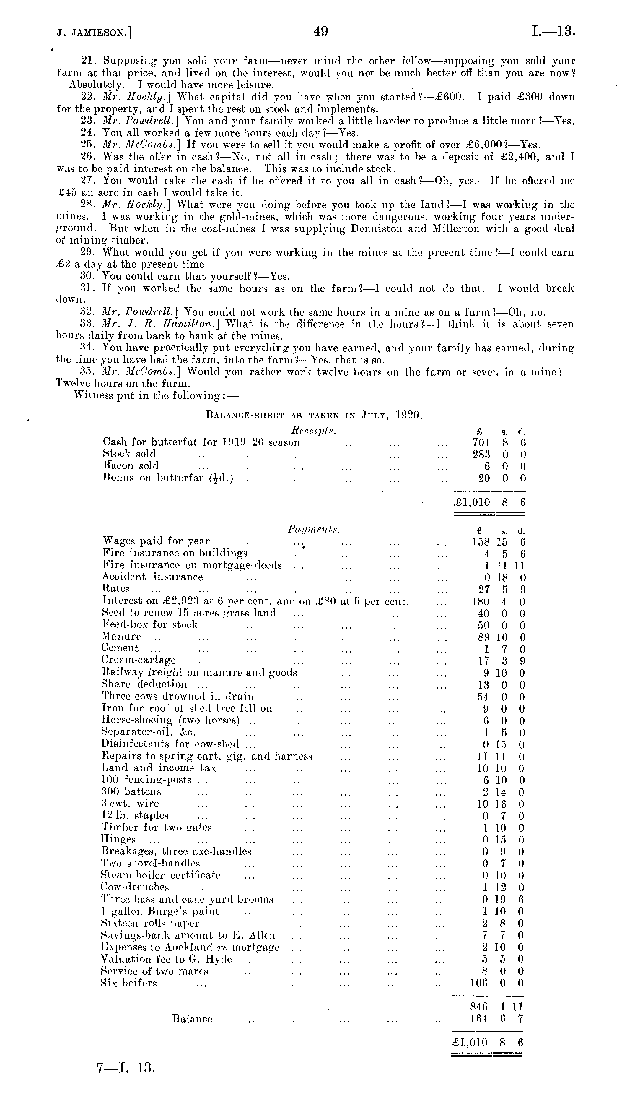 21. Supposing you sold your farm —never mind the other fellow —supposing you sold your farm at that price, and lived on the interest, would you not be much better off than you are now? —Absolutely. I would have more leisure. 22. Mr. Hockly.] What capital did you have when you started?—£6oo. I paid £300 down for the property, and I spent the rest on stock and implements. 23. Mr. Powdrell.] You and your family worked a little harder to produce a little more? —Yes. 24. You all worked a few more hours each day?— Yes. 25. Mr. McCombs.] If you were to sell it you would make a profit of over £6,000? —Yes. 26. Was the offer in cash?—No, not all in cash; there was to be a deposit of £2,400, and I was to be paid interest on the balance. This was to include stock. 27. You would take the cash if he offered it to you all in cash?—Oh, yes. If he offered me £45 an acre in cash I would take it. 28. Mr. Hockly.] What were you doing before you took up the land?—l was working in the mines. I was working in the gold-mines, which was more dangerous, working four years underground. But when in the coal-mines I was supplying Denniston and Millerton with a good deal of mining-timber. 29. What would you get if you were working in the mines at the present time?-—I could earn £2 a day at the present time. 30. You could earn that yourself?— Yes. 31. If you worked the same hours as on the farm?—l could not do that. I would break down. 32. Mr. Powdrell.] You could not work the same hours in a mine as on a farm?—Oh, no. 33. Mr. J. R. Hamilton.] What is the difference in the hours?—l think it is about, seven hours daily from bank to bank at the mines. 34. You have practically put everything you have earned, and your family has earned, during the time you have had the farm, into the farm ?—Yes, that is so. 35. Mr. McCombs.] Would you rather work twelve hours on the farm or seven in a mine?— Twelve hours on the farm. Witness put in the following : — Balance-sheet as taken in July, 1920. Receipts. £ H . d, Cash for butterfat for 1919-20 season ... ... ... 701 8 6 Stock sold ... ... ... ... ... ... 283 0 0 Bacon sold ... ... ... ... ... ... 6 0 0 Bonus on butterfat (Id.) ... ... ... ... ... 20 0 0 £1,010 8 6 Payments. £ a . <]. Wages paid for year ... ... ... ... ... 158 15 6 Fire insurance on buildings ... ... ... ... 4 5 6 Fire insurance on mortgage-deeds ... ... ... ... I 11 11 Accident insurance ... ... ... ... ... 0 18 0 Bates ... ... ... ... ... ... 27 5 9 Interest on £2,923 at 6 per cent, and on £80 at 5 per cent. ... 180 1 0 Seed to renew 15 acres grass land ... ... ... ... 40 0 0 Feed-box for stock ... ... ... ... ... 5000 Manure ... ... ... ... ... ... ... 89 10 0 Cement ... ... ... ... ... .. ... 170 Cream-cartage ... ... ... ... ... ... 17 3 9 Railway freight on manure and goods ... ... ... 9 10 0 Share deduction ... ... ... ... ... ... 13 0 0 Three cows drowned in drain ... ... ... ... 54 0 0 Iron for roof of shed tree fell on ... ... ... ... 9 0 0 Horse-shoeing (two horses) ... ... ... .. ... 6 0 0 Separator-oil, cv.c. ... ... ... ... ... 15 0 Disinfectants for cow-shed ... ... ... ... ... 0 15 0 Repairs to spring cart, gig, and harness ... ... ... 11 11 0 Land and income tax ... ... ... ... ... 10 10 0 100 fencing-posts ... ... ... ... ... ... 6 10 0 300 battens ... ... ... ... ... ... 2 14 0 3 cwt. wire ... ... ... ... ... ... 10 16 0 121b. staples ... ... ... ... ... ... 0 7 0 Timber for two gait's ... ... ... ... ... 1 10 0 Hinges ... ... ... ... ... ... ... 0 15 0 Breakages, three axe-handles ... ... ... ... 0 9 0 Two shovel-handles ... ... ... ... ... 0 7 0 Steam-boiler certificate ... ... ... ... ... 0 10 0 Cow-drenches ... ... ... ... ... ... 1 12 0 Three bass and cane yard-brooms ... ... ... ... 019 6 1 gallon Burge's paint, ... ... ... ... ... 1 10 0 Sixteen rolls paper ... ... ... ... ... 2 8 0 Savings-bank amount to E. Allen ... ... ... ... 770 Expenses to Auckland re mortgage ... ... ... ... 2 10 0 Valuation fee to G. Hyde ... ... ... ... ... 5 5 0 Service of two mares ... ... ... ... ... 8 0 0 Six heifers ... ... ... ... .. ... 106 0 0 846 1 11 Balance ... ... ... ... ... 164 6 7 £1,010 8 6