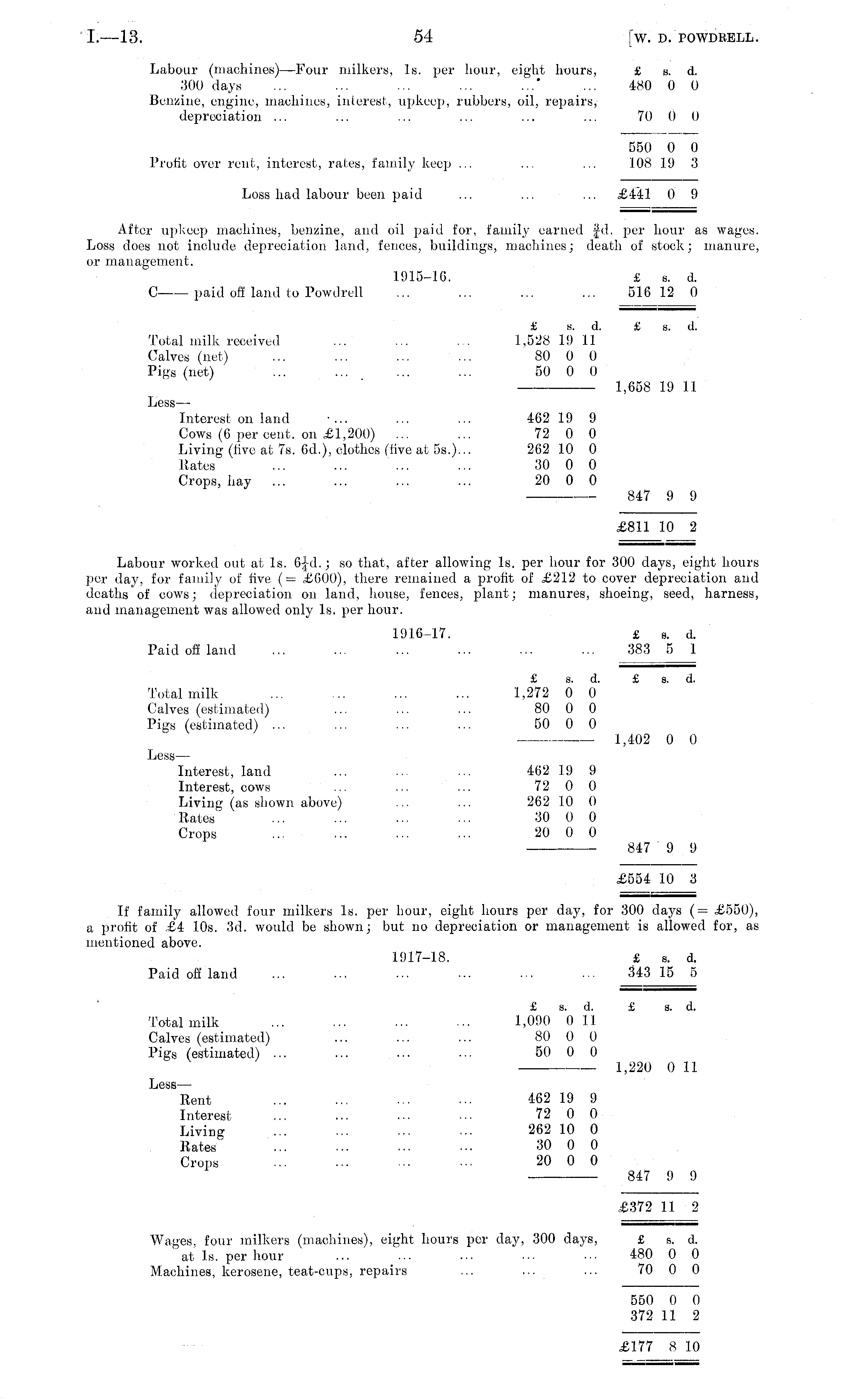 Labour (machines) —Four milkers, Is. per hour, eight hours, £ s. d. 300 days ... ... ... ... ..." ... 480 0 0 Benzine, engine, machines, interest, upkeep, rubbers, oil, repairs, depreciation ... ... ... ... ... ... 70 0 0 550 0 0 Profit over rent, interest, rates, family keep ... ... ... 108 1.9 3 Loss had labour been paid ... ... ... £441 0 9 After upkeep machines, benzine, and oil paid for, family earned fd. per hour as wages. Loss does not include depreciation land, fences, buildings, machines; death of stock; manure, or management. 1915-16. £ s. d. C paid off land to Powdrell ... ... ... ... 516 12 0 £ s. d. £ s. d. Total milk received ... ... ... 1,528 19 11 Calves (net) ... ... ... ' ... 80 0 0 Pigs (net) ' ... ... ... ... 50 0 0 1,658 19 11 Less — Interest on land •... ... ... 462 19 9 Cows (6 per cent, on £1,200) ... ... 72 0 0 Living (five at 7s. 6d.), clothes (five at 55.)... 262 10 0 Rates ... ... ... ... 30 0 0 Crops, hay ... ... ... ... 20 0 0 847 9 9 £811 10 2 Labour worked out at Is. 6|d.; so that, after allowing Is. per hour for 300 days, eight hours per day, for family of five (= £600), there remained a profit of £212 to cover depreciation and deaths of cows; depreciation on land, house, fences, plant; manures, shoeing, seed, harness, and management was allowed only Is. per hour. 1916-17. £ a. d. Paid off land ... ... ... ... ... ... 383 5 1 £ s. d. £ s. d. Total milk ... ... ... ... 1,272 0 0 Calves (estimated) ... ... ... 80 0 0 Pigs (estimated) ... ... ... ... 50 0 0 1,402 0 0 Less — Interest, land ... ... ... 462 19 9 Interest, cows ... ... ... 72 0 0 Living (as shown above) ... ... 262 10 0 Rates ... ... ... ... 30 0 0 Crops ... ... ... ... 20 0 0 847 9 9 £554 10 3 If family allowed four milkers Is. per hour, eight hours per day, for 300 days (= £550), a profit of £4 10s. 3d. would be shown; but no depreciation or management is allowed for, as mentioned above. 1917-18. £ s. d. Paid off land ... ... ... ... ... ... 343 15 5 £ s. d. £ s. d. Total milk 1,090 0 11 Calves (estimated) ... ... ... 80 0 0 Pigs (estimated) ... ... ... ... 50 0 0 1,220 0 II Less— Rent 462 19 9 Interest ... ... ... ■-- 72 0 0 Living ... ... ... ... 262 10 0 Rates ... ... ... ... 30 0 0 Crops -.. 20 0 0 847 9 9 £372 II 2 Wages, four milkers (machines), eight hours per day, 300 days, £ b. d. at Is. per hour ... ... ... ... ■•• 480 0 0 Machines, kerosene, teat-cups, repairs ... ... ... 70 0 0 550 0 0 372 11 2 £177 8 10
