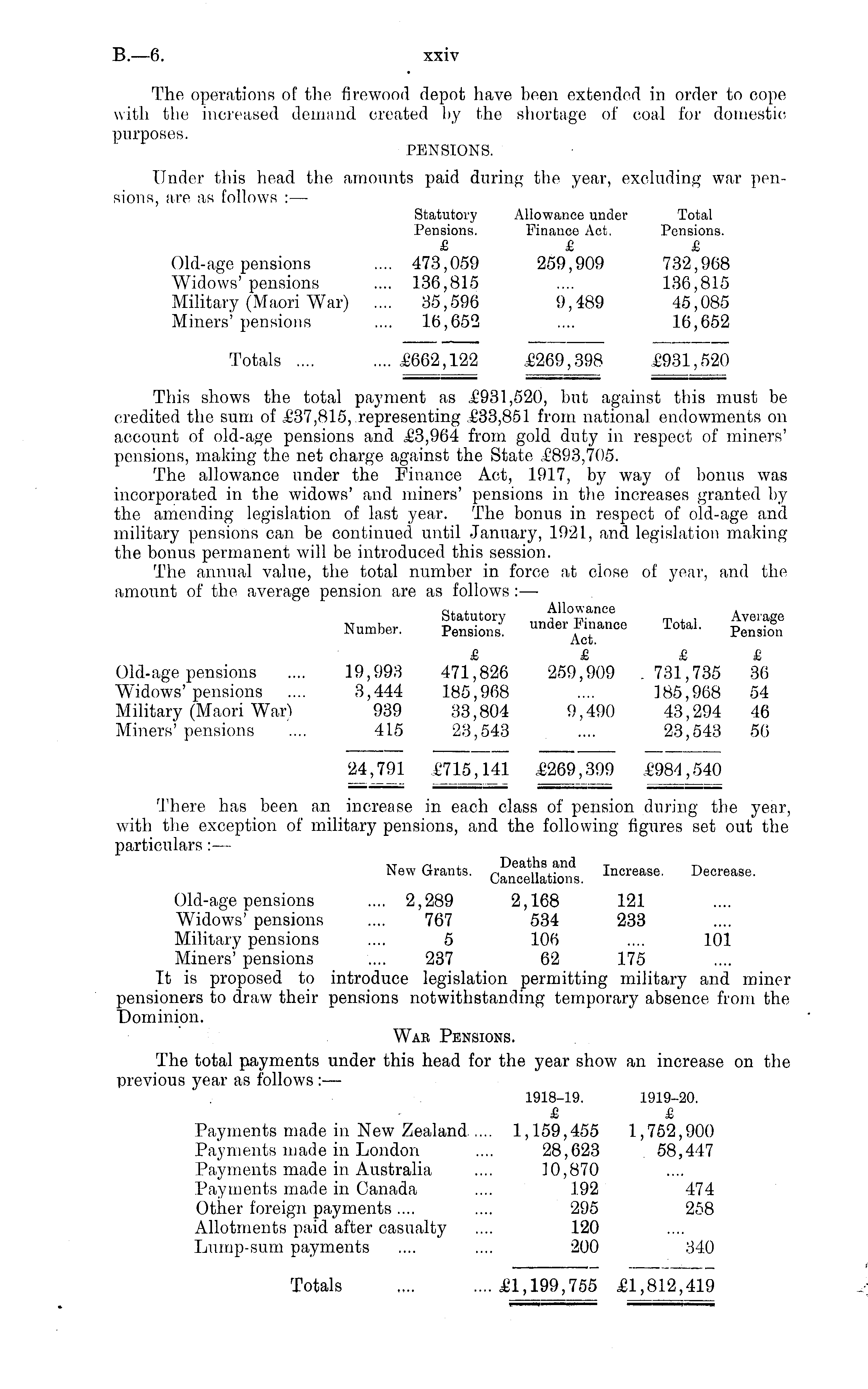 The operations of the firewood depot have been extended in order to cope with the increased demand created by the shortage of coal for domestic purposes. PENSIONS. Under this head the amounts paid during the year, excluding war pensions, are as follows : — Statutory Allowance under Total Pensions. Finance Act. Pensions. £ £ £ Old-age pensions .... 473,059 259,909 732,968 Widows'pensions .... 136,815 .... 136,815 Military (Maori War) .... 35,596 9,489 45,085 Miners' pensions .... 16,652 .... 16,652 Totals .... £662,122 £269,398 £931,520 This shows the total payment as £931,520, but against this must be credited the sum of £37,815, representing £33,851 from national endowments on account of old-age pensions and £3,964 from gold duty in respect of miners' pensions, making the net charge against the State £893,705. The allowance under the Finance Act, 1917, by way of bonus was incorporated in the widows' and miners' pensions in the increases granted by the amending legislation of last year. The bonus in respect of old-age and military pensions can be continued until January, 1921, and legislation making the bonus permanent will be introduced this session. The annual value, the total number in force at close of year, and the amount of the average pension, are as follows : — ______ Allowance A Statutory _ TJV m , , Average Nnmhov t> • under Finance Total. „ -° JNumDer. Pensions. . , Pension £ £ £ £ Old-age pensions .... 19,993 471,826 259,909 .731,735 36 Widows'pensions .... 3,444 185,968 .... 185,968 54 Military (Maori War* 939 33,804 9,490 43,294 46 Miners'pensions .... 415 23,543 .... 23,543 56 24,791 £715,141 £269,399 £984,540 There has been an increase in each class of pension during the year, with the exception of military pensions, and the following figures set out the particulars: — New Grants. n _/,'■ Increase. Decrease. Cancellations. Old-age pensions .... 2,289 2,168 121 Widows' pensions .... 767 534 233 Military pensions .... 5 106 .... 101 Miners' pensions .... 237 62 175 It is proposed to introduce legislation permitting military and miner pensioners to draw their pensions notwithstanding temporary absence from the Dominion. Wae Pensions. The total payments under this head for the year show an increase on the previous year as follows :• — 1918-19. 1919-20. £ £ Payments made in New Zealand 1,159,455 1,752,900 Payments made in London .... 28,623 58,447 Payments made in Australia .... 10,870 Payments made in Canada .... 192 474 Other foreign payments.... .... 295 258 Allotments paid after casualty .... 120 Lump-sum payments .... .... 200 340 Totals .... ....£1,199,755 £1,812,419