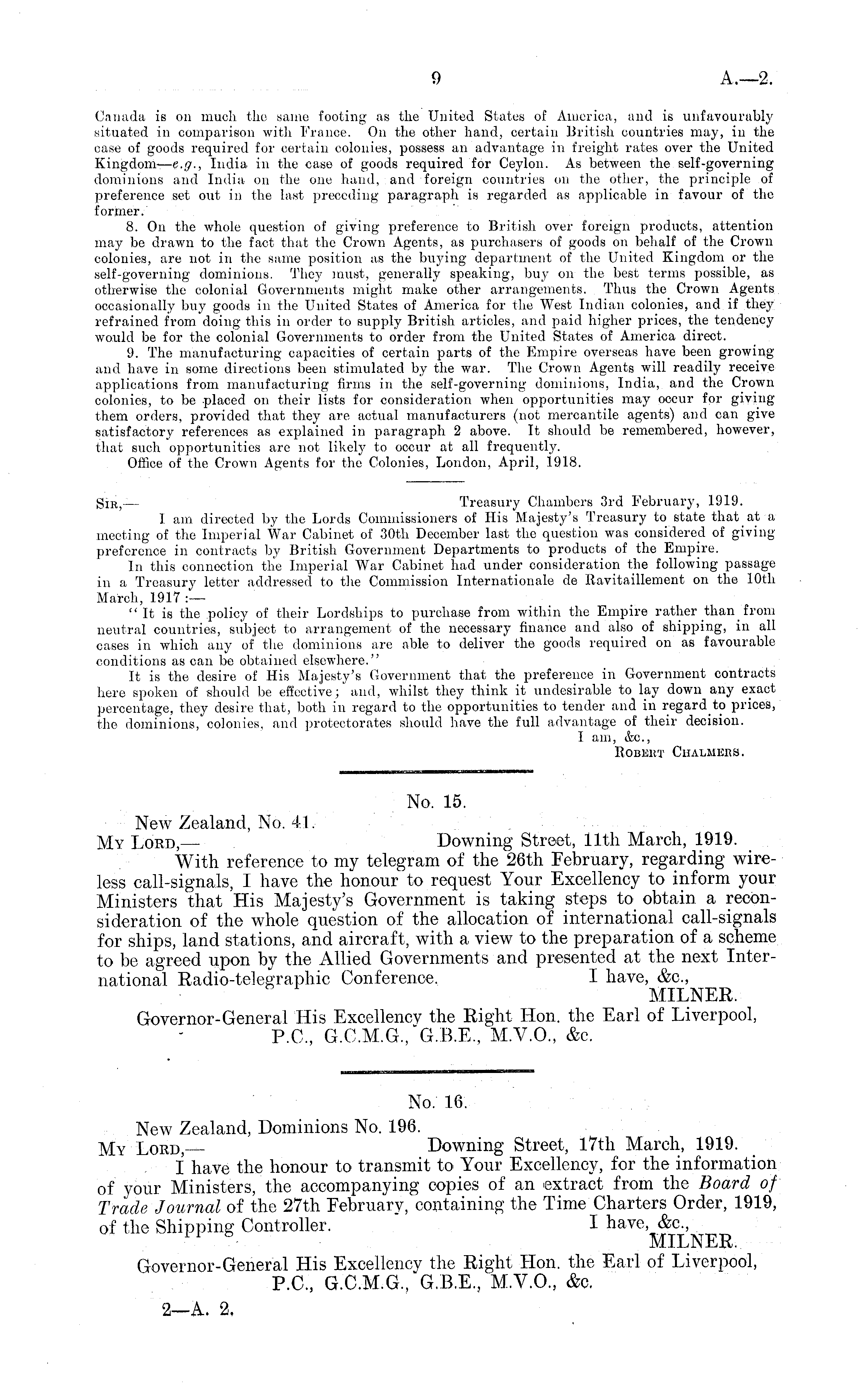 Canada is on much the same footing as the United States of America, and is unfavourably situated in comparison with France. On the other hand, certain British countries may, in the case of goods required for certain colonies, possess an advantage in freight rates over the United Kingdom— e.g., India in the case of goods required for Ceylon. As between the self-governing dominions and India on the one hand, and foreign countries on the other, the principle of preference set out in the last preceding paragraph is regarded as applicable in favour of the former. 8. On the whole question of giving preference to British over foreign products, attention may be drawn to the fact that the Crown Agents, as purchasers of goods on behalf of the Crown colonies, are not in the same position as the buying department of the United Kingdom or the self-governing dominions. They must, generally speaking, buy on the best terms possible, as otherwise the colonial Governments might make other arrangements. Thus the Crown Agents occasionally buy goods in the United States of America for the West Indian colonies, and if they refrained from doing this in order to supply British articles, and paid higher prices, the tendency would be for the colonial Governments to order from the United States of America direct. 9. The manufacturing capacities of certain parts of the Empire overseas have been growing and have in some directions been stimulated by the war. The Crown Agents will readily receive applications from manufacturing firms in the self-governing dominions, India, and the Crown colonies, to be placed on their lists for consideration when opportunities may occur for giving them orders, provided that they are actual manufacturers (not mercantile agents) and can give satisfactory references as explained in paragraph 2 above. It should be remembered, however, that such opportunities are not likely to occur at all frequently. Office of the Crown Agents for the Colonies, London, April, 1918. Sir, — Treasury Chambers 3rd February, 1919. I am directed by the Lords Commissioners of His Majesty's Treasury to state that at a meeting of the Imperial War Cabinet of 30th December last the question was considered of giving preference in contracts by British Government Departments to products of the Empire. In this connection the Imperial War Cabinet had under consideration the following passage in a Treasury letter addressed to the Commission Internationale de Ravitaillement on the 10th March, 1917 :— "It is the policy of their Lordships to purchase from within the Empire rather than from neutral countries, subject to arrangement of the necessary finance and also of shipping, in all cases in which any of the dominions are able to deliver the goods required on as favourable conditions as can be obtained elsewhere." It is the desire of His Majesty's Government that the preference in Government contracts here spoken of should be effective;" and, whilst they think it undesirable to lay down any exact percentage, they desire that, both in regard to the opportunities to tender and in regardto prices, the dominions, colonies, and protectorates should have the full advantage of their decision. I am, &c, Robert Chalmers.
