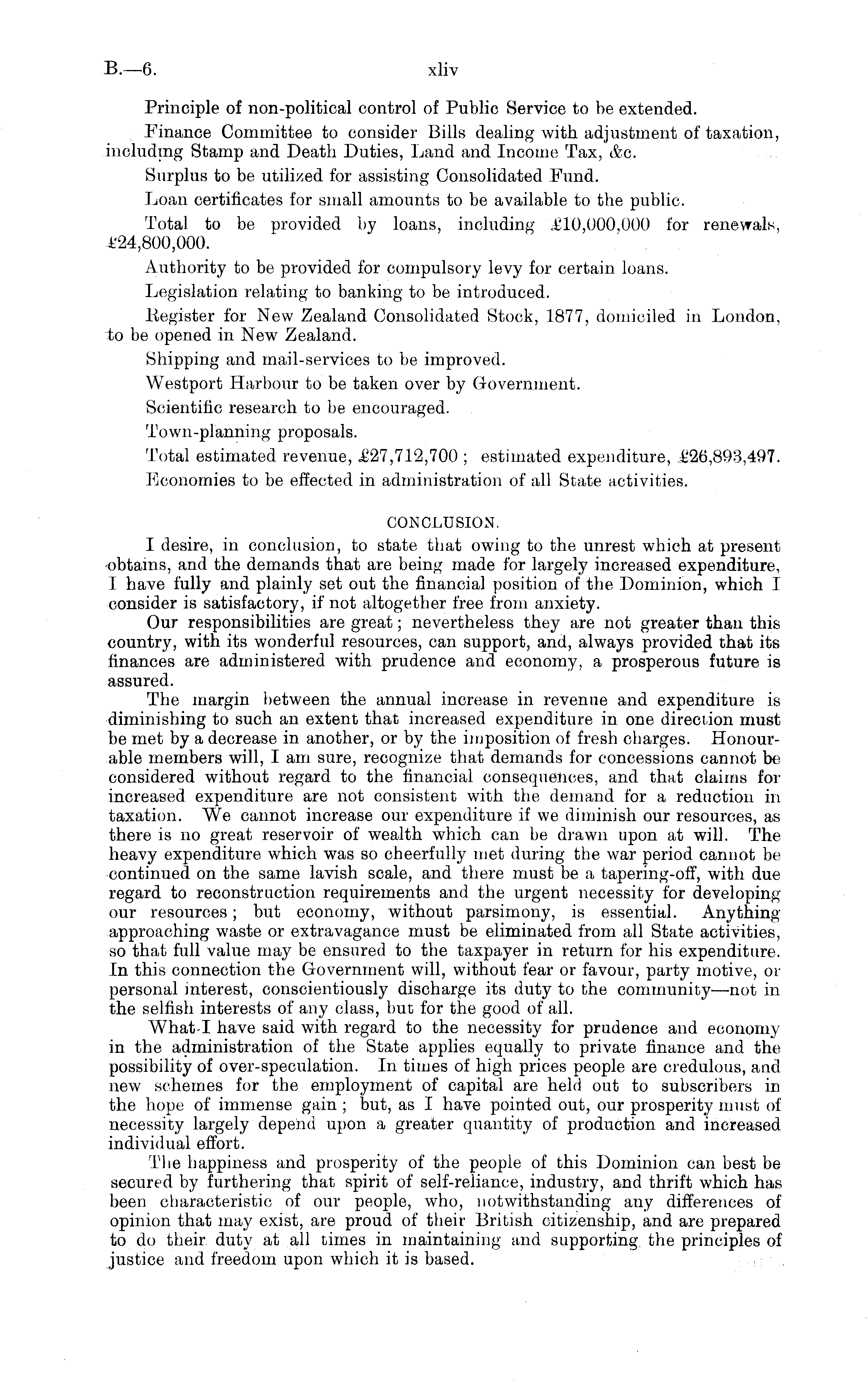 Principle of non-political control of Public Service to be extended. Finance Committee to consider Bills dealing with adjustment of taxation, including Stamp and Death Duties, Land and Income Tax, &c. Surplus to be utilized for assisting Consolidated Fund. Loan certificates for small amounts to be available to the public. Total to be provided by loans, including £10,000,000 for renewals, £24,800,000. Authority to be provided for compulsory levy for certain loans. Legislation relating to banking to be introduced. Register for New Zealand Consolidated Stock, 1877, domiciled in London, to be opened in New Zealand. Shipping and mail-services to be improved. Westport Harbour to be taken over by Government. Scientific research to be encouraged. Town-planning proposals. Total estimated revenue, £27,712,700 ; estimated expenditure, £26,893,497. Economies to be effected in administration of all State activities. CONCLUSION. I desire, in conclusion, to state that owing to the unrest which at present •obtains, and the demands that are being made for largely increased expenditure, I have fully and plainly set out the financial position of the Dominion, which I consider is satisfactory, if not altogether free from anxiety. Our responsibilities are great; nevertheless they are not greater than this country, with its wonderful resources, can support, and, always provided that its finances are administered with prudence and economy, a prosperous future is assured. The margin between the annual increase in revenue and expenditure is diminishing to such an extent that increased expenditure in one direction must be met by a decrease in another, or by the imposition of fresh charges. Honourable members will, I am sure, recognize that demands for concessions cannot be considered without regard to the financial consequences, and that claims for increased expenditure are not consistent with the demand for a reduction in taxation. We cannot increase our expenditure if we diminish our resources, as there is no great reservoir of wealth which can be drawn upon at will. The heavy expenditure which was so cheerfully met during the war period cannot be continued on the same lavish scale, and there must be a tapering-off, with due regard to reconstruction requirements and the urgent necessity for developing our resources; but economy, without parsimony, is essential. Anything approaching waste or extravagance must be eliminated from all State activities, so that full value may be ensured to the taxpayer in return for his expenditure. In this connection the Government will, without fear or favour, party motive, or personal interest, conscientiously discharge its duty to the community—not in the selfish interests of any class, but for the good of all. What-I have said with regard to the necessity for prudence and economy in the administration of the State applies equally to private finance and the possibility of over-speculation. In times of high prices people are credulous, and new schemes for the employment of capital are held out to subscribers in the hope of immense gain ; but, as I have pointed out, our prosperity must of necessity largely depend upon a greater quantity of production and increased individual effort. The happiness and prosperity of the people of this Dominion can best be secured by furthering that spirit of self-reliance, industry, and thrift which has been characteristic of our people, who, notwithstanding any differences of opinion that may exist, are proud of their British citizenship, and are prepared to do their duty at all times in maintaining and supporting the principles of justice and freedom upon which it is based. .; ■,;■; ,