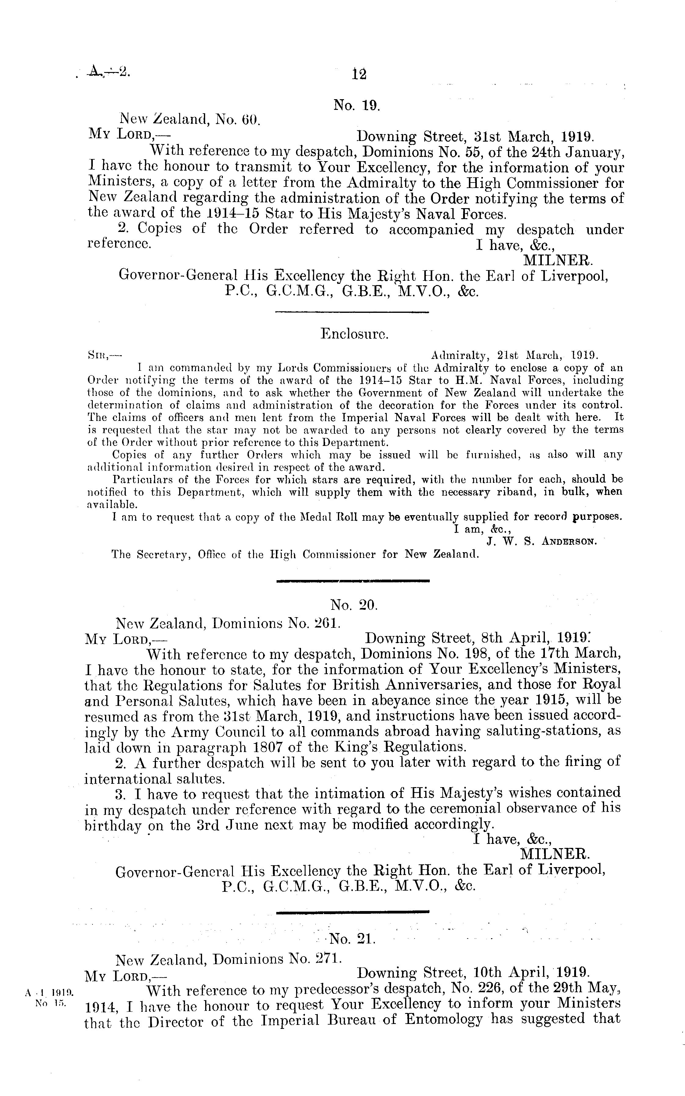 No. 19. New Zealand, No. 60. My Lord,— Downing Street, 31st March, 1919. With reference to my despatch, Dominions No. 55, of the 24th January, I have the honour to transmit to Your Excellency, for the information of your Ministers, a copy of a letter from the Admiralty to the High Commissioner for New Zealand regarding the administration of the Order notifying the terms of the award of the 1914-15 Star to His Majesty's Naval Forces. 2. Copies of the Order referred to accompanied my despatch under reference. I have, &c, MILNER. Governor-General His Excellency the Right Hon. the Earl of Liverpool, P.C, G.C.M.G, G.B.E, M.V.O, c%c.