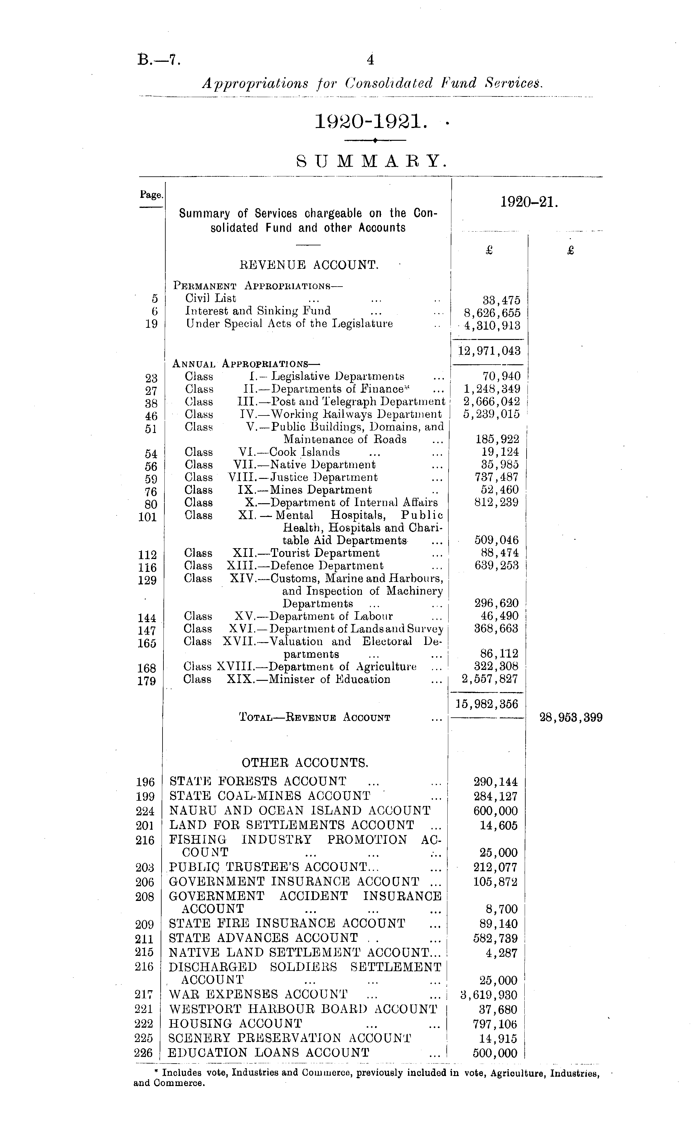 Page. 192' 1-21. Summary of Services chargeable on the Consolidated Fund and other Accounts REVENUE ACCOUNT. ■ £ £ 5 6 19 Permanent Appropriations— Civil List Interest and Sinking Fund Under Special Acts of the Legislature 33,475 8,626,655 4,310,913 23 27 38 46 51 54 56 59 76 80 101 Annual Appropriations— Class I.—Legislative Departments Class IT.—Departments of Finance 1 '' Class III.—Post and Telegraph Department Class IV.—Working Railways Department Class V.—Public Buildings, Domains, and Maintenance of Roads Class VI. —Cook Islands Class VII.—Native Department Class VIII.—Justice Department Class IX.—Mines Department Class X. —Department of Internal Affairs Class XL — Mental Hospitals, Public Health, Hospitals and Charitable Aid Departments Class XII.—Tourist Department Class XIII.—Defence Department Class XIV.—Customs, Marine and Harbours, and Inspection of Machinery Departments Class XV.—Department of Labour Class XVI.— Department of Lands and Survey Class XVII.—Valuation and Electoral Departments Ciass XVIII.—Department of Agriculture Class XIX.—Minister of Education 12,971,043 70,940 1,248,349 2,666,042 5,239,015 185,922 19,124 35,985 737,487 52,460 812,239 112 116 129 509,046 88,474 639,253 144 147 165 296,620 46,490 368,663 168 179 Total—Revenue Account OTHER ACCOUNTS, 15,982,356 86,112 322,308 2,557,827 28,953,399 196 199 224 STATE FORESTS ACCOUNT STATE COAL-MINES ACCOUNT 290,144 284,127 600,000 NAURU AND OCEAN ISLAND ACCOUNT LAND FOE SETTLEMENTS ACCOUNT ... 201 14,605 216 FISHING INDUSTRY PROMOTION ACCOUNT 25,000 203 PUBLIC TRUSTEE'S ACCOUNT... GOVERNMENT INSURANCE ACCOUNT ... GOVERNMENT ACCIDENT INSURANCE ACCOUNT STATE FIRE INSURANCE ACCOUNT 212,077 206 105,872 208 8,700 89,140 >ure, Industries, 209 211 215 STATE ADVANCES ACCOUNT NATIVE LAND SETTLEMENT ACCOUNT... DISCHARGED SOLDIERS SETTLEMENT ACCOUNT WAR EXPENSES ACCOUNT ... WESTPORT HARBOUR BOARD ACCOUNT HOUSING ACCOUNT SCENERY PRESERVATION ACCOUNT | EDUCATION LOANS ACCOUNT 582,739 4,287 216 I 25,000 3,619,930 37,680 797,106 14,915 500,000 217 221 222 225 226 . Includes vote, Industries and Cominorco, previously included lommerce. in vote, Agrioull and (
