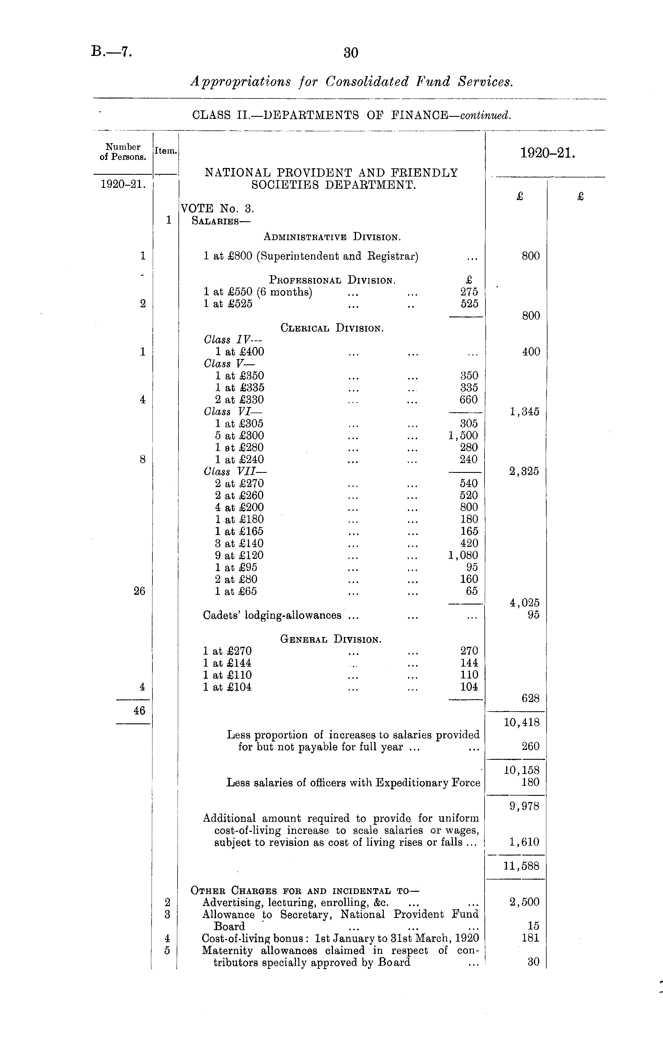 Number if Persons. Item. 192 1-21. NATIONAL PROVIDENT AND FRIENDLY SOCIETIES DEPARTMENT. 1920-21. VOTE No. 3. Salaries— £ Administrative Division. 1 at £800 (Superintendent and Registrar) 800 1 2 Professional Division. £ 1 at £550 (6 months) ... ... 275 1 at £525 ... .. 525 800 Clerical Division. Class IV— 1 at £400 Glass V— 1 at £350 ... ... 350 1 at £335 ... ... 335 2 at £330 ... ... 660 Glass VI— 1 at £305 ... ... 305 5 at £300 ... ... 1,500 1 at £280 ... ... 280 1 at £240 ... ... 240 Class VII— 2 at £270 ... ... 540 2 at £260 ... ... 520 4 at £200 ... ... 800 1 at £180 ... ... 180 1 at £165 ... ... 165 3 at £140 ... ... 420 9 at £120 ... ... 1,080 lat£95 ... ... 95 2 at £80 ... ... 160 lat£65 ... ... 65 400 4 1,345 2,325 26 Cadets' lodging-allowances ... 4,025 95 General Division. 1 at £270 ... ... 270 1 at £144 ... ... 144 1 at £110 ... ... 110 1 at £104 ... ... 104 4 628 46 Less proportion of increases to salaries provided for but not payable for full year ... 10,418 260 Less salaries of officers with Expeditionary Force 10,158 180 Additional amount required to provide for uniform cost-of-living increase to scale salaries or wages, subject to revision as cost of living rises or falls ... 9,978 1,610 11,588 2 3 Other Charges for and incidental to — Advertising, lecturing, enrolling, &c. Allowance to Secretary, National Provident Fund Board Cost-of-living bonus : 1st January to 31st March, 1920 Maternity allowances claimed in respect of contributors specially approved by Board 2,500 15 181 4 5 30