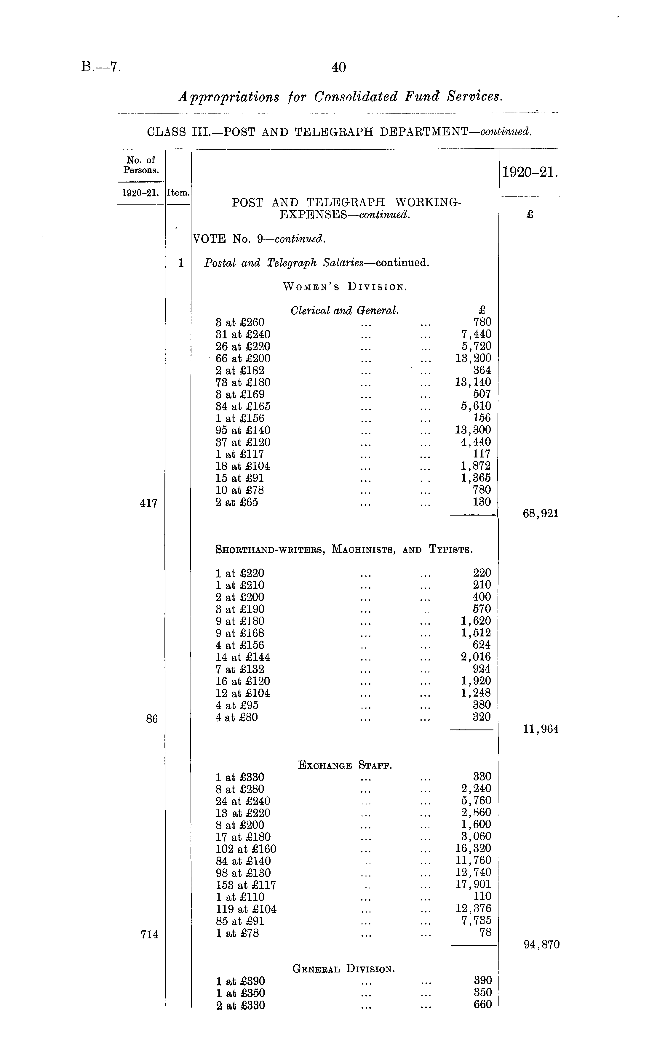 No. of Persons. 1920-21. 920-21. Itom. POST AND TELEGRAPH WORKINGEXPENSES— continued. £ VOTE No. 9—continued. Postal and Telegraph Salaries —continued. Women's Division. Clerical and General. £ 3 at £260 ... ... 780 31 at £240 ... ... 7,440 26 at £220 ... ... 5,720 66 at £200 ... ... 13,200 2 at £182 ... ' ... 364 73 at £180 ... ... 13,140 3 at £169 ... ... 507 34 at £165 ... ... 5,610 1 at £156 ... ... 156 95 at £140 ... ... 13,300 37 at £120 ... ... 4,440 1 at £117 ... ... 117 18 at £104 ... ... 1,872 15 at £91 ... .. 1,365 10 at £78 ... ... 780 2 at £65 ... ... 130 417 68,921 Shorthand- writers, Machinists, and Typists. 1 at £220 ... ... 220 1 at £210 ... ... 210 2 at £200 ... ... 400 3 at £190 ... . 570 9 at £180 ... ... 1,620 9 at £168 ... ... 1,512 4 at £156 .. ... 624 14 at £144 ... ... 2,016 7 at £132 ... ... 924 16 at £120 ... ... 1,920 12 at £104 ... ... 1,248 4 at £95 ... ... 380 4 at £80 ... ... 320 86 11,964 Exchange Staff. 1 at £330 ... ... 330 8 at £280 ... ... 2,240 24 at £240 ... ... 5,760 13 at £220 ... ... 2,860 8 at £200 ... ... 1,600 17 at £180 ... ... 3,060 102 at £160 ... ... 16,320 84 at £140 .. ... 11,760 98 at £130 ... ... 12,740 153 at £117 ... .. 17,901 1 at £110 ... ... 110 119 at £104 ... ... 12,376 85 at £91 ... ... 7,735 1 at £78 ... ... 78 714 94,87' General Division. 1 at £390 ... ... 390 1 at £350 ... ... 350 2 at £330 ... ... 660