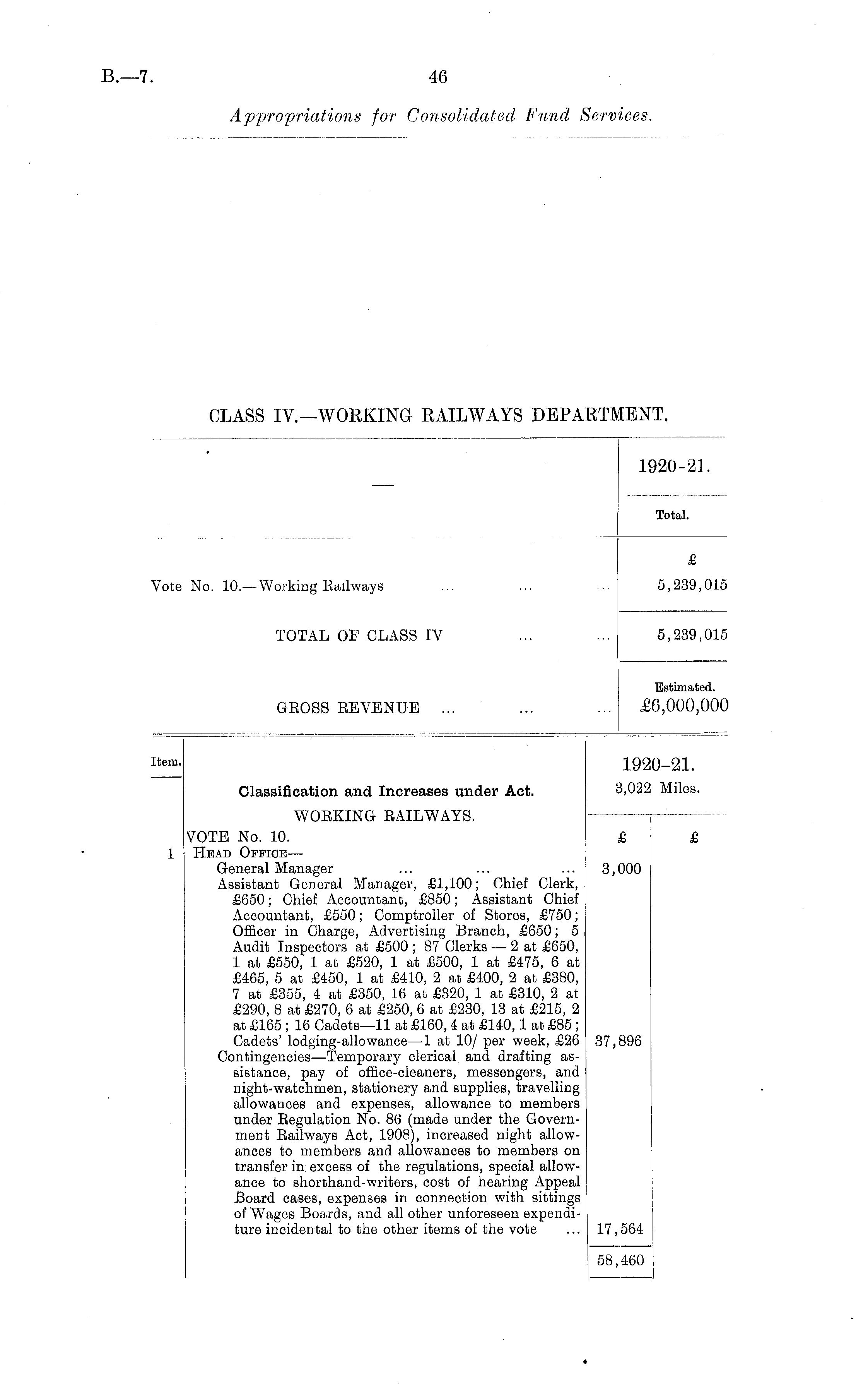 1920-21. Total. 'ote No. 10.—Working Railways £ 5,239,015 TOTAL OF CLASS IV 5,239,015 GROSS REVENUE ... Estimated. £6,000,000 Item. Classification and Increases under Act. 19! 10-21. 3,02: I Miles. WORKING RAILWAYS. VOTE No. 10. Head Office — General Manager Assistant General Manager, £1,100; Chief Clerk, £650; Chief Accountant, £850; Assistant Chief Accountant, £550; Comptroller of Stores, £750; Officer in Charge, Advertising Branch, £650; 5 Audit Inspectors at £500 ; 87 Clerks — 2 at £650, 1 at £550, 1 at £520, 1 at £500, 1 at £475, 6 at £465, 5 at £450, 1 at £410, 2 at £400, 2 at £380, 7 at £355, 4 at £350, 16 at £320, 1 at £310, 2 at £290, 8 at £270, 6 at £250, 6 at £230, 13 at £215, 2 at £165 ; 16 Cadets—11 at £160, 4 at £140,1 at £85 ; Cadets' lodging-allowance —1 at 10/ per week, £26 Contingencies—Temporary clerical and drafting assistance, pay of office-cleaners, messengers, and night-watchmen, stationery and supplies, travelling allowances and expenses, allowance to members under Regulation No. 86 (made under the Government Railways Act, 1908), increased night allowances to members and allowances to members on transfer in excess of the regulations, special allowance to shorthand-writers, cost of hearing Appeal Board cases, expenses in connection with sittings of Wages Boards, and all other unforeseen expenditure incidental to the other items of the vote £ 3,000 37,896 17,564 58,460