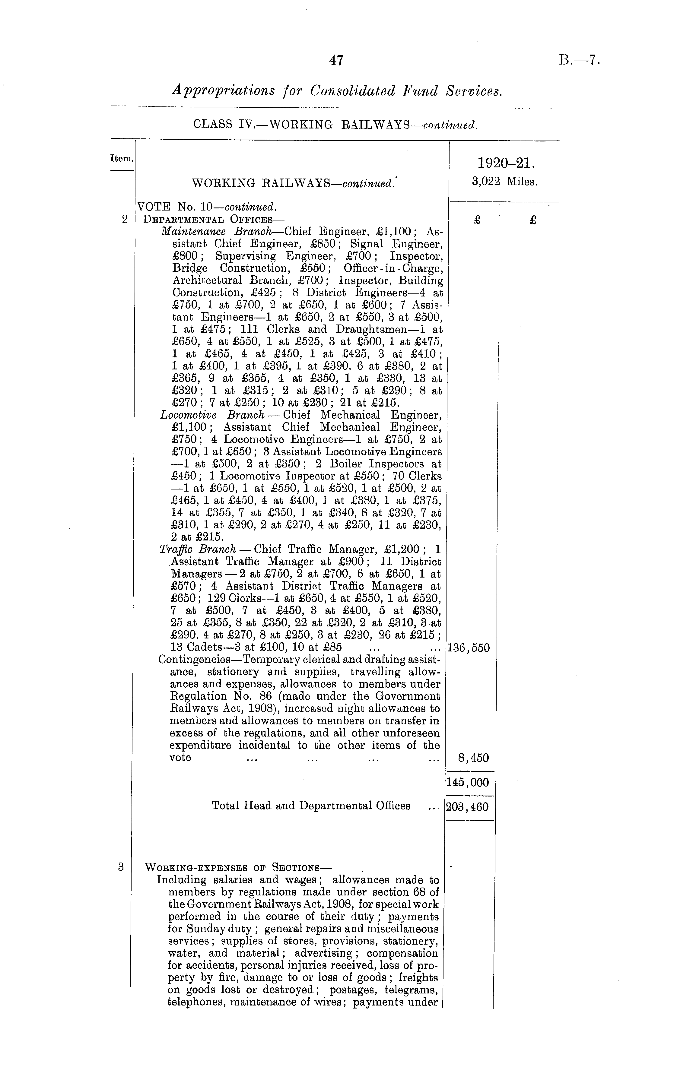 item. 19' 10-21. WORKING RAILWAYS—continued.' 3,02 Miles. VOTE No. 10— continued. Departmental Offices — Maintenance Branch —Chief Engineer, £1,100; Assistant Chief Engineer, £850; Signal Engineer, £800; Supervising Engineer, £700; Inspector, Bridge Construction, £550; Officer-in-Charge, Architectural Branch, £700; Inspector, Building Construction, £425 ; 8 District Engineers—4 at £750, 1 at £700, 2 at £650, 1 at £600; 7 Assistant Engineers—1 at £650, 2 at £550, 3 at £500, 1 at £475; 111 Clerks and Draughtsmen—1 at £650, 4 at £550, 1 at £525, 3 at £500, 1 at £475, 1 at £465, 4 at £450, 1 at £425, 3 at £410; 1 at £400, 1 at £395, 1 at £390, 6 at £380, 2 at £365, 9 at £355, 4 at £350, 1 at £330, 13 at £320; 1 at £315; 2 at £310; 5 at £290; 8 at £270 ; 7 at £250 ; 10 at £230 ; 21 at £215. Locomotive Branch — Chief Mechanical Engineer, £1,100; Assistant Chief Mechanical Engineer, £750; 4 Locomotive Engineers—1 at £750, 2 at £700, 1 at £650; 3 Assistant Locomotive Engineers —1 at £500, 2 at £350 ; 2 Boiler Inspectors at £150; 1 Locomotive Inspector at £550 ; 70 Clerks —1 at £650, 1 at £550, 1 at £520, 1 at £500, 2 at £465, 1 at £450, 4 at £400, 1 at £380, 1 at £375, 14 at £355, 7 at £350, 1 at £340, 8 at £320, 7 at £310, 1 at £290, 2 at £270, 4 at £250, 11 at £230, 2 at £215. Traffic Branch — Chief Traffic Manager, £1,200; 1 Assistant Traffic Manager at £900; 11 District Managers —2 at £750, 2 at £700, 6 at £650, 1 at £570; 4 Assistant District Traffic Managers at £650; 129 Clerks—1 at £650, 4 at £550, 1 at £520, 7 at £500, 7 at £450, 3 at £400, 5 at £380, 25 at £355, 8 at £350, 22 at £320, 2 at £310, 3 at £290, 4 at £270, 8 at £250, 3 at £230, 26 at £215 ; 13 Cadets—3 at £100, 10 at £85 Contingencies —Temporary clerical and drafting assistance, stationery and supplies, travelling allowances and expenses, allowances to members under Regulation No. 86 (made under the Government Railways Act, 1908), increased night allowances to members and allowances to members on transfer in excess of the regulations, and all other unforeseen expenditure incidental to the other items of the vote £ £ 136,550 8,450 Total Head and Departmental Offices 145,000 203,460 Working-expenses of Sections— Including salaries and wages; allowances made to members by regulations made under section 68 of the Government Railways Act, 1908, for special work performed in the course of their duty ; payments for Sunday duty ; general repairs and miscellaneous services; supplies of stores, provisions, stationery, water, and material; advertising; compensation for accidents, personal injuries received, loss of property by fire, damage to or loss of goods; freights on goods lost or destroyed; postages, telegrams, telephones, maintenance of wires; payments under |