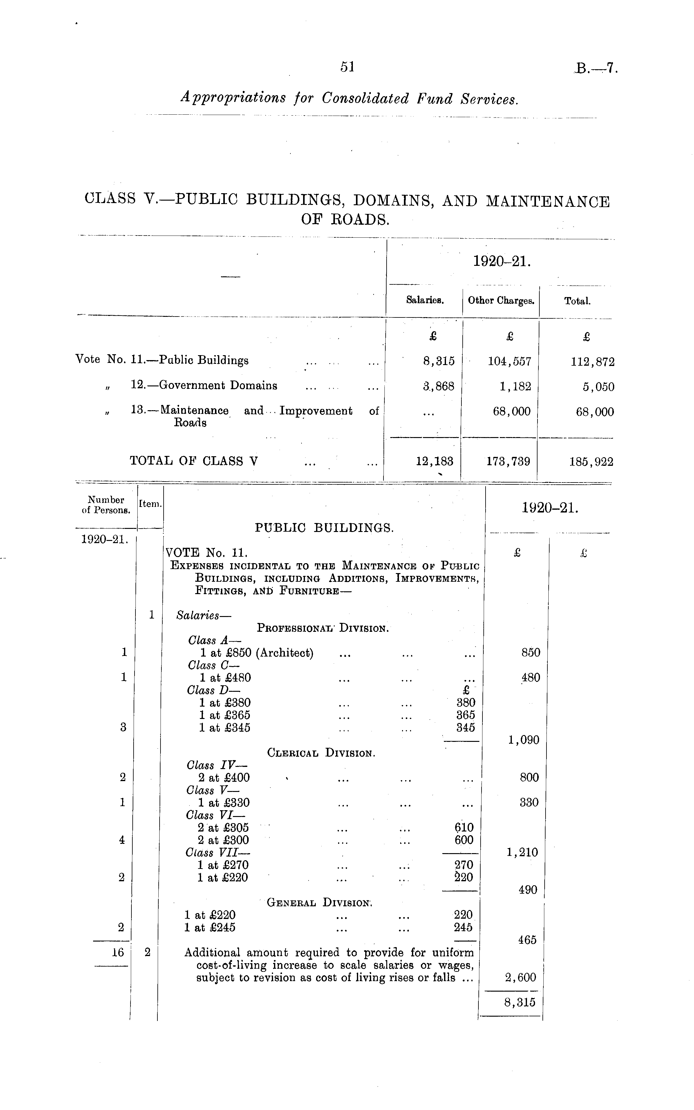 1920-21. Salaries. Other Charges. Total. £ £ £ ote No. 11. —Public Buildings 8,315 104,557 112,87 12.—Government Domains 3,868 1,182 5,05' „ 13.—Maintenance and Improvement Roads of 68,000 68,001 TOTAL OF CLASS V 12,183 173,739 185,922 _l Number of Persons. Item. 19 1-21. PUBLIC BUILDINGS. 1920-21. VOTE No. 11. Expenses incidental to the Maintenance ok Public Buildings, including Additions, Improvements, Fittings, and Furniture— £ £ Salaries — Professional Division. 1 1 Class A — 1 at £850 (Architect) Class C— 1 at £480 Class D— £ 1 at £380 ... ... 380 1 at £365 ... ... 365 1 at £345 ... ... 345 850 480 1,090 Clerical Division. 2 I Class IV— 2 at £400 Glass V— 1 at £330 Class VI— 2 at £305 ... ... 610 2 at £300 ... ... 600 Class VII— 1 at £270 ... ... 270 1 at £220 ... ... 220 800 330 4 1,210 2 490 General Division. 1 at £220 ... ... 220 1 at £245 ... ... 245 465 2 16 I Additional amount required to provide for uniform cost-of-living increase to scale salaries or wages, subject to revision as cost of living rises or falls ... 2,600