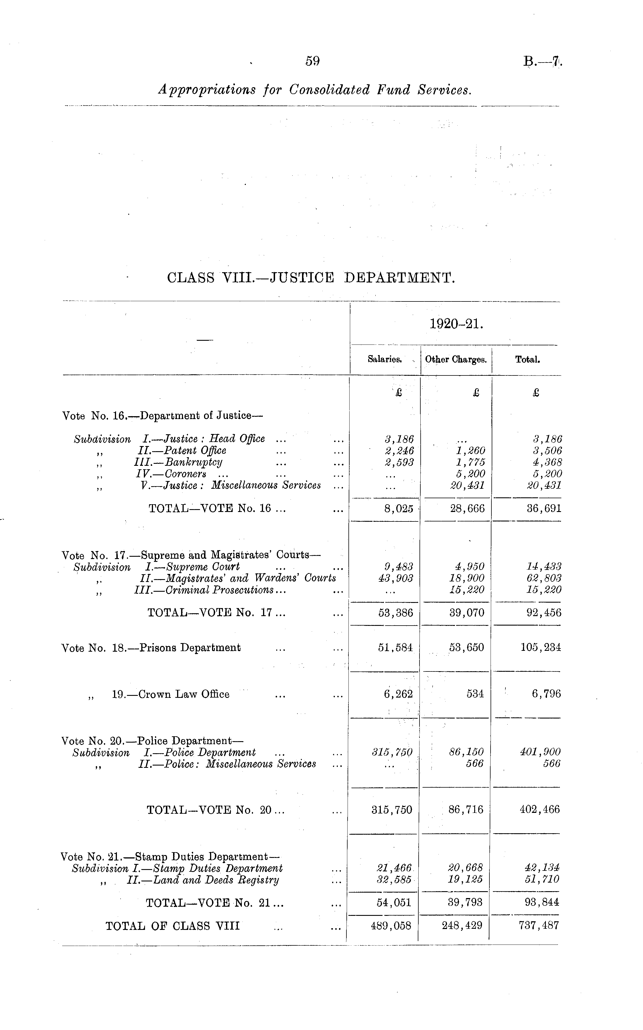 Salaries, 1920-21. Other Charges. Total. £ £ £ Vote No. 16.—Department of Justice— 1,260 1,775 5,200 20,431 3,186 3,506 4,368 5,200 20,431 Subdivision I. — Justice : Head Office ... ,, II. — Patent Office III. — Bankruptcy IV. — Coroners ... V. — Justice: Miscellaneous Services 3,186 2,246 2,593 TOTAL—VOTE No. 16 ... 8,025 28,666 36,691 Vote No. 17. —Supreme and Magistrates' Courts— Subdivision I. — -Supreme Court ,. II. — Magistrates' and Wardens' Courts ,, III. — Criminal Prosecutions... 9,483 43,903 4,950 18,900 15,220 14,433 62,803 15,220 TOTAL—VOTE No. 17... 53,386 39,070 92,456 Vote No. 18.—Prisons Department 51,584 53,650 105,234 ,, 19.—Crown Law Office 6,262 534 6,796 Vote No. 20.—Police Department— Subdivision I. — Police Department ,, II. — Police: Miscellaneous Services 315,750 86,150 566 401,900 566 TOTAL-VOTE No. 20... 315,750 86,716 402,466 Vote No. 21.—Stamp Duties Department — Subdivision I. — Stamp Duties Department ,, II. — Land and Deeds Registry 21,466 32,585 20,668 19,125 42,134 51,710 TOTAL—VOTE No. 21... 54,051 39,793 93,844 TOTAL OF CLASS VIII 489,058 248,429 737,487