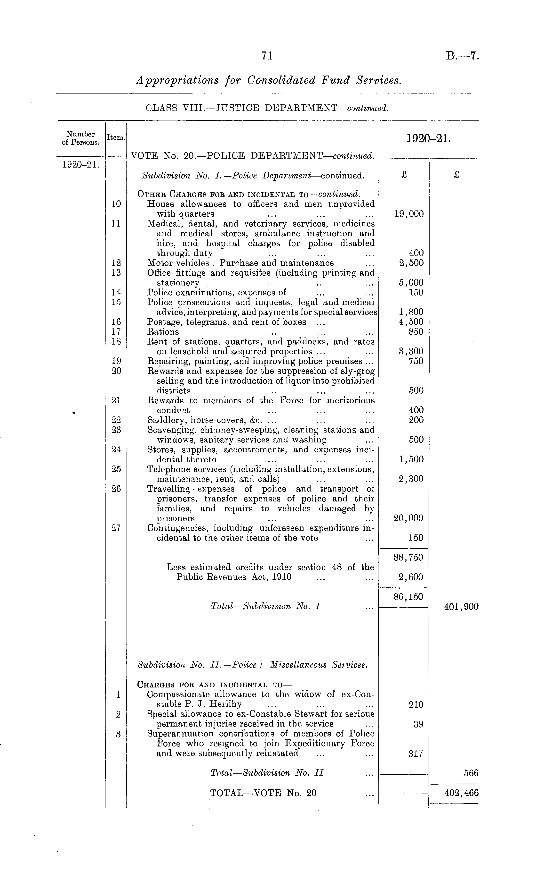 Number if Persons. Item. 1920-21. VOTE No. 20.—POLICE DEPARTMENT— continued. 920-21. Subdivision No. I. — Police Department —continued. £ 10 11 12 13 14 15 16 17 18 19 20 Other Charges for and incidental to — continued. House allowances to officers and men unprovided with quarters Medical, dental, and veterinary services, medicines and medical stores, ambulance instruction and hire, and hospital charges for police disabled through duty Motor vehicles : Purchase and maintenance Office fittings and requisites (including printing and stationery Police examinations, expenses of Police prosecutions and inquests, legal and medical advice, interpreting, and payments for special services Postage, telegrams, and rent of boxes ... Rations Rent of stations, quarters, and paddocks, and rates on leasehold and acquired properties ... . ... Repairing, painting, and improving police premises ... Rewards and expenses for the suppression of sly-grog selling and the introduction of liquor into prohibited districts Rewards to members of the Force for meritorious condrct Saddlery, horse-covers, &c. ... Scavenging, chimney-sweeping, cleaning stations and windows, sanitary services and washing Stores, supplies, accoutrements, and expenses incidental thereto Telephone services (including installation, extensions, maintenance, rent, and calls) Travelling - expenses of police and transport of prisoners, transfer expenses of police and their families, and repairs to vehicles damaged by prisoners Contingencies, including unforeseen expenditure incidental to the other items of the vote 19,000 400 2,500 5,000 150 1,800 4,500 850 3,300 750 500 21 400 200 22 23 500 24 25 1,500 26 2,300 20,000 27 150 Less estimated credits under section 48 of the Public Revenues Act, 1910 88,750 2,600 Total — Subdivision No. I 86,150 401,900 Subdivision No. II. —Police : Miscellaneous Services. 1 2 Charges for and incidental to — Compassionate allowance to the widow of ex-Con-stable P. J. Herlihy Special allowance to ex-Constable Stewart for serious permanent injuries received in the service Superannuation contributions of members of Police Force who resigned to join Expeditionary Force and were subsequently reinstated 210 39 566 3 317 Total — Subdivision No. II TOTAL—VOTE No. 20 402,466
