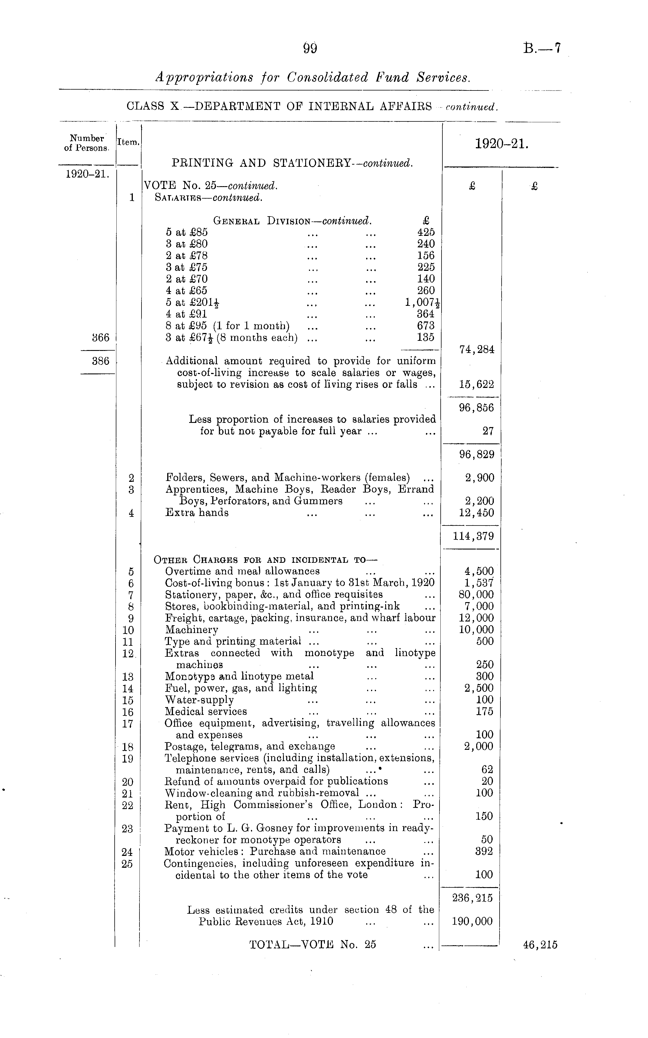 Number Tfcem . of Persons. 1920-21. PRINTING AND STATIONERY— continued. 192 1-21. 1 VOTE No. 25— continued. Salaries— continued. 366 General Division — continued. £ 5 at £85 ... ... 425 3 at £80 ... ... 240 2 at £78 ... ... 156 3 at £75 ... ... 225 2 at £70 ... ... 140 4 at £65 ... ... 260 5 at £204 ■•• ••• 1.007*, 4 at £91 " ... ... 364 8 at £95 (1 for 1 month) ... ... 673 3 at £67*, (8 months each) ... ... 135 366 386 386 Additional amount required to provide for uniform cost-of-living increase to scale salaries or wages, subject to revision as cost of 1'iving rises or falls ... 74,284 15,622 Less proportion of increases to salaries provided for but not payable for full year ... 96,856 27 2 3 4 Folders, Sewers, and Machine-workers (females) Apprentices, Machine Boys, Reader Boys, Errand Boys, Perforators, and Gummers Extra hands 96,829 2 3 2,900 4 2,200 12,450 5 6 7 8 9 10 11 12. 13 14 15 16 17 18 19 20 21 22 23 24 25 Other Charges for and incidental to — Overtime and meal allowances Cost-of-living bonus : 1st January to 31st March, 1920 Stationery, paper, &c, and office requisites Stores, bookbinding-material, and printing-ink Freight, cartage, packing, insurance, and wharf labour Machinery Type and printing, material ... Extras connected with monotype and linotype machines Monotypa and linotype metal Fuel, power, gas, and lighting Water-supply Medical services Office equipment, advertising, travelling allowances and expenses Postage, telegrams, and exchange Telephone services (including installation, extensions, maintenance, rents, and calls) ...• Refund of amounts overpaid for publications Window-cleaning and rubbish-removal ... Rent, High Commissioner's Office, London: Proportion of Payment to L. G. Gosney for improvements in readyreckoner for monotype operators Motor vehicles: Purchase and maintenance Contingencies, including unforeseen expenditure incidental to the other items of the vote 114,379 5 6 7 8 9 10 II 12 4,500 1,537 80,000 7,000 12,000 10,000 500 13 14 15 16 17 250 300 2,500 100 175 18 19 100 2,000 20 21 22 62 20 100 150 23 50 392 24 25 100 Less estimated credits under section 48 of the Public Revenues Act, 1910 236,215 190,000 TOTAL—VOTE No. 25 46,215