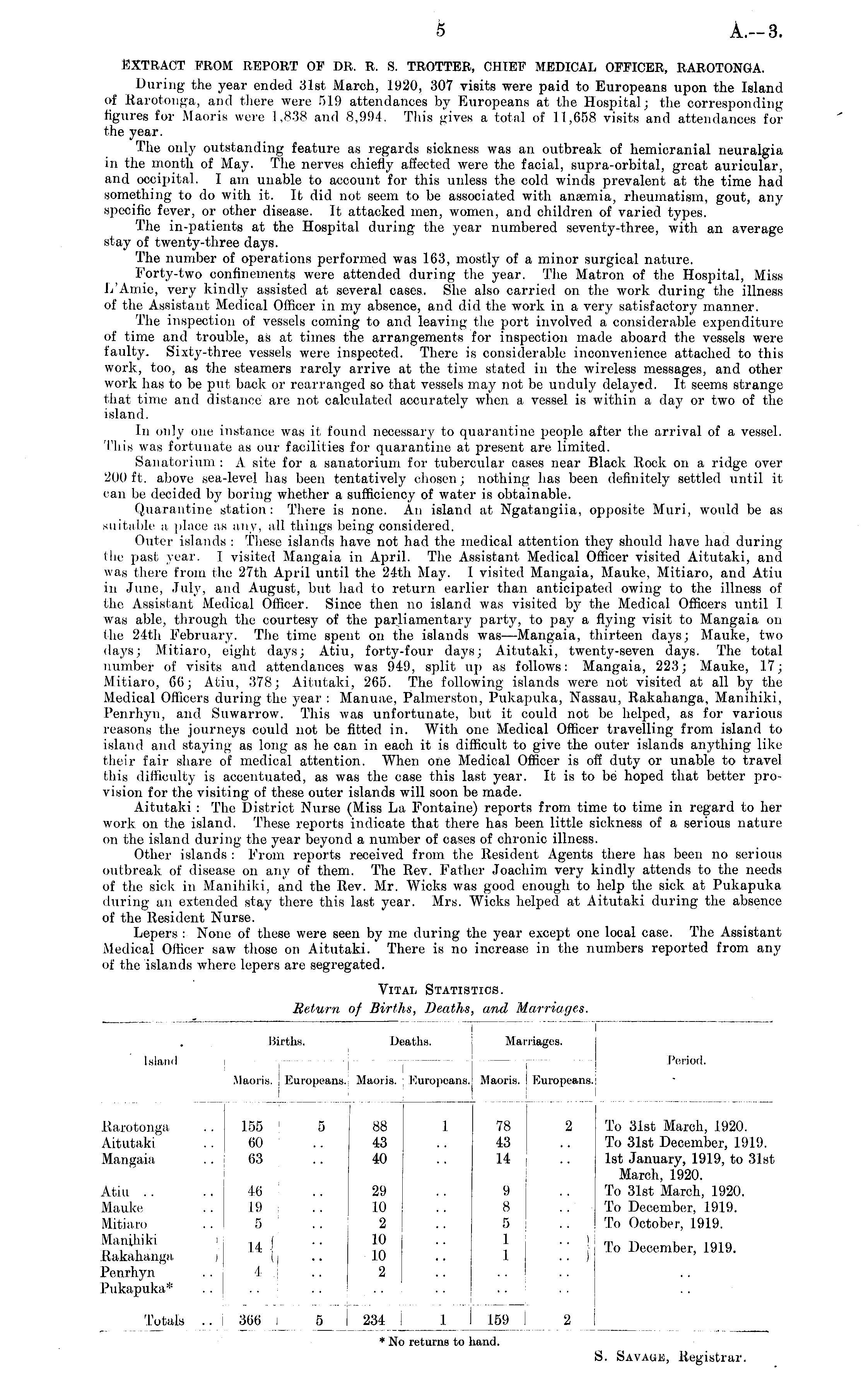 EXTRACT FROM REPORT OF DR. R. S. TROTTER, CHIEF MEDICAL OFFICER, RAROTONGA. During the year ended 31st March, 1920, 307 visits were paid to Europeans upon the Island of Rarotonga, and there were 519 attendances by Europeans at the Hospital; the corresponding figures for Maoris were 1,838 and 8,994. This gives a total of 11,658 visits and attendances for the year. The only outstanding feature as regards sickness was an outbreak of hemicranial neuralgia in the month of May. The nerves chiefly affected were the facial, supra-orbital, great auricular, and occipital. I am unable to account for this unless the cold winds prevalent at the time hael something to do with it. It did not seem to be associated with anaemia, rheumatism, gout, any specific fever, or other disease. It attacked men, women, and children of varied types. The in-patients at the Hospital during the year numbered seventy-three, with an average stay of twenty-three days. The number of operations performeel was 163, mostly of a minor surgical nature. Forty-two confinements were attended during the year. The Matron of the Hospital, Miss L'Amie, very kindly assisted at several cases. She also carried on the work during the illness of the Assistant Medical Officer in my absence, and did the work in a very satisfactory manner. The inspection of vessels coming to and leaving the port involved a cemsiderable expenditure of time and trouble, as at times the arrangements for inspection made aboard the vessels were faulty. Sixty-three vessels were inspected. There is considerable inconvenience attached to this work, too, as the steamers rarely arrive at the time stated in the wireless messages, and other work has to be put back or rearranged so that vessels may not be unduly delaj'ed. It seems strange that time and distance are not calculated accurately when a vessel is within a day or two of the island. In only one instance was it found necessary to quarantine people after the arrival of a vessel. This was fortunate as our facilities for quarantine at present are limited. Sanatorium : A site for a sanatorium for tubercular oases near Black Rock on a ridge over 200 ft. above sea-level has been tentatively chosen; nothing has been definitely settled until it can be elecided by boring whether a sufficiency of water is obtainable. Quarantine station: There is none. An island at Ngatangiia, opposite Muri, would be as suitable a place as any, all things being considered. Outer islands : These islands have not had the medical attention they should have had during the past year. I visited Mangaia in April. The Assistant Medical Officer visited Aitutaki, anel was there from the 27th April until the 24th May. I visited Mangaia, Mauke, Mitiaro, and Atiu in June, July, and August, but had to return earlier than anticipated owing to the illness of the Assistant Medical Officer. Since then no island was visited by the Medical Officers until I was able, through the courtesy of the parliamentary party, to pay a flying visit to Mangaia on the 24th February. The time spent on the islands was —Mangaia, thirteen days; Mauke, two clays; Mitiaro, eight days; Atiu, forty-four days; Aitutaki, twenty-seven days. The total number of visits and attendances was 949, split up as follows: Mangaia, 223; Mauke, 17; Mitiaro, 66; Atiu, 378; Aitutaki, 265. The following islands were not visited at all by the Medical Officers during the year : Manuae, Palmerston, Pukapuka, Nassau, Rakahanga, Manihiki, Penrhyn, and Suwarrow. This was unfortunate, but it could not be helped, as for various reasons the journeys could not be fitted in. With one Medical Officer travelling from island to island and staying as long as he can in each it is difficult to give the outer islanels anything like their fair share of medical attention. When one Medical Officer is off duty or unable to travc;! this difficulty is accentuated, as was the case this last year. It is to be hoped that better provision for the visiting of these outer islands will soon be made. Aitutaki : The District Nurse (Miss La Fontaine) reports from time to time in regard to her work on the island. These reports indicate that there has been little sickness of a serious nature em the island during the year beyond a number of cases of chronic illness. Other islands : From reports received from the Resident Agents there has been no serious outbreak of disease on any of them. The Rev. Father Joachim very kindly attends to the needs of the sick in. Manihiki, and the Rev. Mr. Wicks was good enough to help the sick at Pukapuka during an extended stay there this last year. Mrs. Wicks helped at Aitutaki during the absence of the Resident Nurse. Lepers : None of these were seen by me eiuring the year except one local case. The Assistant Medical Officer saw those on Aitutaki. There is no increase in the numbers repeated from any of the islands where lepers are segregated.