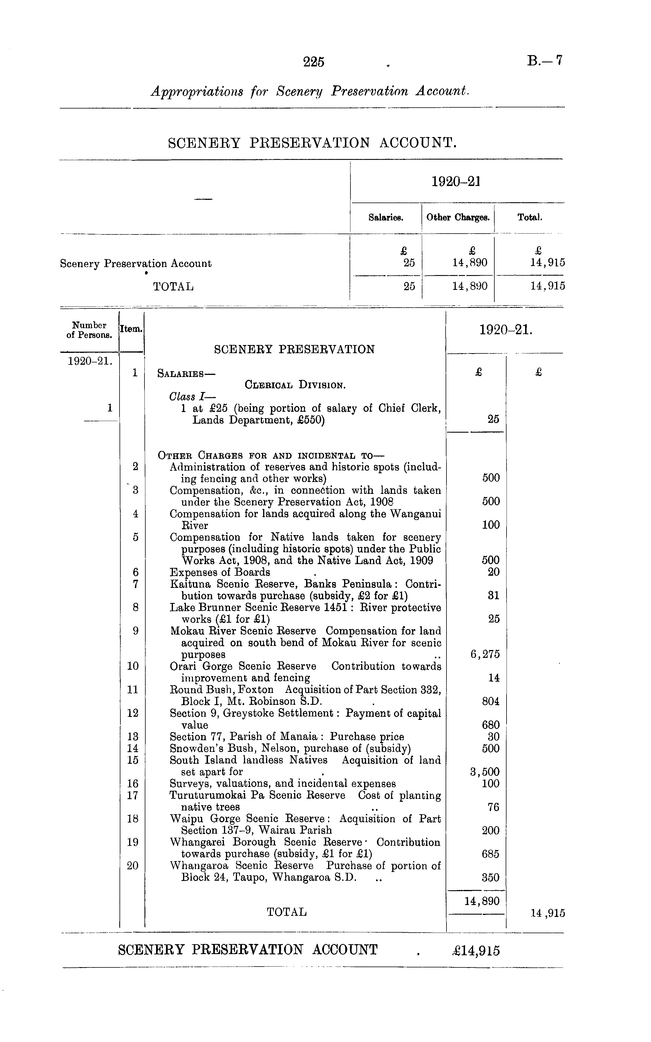 1920-21 Salaries. Other Charges. Total. £ 25 £ 14,890 £ 14,91 Scenery Preservation Account TOTAL 25 14,890 14,91, Number of Persons. Item. 19 i-21. SCENERY PRESERVATION 1920-21. Salaries— £ 1 Clerical Division. Class I — 1 at £25 (being portion of salary of Chief Clerk, Lands Department, £550) 25 2 Other Charges for and incidental to — Administration of reserves and historic spots (including fencing and other works) Compensation, &c, in connection with lands taken under the Scenery Preservation xAct, 1908 Compensation for lands acquired along the Wanganui River 500 ""3 500 4 100 5 Compensation for Native lands taken, for scenery purposes (including historic spots) under the Public Works Act, 1908, and the Native Land Act, 1909 Expenses of Boards Kaituna Scenic Reserve, Banks Peninsula : Contribution towards purchase (subsidy, £2 for £1) Lake Brunner Scenic Reserve 1451: River protective works (£1 for £1) Mokau River Scenic Reserve Compensation for land acquired on south bend of Mokau River for scenic purposes Orari Gorge Scenic Reserve Contribution towards improvement and fencing Round Bush, Foxton Acquisition of Part Section 332, Block I, Mt. Robinson S.D. Section 9, Greystoke Settlement: Payment of capital value Section 77, Parish of Manaia : Purchase price Snowden's Bush, Nelson, purchase of (subsidy) South Island landless Natives Acquisition of land set apart for Surveys, valuations, and incidental expenses Turuturumokai Pa Scenic Reserve Cost of planting native trees Waipu Gorge Scenic Reserve: Acquisition of Part Section 137-9, Wairau Parish Whangarei Borough Scenic Reserve ■ Contribution towards purchase (subsidy, £1 for £1) Whangaroa Scenic Reserve Purchase of portion of Block 24, Taupo, Whangaroa S.D. 500 20 6 7 31 8 25 9 6,275 10 14 11 804 12 13 II 15 680 30 500 16 17 3,500 100 76 L8 19 200 20 685 350 TOTAL 14,890 14 ,91 ice: ERY PRESERVATION ACCOUNT £14,915