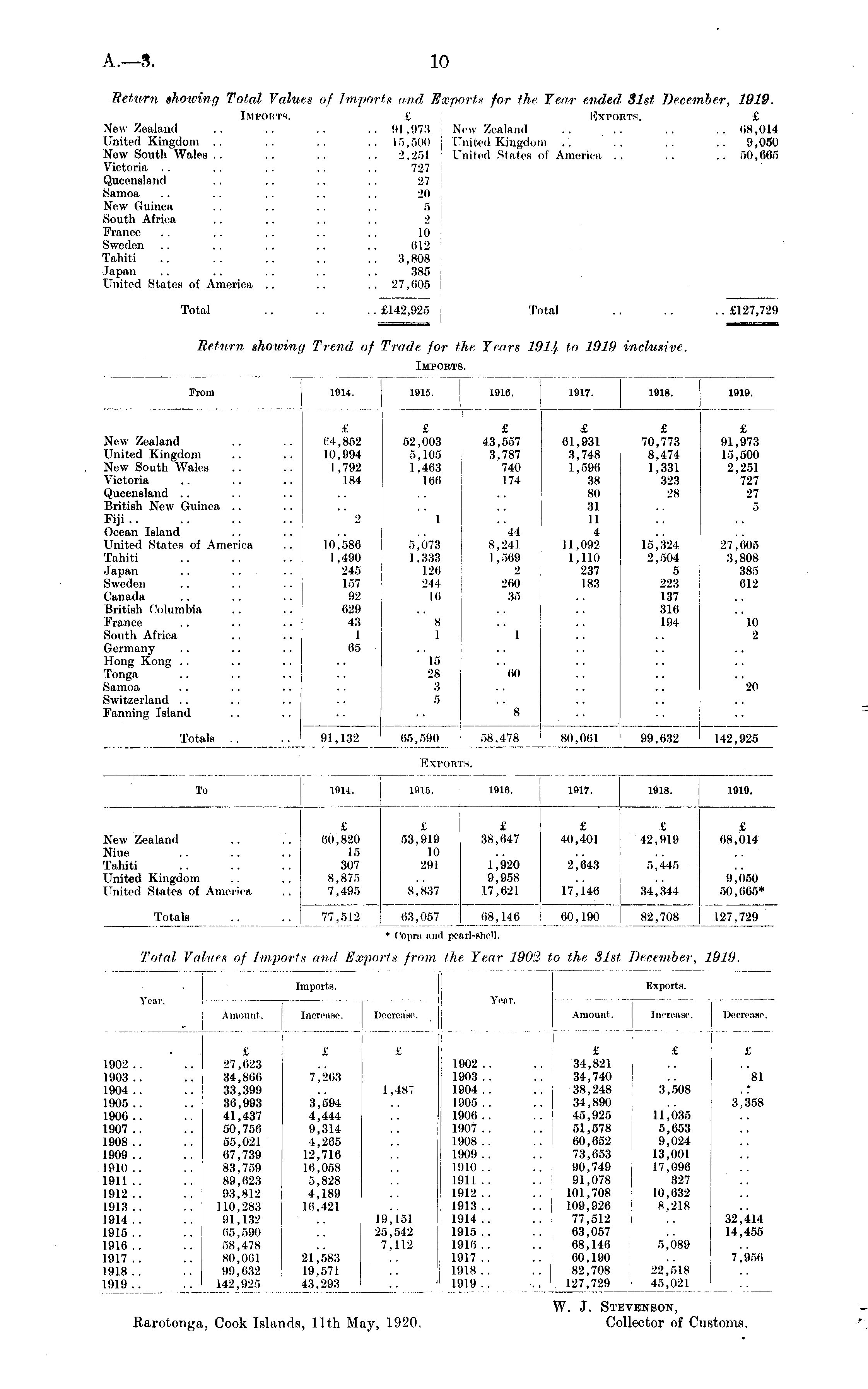 Imports. From 1914. 1915. 1916. 1917. 1918. 1919. New Zealand United Kingdom New South Wales Victoria Queensland British New Guinea Fiji Ocean Islanel Uniteel States of America Tahiti Japan .. Sweden Canada British Columbia France South Africa Germany Hong Kong Tonga Samoa Switzerland Fanning Islanel £ 64,852 10,994 1,792 184 £ 52,003 5,105 1,463 166 £ 43,557 3,787 740 174 £ 61,931 3,748 1,596 38 80 31 11 4 11.092 1,110 237 183 £ 70,773 8,474 1,331 323 28 £ 91,973 15,500 2,251 727 27 5 2 1 10,586 1,490 245 157 92 629 43 1 65 5,073 1,333 126 244 Hi 44 8,241 1,569 2 260 35 15,324 2,504 5 223 137 316 194 27,605 3,808 385 612 8 1 10 2 1 15 28 3 5 60 20 8 Totals .. .. 91,132 65,590 58,478 80,061 99,632 142,925 EXPORI :s. To 1914. 1915. 1916. 1917. 1918. 1919. New Zealand Niue Tahiti United Kingdom United States of America £ 60,820 15 307 8,875 7,495 £ 53,919 10 291 £ 38.647 £ 40,401 £ 42,919 £ 68,014 8,837 1,920 9,958 17,621 2,643 5,445 9,050 50,665* 17^146 34,344 Totals 77.512 63,057 * Copra and poi 68,146 arl-shell. 60.190 82,708 127,729