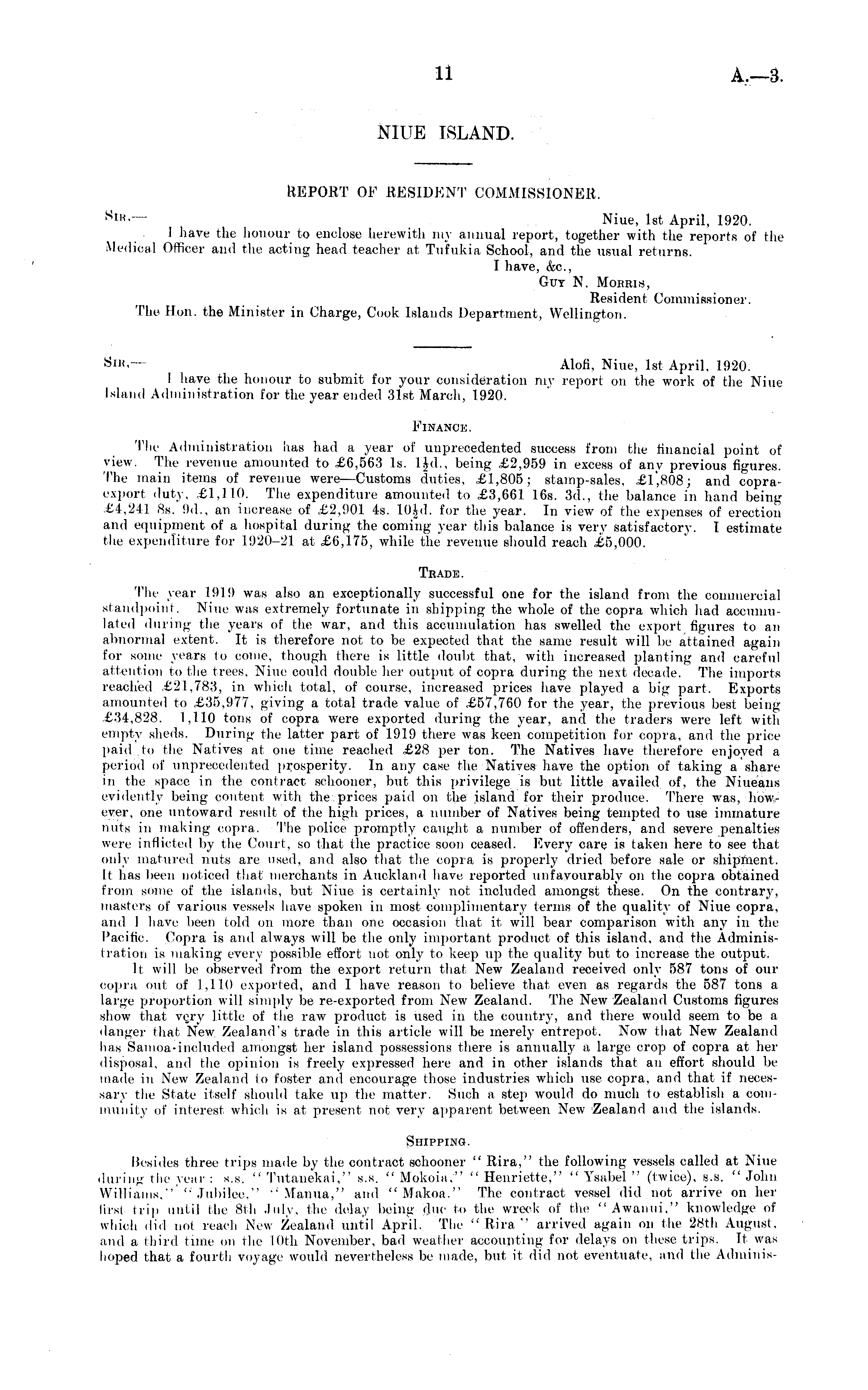 NIUE ISLAND. REPORT OF RESIDENT COMMISSIONER. SIR,— Niue, Ist April, 1920. I have the honour to enclose herewith my annual report, together with the reports of the Medical Officer and the acting head teacher at Tufukia School, and the usual returns. I have, (fee., Guy N. Morris, Resident. Commissioner. Thu Hon. the Minister in Charge, Cook Islands Department, Wellington. Sib,— Alofi, Nine, Ist April, 1920. I leave the honour to submit for your consideration my report on the work of the Niue Island Administration for the year ended 31st March, 1920. Finance. The Administration lias had a year of unprecedented success from the financial point of view. The revenue amounted to £6,563 Is. lid., being £2,959 in excess of any previous figures. The main items of revenue were —Customs duties, £1,805; stamp-sales, £1,808; anel copraexport duty, £1,110. The expenditure amounted to £3,661 16s. 3d., the balance in hand being £4,241 Bs. 9d., an increase of £2,901 4s. lOid. for the year. In view of the expenses of erection and equipment of a hospital eiuring the coming year this balance is very satisfactory. I estimate the expenditure for 1920-21 at £6,175, while the revenue should reach £5,000. Trade. 'Phe year 1919 was also an exceptionally successful one for the island from the commercial standpoint. Nine was extremely fortunate in shipping the whole of the copra which had accumulated during the years of the war, and this accumulation has swelled the export figures to an abnormal extent. It is therefore not to be expected that the same result will be: attained again for some years to come, though there is little doubt that, with increased planting anel careful attention to the trees, Niue could double her output of copra during the next decade. The imports reached £21,783, in which total, of course, increased prices have played a big part. Exports amounted to £35,977, giving a total trade value of £57,760 for the year, the previous best being £34,828. 1,110 tons of copra were exported during the year, and the traders were left with empty sheds. During the latter part of 1919 there was keen competition for copra, and the price paid to the Natives at one time reacheel £28 per ton. The Natives have therefore enjoyed a period of unprecedented prosperity. In any case the Natives have the option of taking a sharein the. space in the contract schooner, but this privilege is but little availeel e>f, the Niueans evidently being content with the.prices paiel on the island for their produce. There was, however, one untoward result of the high prices, a number of Natives being tempted to use immature nuts in making copra. The police promptly caught a number of offenders, and severe penalties were inflicted by the Court, so that the practice soon ceaseel. Every care is taken here to see that only matured nuts are used, and also that the copra is properly dried before sale or shipment. It has been noticed that merchants in Auckland have reported unfavourably on the copra obtained from some of the islands, but Niue is certainly not included amongst these. On the contrary, masters of various vessels have spoken in most complimentary terms of the quality of Niue copra, and 1 have been told on more than one occasion that it will bear comparison with any in the Pacific. Copra is anil always will be the only important product of this island, and the Administration is making every possible effort not only to keep up the quality but to increase the output. It will be observed from the export return that New Zealand received only 587 tons of our copra out of 1,110 exported, and I have reason to believe that even as regards the 587 tons a large proportion will simply be re-exported from New Zealand. The New Zealanel Customs figures show that vgry little of the raw product is used in the country, and there would seem to be a clanger that New. Zealanel's trade in this article will be merely entrepot. Now that New Zealanel has Samoa-included amongst her island possessions there is annually a large crop of copra at her elisposal, and the opinion is freely expressed here and in other islands that an effort should be uiaele in New Zealand to foster and encourage those industries which use copra, and that if necessary the State itself should take up the matter. Such a steji would do much to establish a community of interest whie:h is at present not very apparent between New Zealand and the islands. Shipping. Resides three trips made by the contract schooner " Rira," the following vessels called at Niue eluritig the year : s.s. " Tutanekai," s.s. " Mokoin," " Henriette," " Ysnbel " (twice), s.s. "John Williams." '• Jubilee," ''Manna," and " Makoa." The contract vessel did not arrive on her first trip until the Bth July, the delay being due to the wreck of the' "Awauui," knowledge of which did not reach New Zealand until April. The "Rira" arrived again on the 28th August, and a third time on the 10th November, bad weather accounting for delays on these trips. It was hoped that a fourth voyage would nevertheless be made, but it did not eventuate, and the Admiuis-