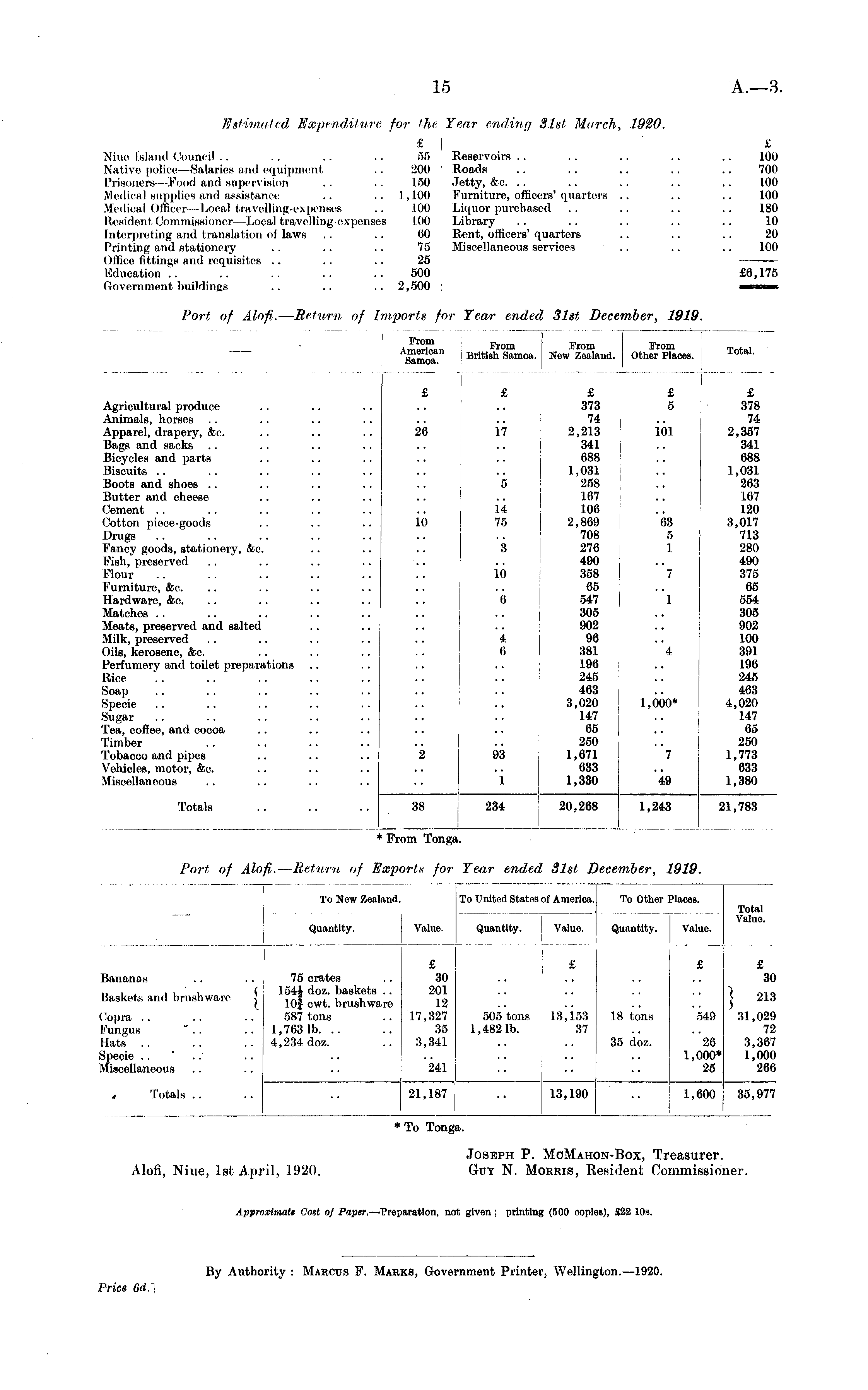 Joseph P. MoMahon-Box, Treasurer. Alofi, Niue, Ist April, 1920. Guy N. Morris, Resident Commissioner.
