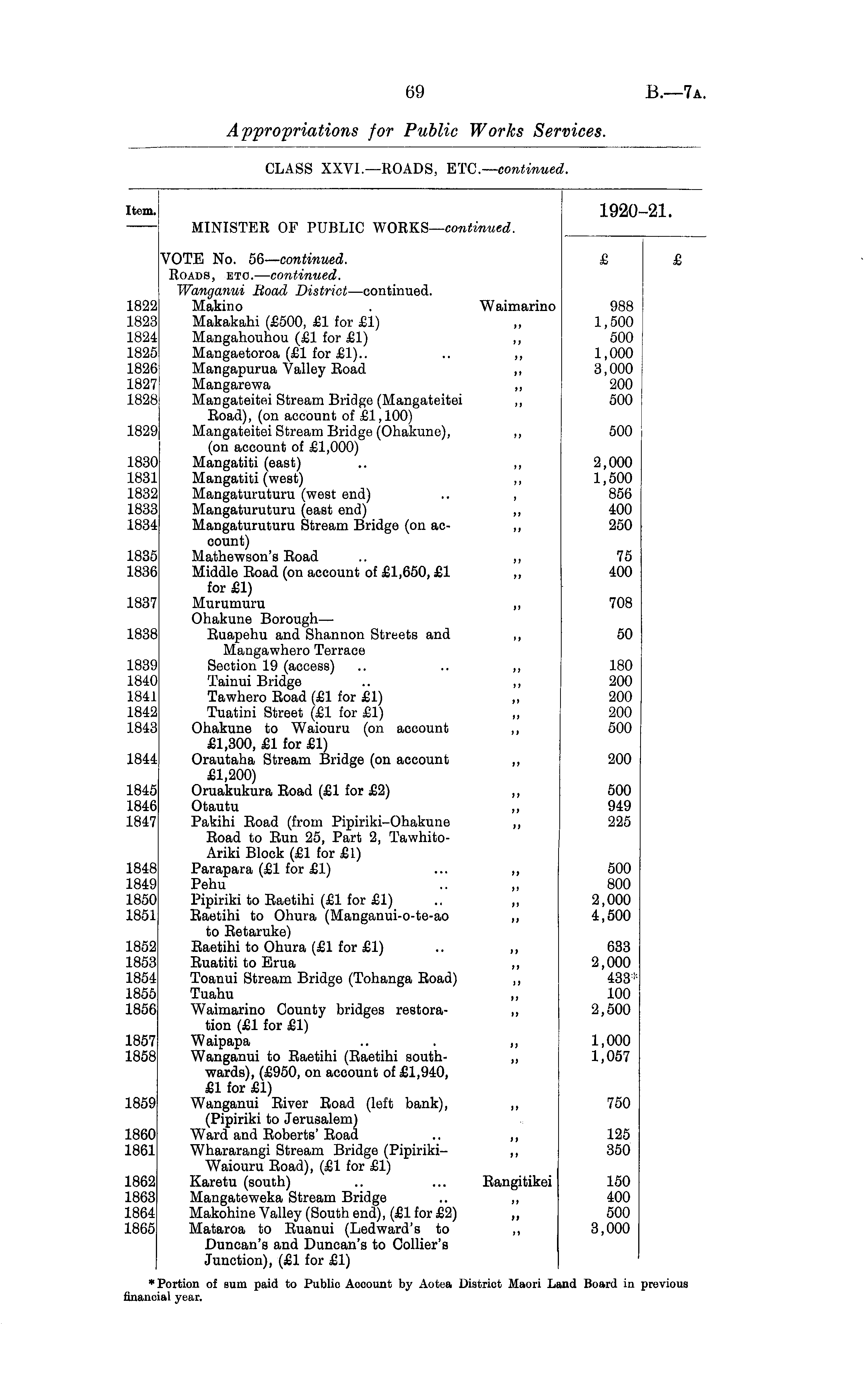 Item. 1920-21. MINISTER OF PUBLIC WORKS— continued. 1822 1823 1824 1825 1826 1827 1828 1829 1830 1831 1832 1833 1834 1835 1836 1837 1838 1839 1840 1841 1842 1843 1844 VOTE No. 56— continued. Roads, etc. — continued. Wanganui Boad District —continued. Makino . Waimarino Makakahi (£500, £1 for £1) Mangahouhou (£1 for £1) ,, Mangaetoroa (£1 for £1).. .. ,, Mangapurua Valley Boad ,, Mangarewa ,, Mangateitei Stream Bridge (Mangateitei ,, Eoad), (on account of £1,100) Mangateitei Stream Bridge (Ohakune), ,, (on account of £1,000) Mangatiti (east) .. ,, Mangatiti (west) ,, Mangaturuturu (west end) .. , Mangaturuturu (east end) „ Mangaturuturu Stream Bridge (on ac- ,, count) Mathewson's Eoad .. ,, Middle Eoad (on account of £1,650, £1 ,, for £1) Murumuru ,, Ohakune Borough— Euapehu and Shannon Streets and ,, Mangawhero Terrace Section 19 (access) .. .. „ Tainui Bridge .. ,, Tawhero Road (£1 for £1) Tuatini Street (£1 for £1) Ohakune to Waiouru (on account ,, £1,300, £1 for £1) Orautaha Stream Bridge (on account ,, £1,200) Oruakukura Eoad (£1 for £2) Otautu ,, Pakihi Eoad (from Pipiriki-Ohakune ,, Eoad to Eun 25, Part 2, TawhitoAriki Block (£1 for £1) Parapara (£1 for £1) ... ,, Pehu Pipiriki to Eaetihi (£1 for £1) .. „ Raetihi to Ohura (Manganui-o-te-ao to Eetaruke) Eaetihi to Ohura (£1 for £1) Euatiti to Erua ,, Toanui Stream Bridge (Tohanga Eoad) ,, Tuahu ,, Waimarino County bridges restora- ,, tion (£1 for £1) Waipapa .. . „ Wanganui to Eaetihi (Eaetihi south- ,, wards), (£950, on account of £1,940, £1 for £1) Wanganui Eiver Eoad (left bank), „ (Pipiriki to Jerusalem) Ward and Eoberts' Eoad .. ,, Whararangi Stream Bridge (Pipiriki- „ Waiouru Eoad), (£1 for £1) Karetu (south) .. ... Eangitikoi Mangateweka Stream Bridge .. ,, Makohine Valley (South end), (£1 for £2) Mataroa to Euanui (Ledward's to ,, Duncan's and Duncan's to Collier's Junction), (£1 for £1) £ 988 1,500 500 1,000 3,000 200 500 500 2,000 1,500 856 400 250 75 400 708 50 180 200 200 200 500 200 1845 1846 1847 500 949 225 1848 1849 1850 1851 500 800 2,000 4,500 1852 1853 1854 1855 1856 633 2,000 433100 2,500 1857 1858 1,000 1,057 1859 750 1860 1861 125 350 1862 1863 1864 1865 150 400 500 3,000 id Board in * Portion of sum paid to Public Account by Aofcea District Maori Li iial year. previous lane
