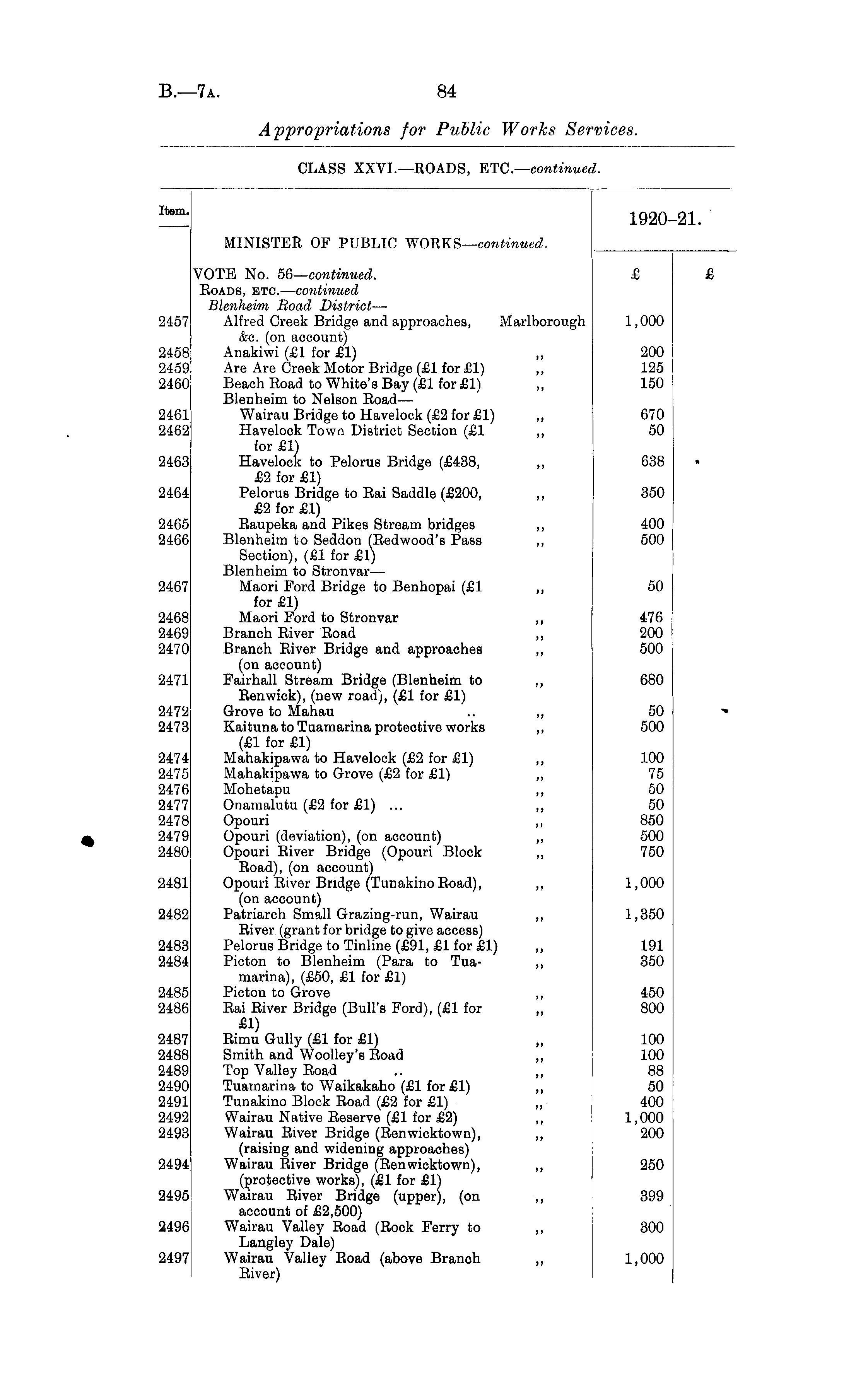 Item. 1920-21. MINISTER OF PUBLIC WORKS— continued. 2457 2458 2459 2460 2461 2462 2463 2464 2465 2466 2467 2468 2469 2470 2471 2472 2473 2474 2475 2476 2477 2478 2479 2480 VOTE No. 56— continued. Roads, etc. — continued Blenheim Road District —■ Alfred Creek Bridge and approaches, Marlborough &c. (on account) Anakiwi (£1 for £1) Are Are Creek Motor Bridge (£1 for £1) ,, Beach Road to White's Bay (£1 for £1) Blenheim to Nelson Road— Wairau Bridge to Havelock (£2 for £1) Havelock Town District Section (£1 ,, for £1) Havelock to Pelorus Bridge (£438, ,, £2 for £1) Pelorus Bridge to Rai Saddle (£200, £2 for £1) Eaupeka and Pikes Stream bridges ,, Blenheim to Seddon (Redwood's Pass ,, Section), (£1 for £1) Blenheim to Stronvar— Maori Ford Bridge to Benhopai (£1 „ for £1) Maori Ford to Stronvar ,, Branch Eiver Road ,, Branch Eiver Bridge and approaches ,, (on account) Fairhall Stream Bridge (Blenheim to ,, Renwick), (new road), (£1 for £1) Grove to Mahau .. ,, Kaituna to Tuamarina protective works ,, (£1 for £1) Mahakipawa to Havelock (£2 for £1) ,, Mahakipawa to Grove (£2 for £1) ,, Mohetapu ,, Onarnalutu (£2 for £1) ... ,, Opouri ,, Opouri (deviation), (on account) ,, Opouri River Bridge (Opouri Block ,, Road), (on account) Opouri Eiver Bridge (Tunakino Eoad), „ (on account) Patriarch Small Grazing-run, Wairau „ Eiver (grant for bridge to give access) Pelorus Bridge to Tinline (£91, £1 for £1) Picton to Blenheim (Para to Tua- ,, marina), (£50, £1 for £1) Picton to Grove ,, Eai Eiver Bridge (Bull's Ford), (£1 for £1) Rimu Gully (£1 for £1) Smith and Woolley's Eoad ,, Top Valley Eoad Tuamarina to Waikakaho (£1 for £1) ,, Tunakino Block Road (£2 for £1) ,, Wairau Native Reserve (£1 for £2) Wairau River Bridge (Eenwicktown), (raising and widening approaches) Wairau Eiver Bridge (Eenwicktown), ,, (protective works), (£1 for £1) Wairau Eiver Bridge (upper), (on ,, account of £2,500) Wairau Valley Eoad (Rock Ferry to ,, Langley Dale) Wairau Valley Road (above Branch ,, Eiver) £ 1,000 200 125 150 670 50 638 350 400 500 50 476 200 500 680 50 500 100 75 50 50 850 500 750 2481 1,000 2482 1,350 2483 2484 191 350 2485 2486 450 800 2487 2488 2489 2490 2491 2492 2493 100 100 88 50 400 1,000 200 2494 250 2495 399 2496 300 2497 1,000