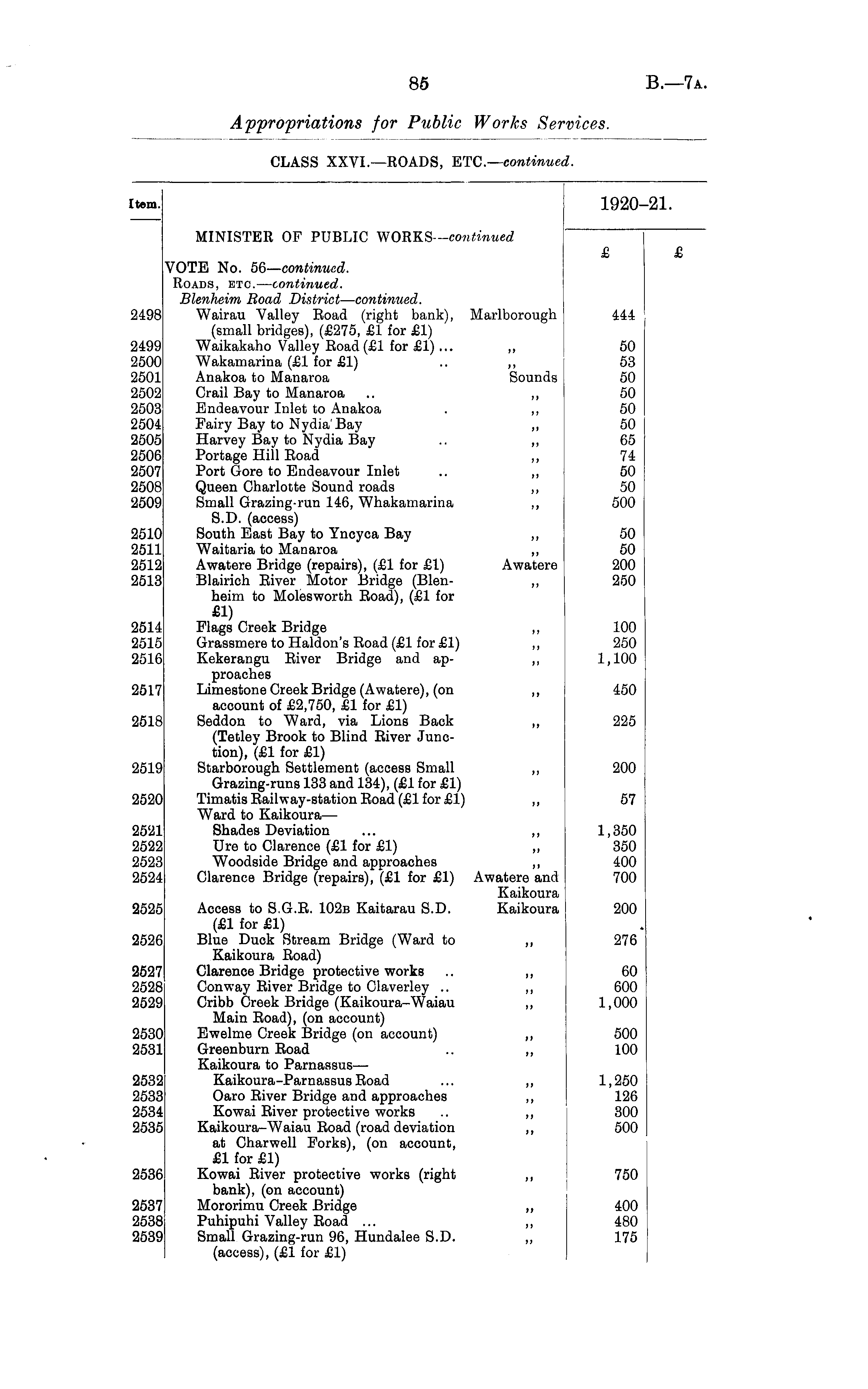 Item. 1920-21. MINISTER OF PUBLIC WORKS—continued VOTE No. 56— continued. Roads, etc. — continued. Blenheim Road District — continued. Wairau Valley Eoad (right bank), Marlborough (small bridges), (£275, £1 for £1) Waikakaho Valley Eoad(£l for £1)... Wakamarina (£1 for £1) .. ,, Anakoa to Manaroa Sounds Crail Bay to Manaroa .. ,, Endeavour Inlet to Anakoa . ,, Fairy Bay to Nydia'Bay ,, Harvey Bay to Nydia Bay .. ,, Portage Hill Eoad ,, Port Gore to Endeavour Inlet .. „ Queen Charlotte Sound roads ,, Small Grazing-run 146, Whakamarina ,, S.D. (access) South East Bay to Yncyca Bay ,, Waitaria to Manaroa ,, Awatere Bridge (repairs), (£1 for £1) Awatere Blairich Eiver Motor Bridge (Blen- „ heim to Moles worth Eoad), (£1 for £1) Flags Creek Bridge „ Grassmere to Haldon's Eoad (£1 for £1) Kekerangu Eiver Bridge and ap- ,, proaches Limestone Creek Bridge (Awatere), (on ,, account of £2,750, £1 for £1) Seddon to Ward, via Lions Back ,, (Tetley Brook to Blind Eiver Junction), (£1 for £1) Starborough Settlement (access Small „ Grazing-runs 133 and 134), (£1 for £1) Timatis Railway-station Eoad (£1 for £1) ,, Ward to Kaikoura— Shades Deviation ... ,, Ure to Clarence (£1 for £1) Woodside Bridge and approaches ,, Clarence Bridge (repairs), (£1 for £1) Awatere and Kaikoura Access to S.G.E. 102b Kaitarau S.D. Kaikoura (£1 for £1) Blue Duck Stream Bridge (Ward to ,, Kaikoura Road) Clarence Bridge protective works .. ,, Conway Eiver Bridge to Claverley .. „ Cribb Creek Bridge (Kaikoura-Waiau ,, Main Eoad), (on account) Ewelme Creek Bridge (on account) ,, Greenburn Eoad .. ,, Kaikoura to Parnassus— Kaikoura-Parnassus Road ... ,, Oaro Eiver Bridge and approaches ,, Kowai River protective works .. ,, Kaikoura-Waiau Road (road deviation ,, at Charwell Forks), (on account, £1 for £1) Kowai River protective works (right ,, bank), (on account) Mororimu Creek Bridge ,, Puhipuhi Valley Road ... ,, Small Grazing-run 96, Hundalee S.D. ,, (access), (£1 for £1) £ 444 2498 2499 2500 2501 2502 2503 2504 2505 2506 2507 2508 2509 50 53 50 50 50 50 65 74 50 50 500 2510 2511 2512 2513 50 50 200 250 2514 2515 2516 100 250 1,100 2517 450 2518 225 2519 200 2520 57 2521 2522 2523 2524 1,350 350 400 700 2525 200 2526 276 2527 2528 2529 60 600 1,000 2530 2531 500 100 2532 2533 2534 2535 1,250 126 300 500 2536 750 2537 2538 2539 400 480 175