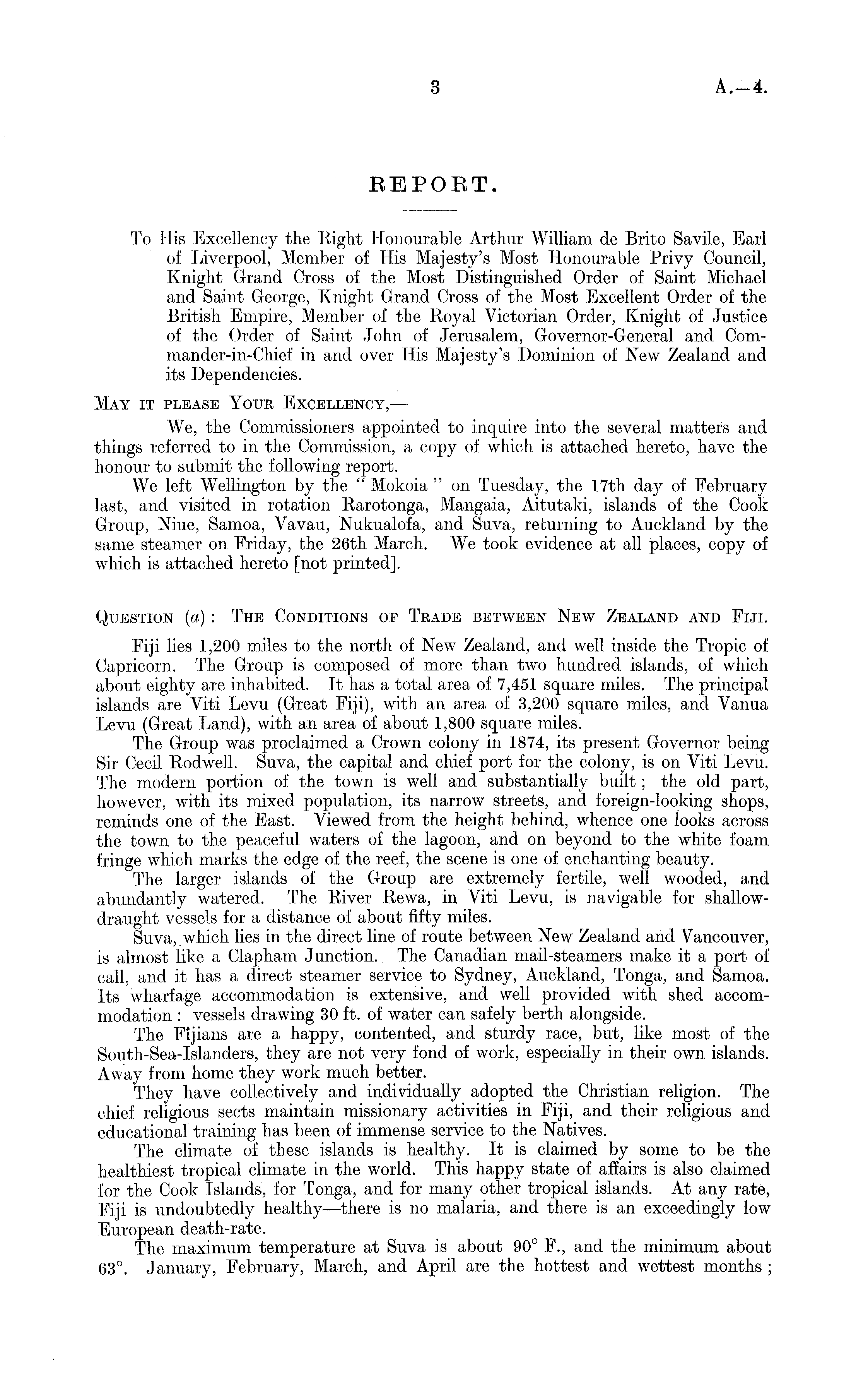 REPORT. To His Excellency the Right Honourable Arthur William de Brito Savile, Earl of Liverpool, Member of His Majesty's Most Honourable Privy Council, Knight Grand Cross of the Most Distinguished Order of Saint Michael and Saint George, Knight Grand Cross of the Most Excellent Order of the British Empire, Member of the Royal Victorian Order, Knight of Justice of the Order of Saint John of Jerusalem, Governor-General and Com-mander-in-Chief in and over His Majesty's Dominion of New Zealand and its Dependencies. May it please Your Excellency,— We, the Commissioners appointed to inquire into the several matters and things referred to in the Commission, a copy of which is attached hereto, have the honour to submit the following report. We left Wellington by the ' Mokoia " on Tuesday, the 17th day of February last, and visited in rotation Rarotonga, Mangaia, Aitutaki, islands of the Cook Group, Niue, Samoa, Vavau, Nukualofa, and Suva, returning to Auckland by the same steamer on Friday, the 26th March. We took evidence at all places, copy of which is attached hereto [not printed]. Question (a) : The Conditions of Trade between New Zealand and Fiji. Fiji lies 1,200 miles to the north of New Zealand, and well inside the Tropic of Capricorn. The Group is composed of more than two hundred islands, of which about eighty are inhabited. It has a total area of 7,451 square miles. The principal islands are Viti Levu (Great Fiji), with an area of 3,200 square miles, and Vanua Levu (Great Land), with an area of about 1,800 square miles. The Group was proclaimed a Crown colony in 1874, its present Governor being Sir Cecil Rodwell. Suva, the capital and chief port for the colony, is on Viti Levu. The modern portion of the town is well and substantially built; the old part, however, with its mixed population, its narrow streets, and foreign-looking shops, reminds one of the East. Viewed from the height behind, whence one looks across the town to the peaceful waters of the lagoon, and on beyond to the white foam fringe which marks the edge of the reef, the scene is one of enchanting beauty. The larger islands of the Group are extremely fertile, well wooded, and abundantly watered. The River Rewa, in Viti Levu, is navigable for shallowdraught vessels for a distance of about fifty miles. Suva, which lies in the direct line of route between New Zealand and Vancouver, is almost like a Clapham Junction. The Canadian mail-steamers make it a port of call, and it has a direct steamer service to Sydney, Auckland, Tonga, and Samoa. Its wharfage accommodation is extensive, and well provided with shed accommodation : vessels drawing 30 ft. of water can safely berth alongside. The Fijians are a happy, contented, and sturdy race, but, like most of the South-Sea-Islanders, they are not very fond of work, especially in their own islands. Away from home they work much better. They have collectively and individually adopted the Christian religion. The chief religious sects maintain missionary activities in Fiji, and their religious and educational training has been of immense service to the Natives. The climate of these islands is healthy. It is claimed by some to be the healthiest tropical climate in the world. This happy state of affairs is also claimed for the Cook Islands, for Tonga, and for many other tropical islands. At any rate, Fiji is undoubtedly healthy —there is no malaria, and there is an exceedingly low European death-rate. The maximum temperature at Suva is about 90° F., and the minimum about 63°. January, February, March, and April are the hottest and wettest months ;