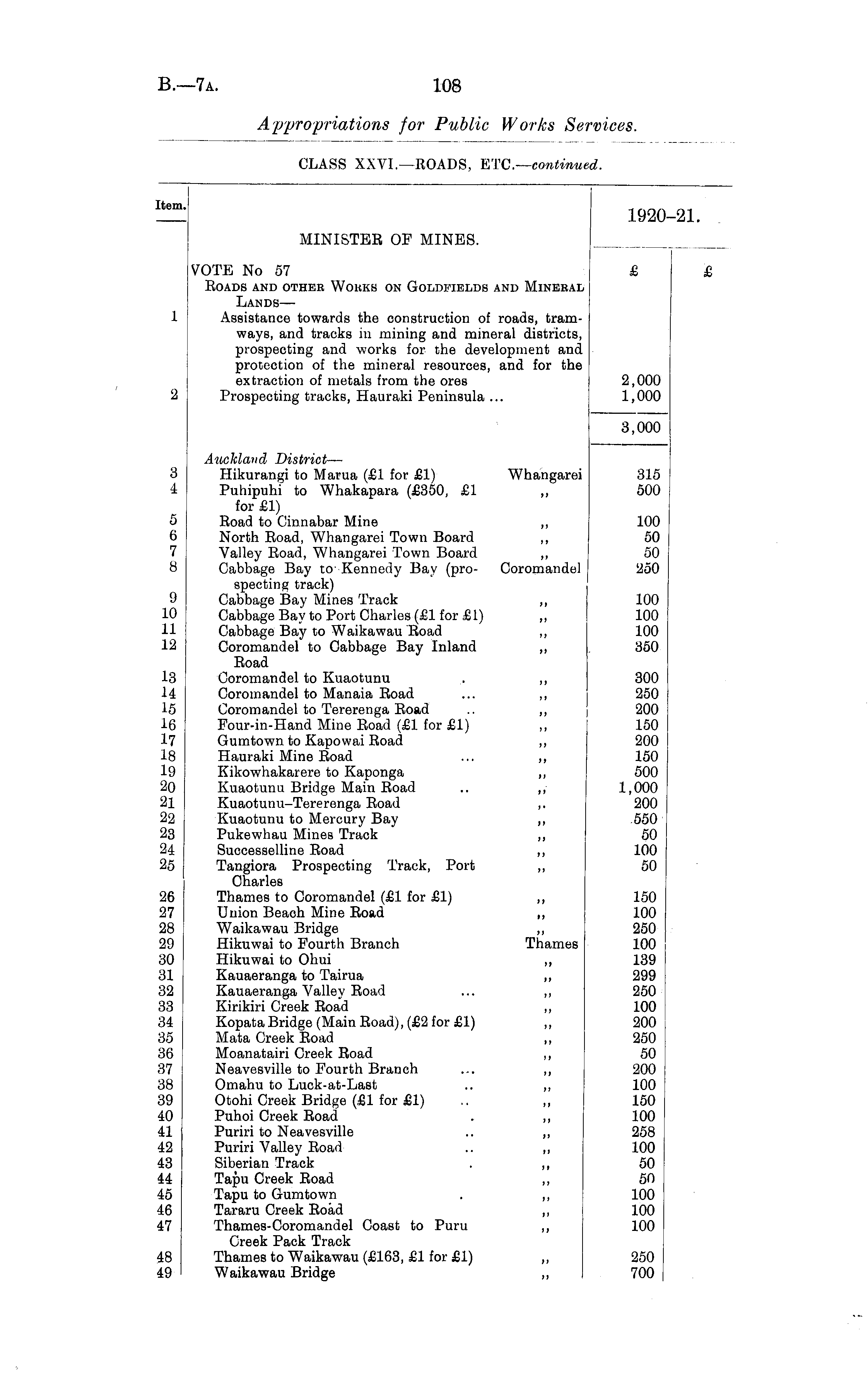 [tern. 1920-21. MINISTEB OF MINES. VOTE No 57 eoads and other wokks on goldfiblds and mlnbbal Lands— Assistance towards the construction of roads, tramways, and tracks in mining and mineral districts, prospecting and -works for the development and protection of the mineral resources, and for the extraction of metals from the ores Prospecting tracks, Hauraki Peninsula ... £ £ 2 2,000 1,000 3,000 3 4 5 6 7 8 Auckland District — Hikurangi to Marua (£1 for £1) Whangarei Puhipuhi to Whakapara (£350, £1 for £1) Koad to Cinnabar Mine ,, North Road, Whangarei Town Board ,, Valley Road, Whangarei Town Board Cabbage Bay to , Kennedy Bay (pro- Coromandel specting track) Cabbage Bay Mines Track ,, Cabbage Bay to Port Charles (£1 for £1) Cabbage Bay to Waikawau Road ,, Coromandel to Cabbage Bay Inland ,, Road 315 500 100 50 50 250 9 10 11 12 100 100 100 350 13 14 15 16 17 18 19 20 21 22 23 24 25 Coromandel to Kuaotunu .. ,, Coromandel to Manaia Road ... ,, Coromandel to Tererenga Road .. ,, Four-in-Hand Mine Road (£1 for £1) Gumtown to Kapowai Road ,, Hauraki Mine Road ... „ Kikowhakarere to Kaponga ,, Kuaotunu Bridge Main Road .. ,, Kuaotunu-Tererenga Road ,. Kuaotunu to Mercury Bay ,, Pukewhau Mines Track ,, Successellino Road ,, Tangiora Prospecting Track, Port Charles Thames to Coromandel (£1 for £1) ,, Union Beach Mine Road ,, Waikawau Bridge „ Hikuwai to Fourth Branch Thames Hikuwai to Ohui ,, Kauaeranga to Tairua ,, Kauaeranga Valley Road ... ,, Kirikiri Creek Road ,, KopataBridge (Main Road), (£2 for £1) Mata Creek Road ,, Moanatairi Creek Road ,, Neavesville to Fourth Branch ... ,, Omahu to Luck-at-Last .. ,, Otohi Creek Bridge (£1 for £1) Puhoi Creek Road , ,, Puriri to Neavesville .. ,, Puriri Valley Road .. ,, Siberian Track . „ Tapu Creek Road ,, Tapu to Gumtown . ,, Tararu Creek Road ,, Thames-Coromandel Coast to Puru ,, Creek Pack Track Thames to Waikawau (£163, £1 for £1) Waikawau Bridge ,, 300 250 200 150 200 150 500 1,000 200 550 50 100 50 26 27 28 29 30 31 32 33 34 35 36 37 38 39 40 41 42 43 44 45 46 47 150 100 250 100 139 299 250 100 200 250 50 200 100 150 100 258 100 50 50 100 100 100 48 49 250 700