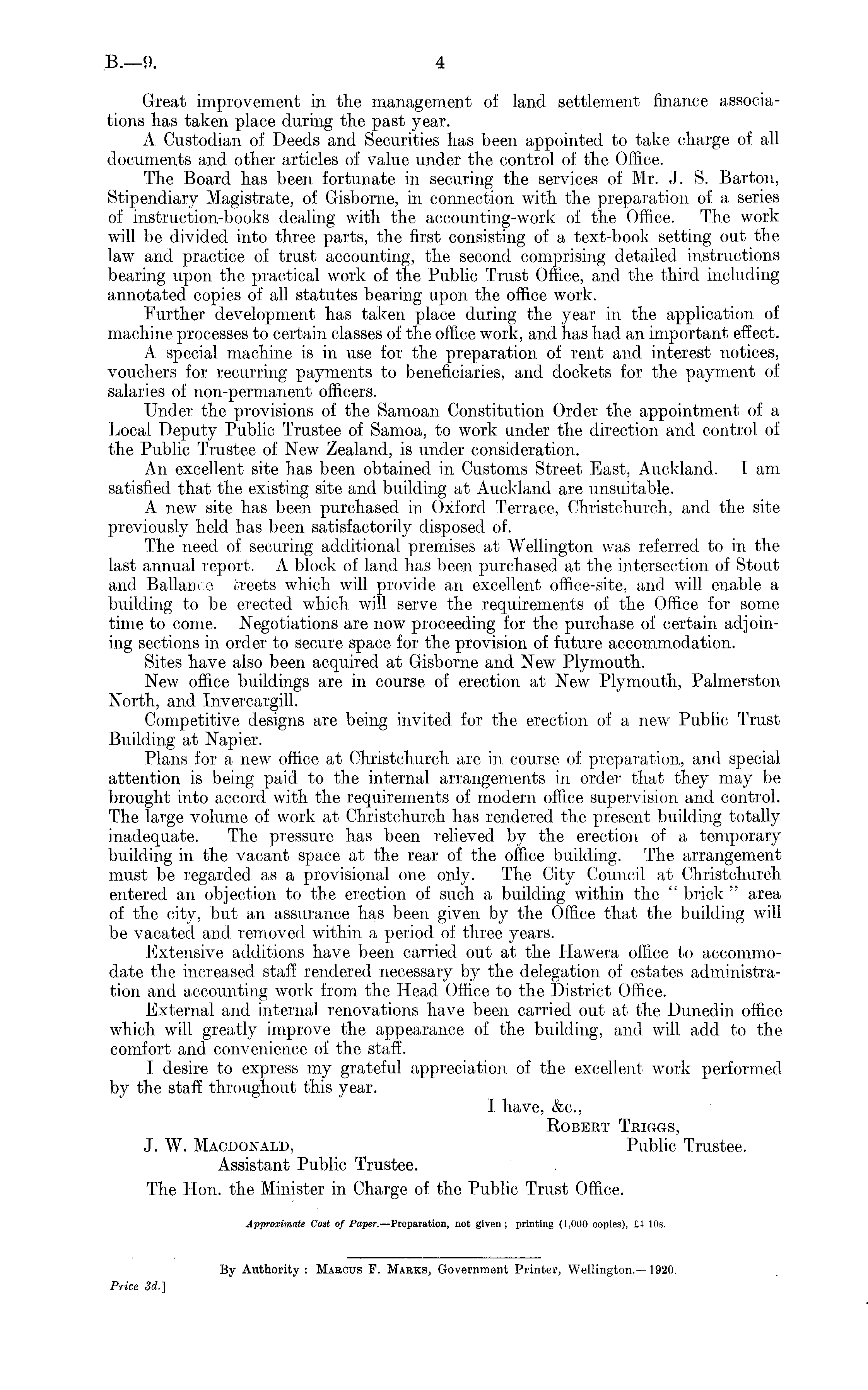 Great improvement in the management of land settlement finance associations has taken place during the past year. A Custodian of Deeds and Securities has been appointed to take charge of all documents and other articles of value under the control of the Office. The Board has been fortunate in securing the services of Mr. J. S. Barton, Stipendiary Magistrate, of Gisborne, in connection with the preparation of a series of instruction-books dealing with the accounting-work of the Office. The work will be divided into three parts, the first consisting of a text-book setting out the law and practice of trust accounting, the second comprising detailed instructions bearing upon the practical work of the Public Trust Office, and the third including annotated copies of all statutes bearing upon the office work. Further development has taken place during the year in the application of machine processes to certain classes of the office work, and has had an important effect. A special machine is in use for the preparation of rent and interest notices, vouchers for recurring payments to beneficiaries, and dockets for the payment of salaries of non-permanent officers. Under the provisions of the Samoan Constitution Order the appointment of a Local Deputy Public Trustee of Samoa, to work under the direction and control of the Public Trustee of New Zealand, is under consideration. An excellent site has been obtained in Customs Street East, Auckland. lam satisfied that the existing site and building at Auckland are unsuitable. A new site has been purchased in Oxford Terrace, Christchurch, and the site previously held has been satisfactorily disposed of. The need of securing additional premises at Wellington was referred to in the last annual report. A block of land has been purchased at the intersection of Stout and Ballance fcreets which will provide an excellent office-site, and will enable a building to be erected which will serve the requirements of the Office for some time to come. Negotiations are now proceeding for the purchase of certain adjoining sections in order to secure space for the provision of future accommodation. Sites have also been acquired at Gisborne and New Plymouth, New office buildings are in course of erection at New Plymouth, Palmerston North, and Invercargill. Competitive designs are being invited for the erection of a new Public Trust Building at Napier. Plans for a new office at Christchurch are in course of preparation, and special attention is being paid to the internal arrangements in order that they may be brought into accord with the requirements of modern office supervision and control. The large volume of work at Christchurch has rendered the present building totally inadequate. The pressure has been relieved by the erection of a temporary building in the vacant space at the rear of the office building. The arrangement must be regarded as a provisional one only. The City Council at Christchurch entered an objection to the erection of such a building within the " brick " area of the city, but an assurance has been given by the Office that the building will be vacated and removed within a period of three years. Extensive additions have been carried out at the Hawera office to accommodate the increased staff rendered necessary by the delegation of estates administration and accounting work from the Head Office to the District Office. External and internal renovations have been carried out at the Dunedin office which will greatly improve the appearance of the building, and will add to the comfort and convenience of the staff. I desire to express my grateful appreciation of the excellent work performed by the staff throughout this year. I have, &c, Robert Triggs, J. W. Macdonald, Public Trustee. Assistant Public Trustee. The Hon. the Minister in Charge of the Public Trust Office.