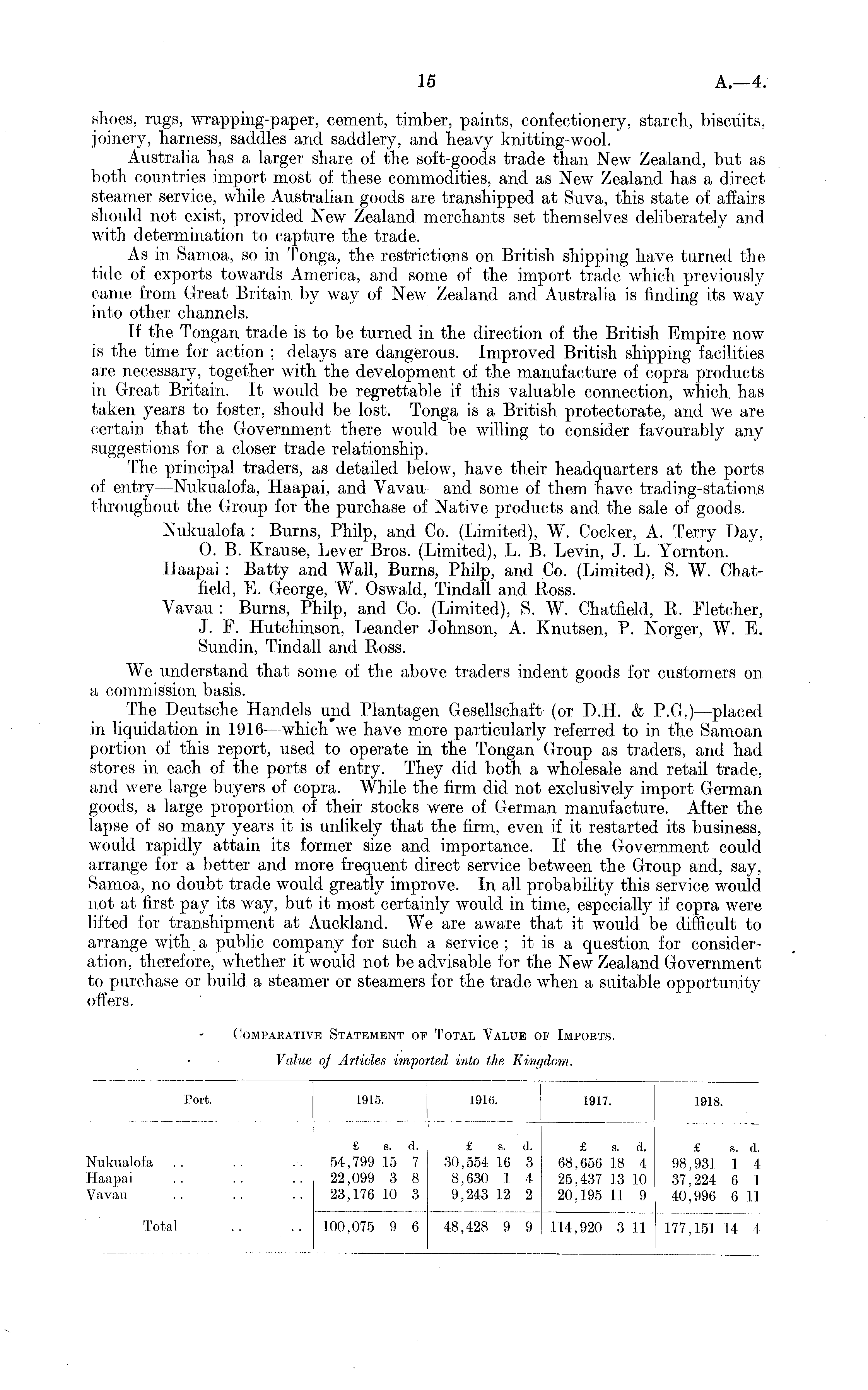shoes, rugs, wrapping-paper, cement, timber, paints, confectionery, starch, biscuits, joinery, harness, saddles and saddlery, and heavy knitting-wool. Australia has a larger share of the soft-goods trade than New Zealand, but as both countries import most of these commodities, and as New Zealand has a direct steamer service, while Australian goods are transhipped at Suva, this state of affairs should not exist, provided New Zealand merchants set themselves deliberately and with determination to capture the trade. As in Samoa, so in Tonga, the restrictions on British shipping have turned the tide of exports towards America, and some of the import trade which previously came from Great Britain by way of New Zealand and Australia is finding its way into other channels. If the Tongan trade is to be turned in the direction of the British Empire now is the time for action ; delays are dangerous. Improved British shipping facilities are necessary, together with the development of the manufacture of copra products in Great Britain. It would be regrettable if this valuable connection, which, has taken years to foster, should be lost. Tonga is a British protectorate, and we are certain that the Government there would be willing to consider favourably any suggestions for a closer trade relationship. The principal traders, as detailed below, have their headquarters at the ports of entry —Nukualofa, Haapai, and Vavau —and some of them have trading-stations throughout the Group for the purchase of Native products and the sale of goods. Nukualofa : Burns, Philp, and Co. (Limited), W. Cocker, A. Terry Day, O. B. Krause, Lever Bros. (Limited), L. B. Levin, J. L. Yornton. Haapai : Batty and Wall, Burns, Philp, and Co. (Limited), S. W. Chatfield, E. George, W. Oswald, Tindall and Ross. Vavau : Burns, Philp, and Co. (Limited), S. W. Chatfield, R. Fletcher, J. F. Hutchinson, Leander Johnson, A. Knutsen, P. Norger, W. E. Sundin, Tindall and Ross. We understand that some of the above traders indent goods for customers on a commission basis. The Deutsche Handels und Plantagen Gesellschaft (or D.H. & P.G.) —placed in liquidation in 1916 —which we have more particularly referred to in the Samoan portion of this report, used to operate in the Tongan Group as traders, and had stores in each of the ports of entry. They did both a wholesale and retail trade, and were large buyers of copra. While the firm did not exclusively import German goods, a large proportion of their stocks were of German manufacture. After the lapse of so many years it is unlikely that the firm, even if it restarted its business, would rapidly attain its former size and importance. If the Government could arrange for a better and more frequent direct service between the Group and, say, Samoa, no doubt trade would greatly improve. In all probability this service would not at first pay its way, but it most certainly would in time, especially if copra were lifted for transhipment at Auckland. We are aware that it would be difficult to arrange with a public company for such a service; it is a question for consideration, therefore, whether it would not be advisable for the New Zealand Government to purchase or build a steamer or steamers for the trade when a suitable opportunity offers.