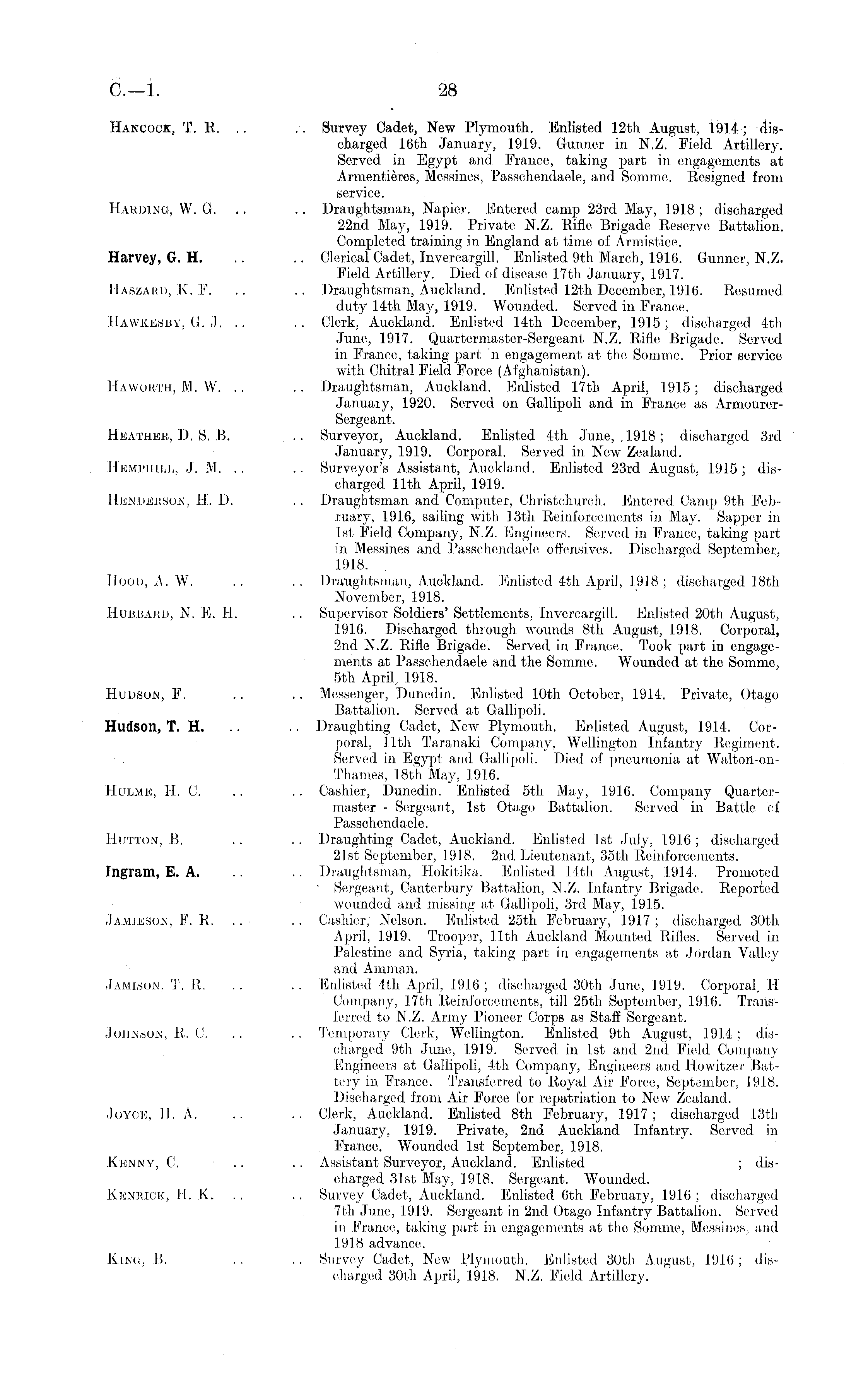 Hancock, T. R. .. .. Survey Cadet, New Plymouth. Enlisted 12th August, 1914; discharged 16th January, 1919. Gunner in N.Z. Field Artillery. Served in Egypt and France, taking part in engagements at Armentieres, Mcssines, Passchendaele, and Somme. Resigned from service. HardinG, W. G. .. .. Draughtsman, Napier. Entered camp 23rd May, 1918 ; discharged 22nd May, 1919. Private, N.Z. Rifle Brigade Reserve Battalion. Completed training in England at time of Armistice. Harvey, G. H. .. .. Clerical Cadet, Invercargill. Enlisted 9th March, 1916. Gunner, N.Z. Field Artillery. Died of disease 17th January, 1917. Haszard, K. F. . . .. Draughtsman, Auckland. Enlisted 12th December, 1916. Resumed duty 14th May, 1919. Wounded. Served in France. Hawkesby, G. J. .. .. Clerk, Auckland. Enlisted 14th December, 1915; discharged 4th June, 1917. Quartermaster-Sergeant N.Z. Rifle Brigade. Served in France, taking part n engagement at the Somme. Prior service with Chitral Field Force- (Afghanistan). Ha worth, M. W. . . . . Draughtsman, Auckland. Enlisted 17th April, 1915 ; discharged January, 1920. Served on Gallipoli and in France as ArmourerSergeant. Heather, D. S. B. , .. Surveyor, Auckland. Enlisted 4th June, .1918; discharged 3rd January, 1919. Corporal. Served in Now Zealand. Hemphill, J. M. .. .. Surveyor's Assistant, Auckland. Enlisted 23rd August, 1915; discharged llth April, 1919. Henderson, H. D. .. Draughtsman and Computer, Christchurch. Entered. Camp 9th February, 1916, sailing with 13th Reinforcements in May. Sapper in Ist Field Company, N.Z. Engineers. Served in France, taking partin Messines and Passchendaele offensives. Discharged September, 1918. Hood, A. W. .. .. Draughtsman, Auckland. Enlisted 4th April, 1918 ; discharged 18th November, 1918. HUBBARD, N. E. 11. . . Supervisor Soldiers' Settlements, Invercargill. Enlisted 20th August, 1916. Discharged through wounds Bth August, 1918. Corporal, 2nd N.Z. Rifle Brigade. Served in France. Took part in engagements at Passchendaele and the Somme. Wounded at the Somme, sth April, 1918. Hudson, F. .. .. Messenger, Dunedin. Enlisted 10th October, 1914. Private, Otago Battalion. Served at Gallipoli. Hudson, T. H. . . .. Draughting Cadet, New Plymouth. Enlisted August, 19.1.4. Corporal, llth Taranaki Company, Wellington Infantry Regiment. Served in Egypt and Gallipoli. Died of pneumonia at Walton-on-Tham.es, 18th May, 1916. Hulme, H, C. .. .. Cashier, Dunedin. Enlisted sth May, 1916. Company Quartermaster - Sergeant, Ist Otago Battalion. Served in Battle of Passchendaele. Hutton, B. .. .. Draughting Cadet, Auckland. Enlisted Ist July, 1916; discharged 21st September, 1918. 2nd Lieutenant, 35th Reinforcements. Ingram, E. A. .. .. Draughtsman, Hokitika. Enlisted 14th August, 1914. Promoted Sergeant, Canterbury Battalion, N.Z. Infantry Brigade. Reported wounded and missing at Gallipoli, 3rd May, 1915. Jamieson, F. R. .. .. Cashier, Nelson. Enlisted 25th February, 1917 ; discharged 30th April, 1919. Trooper, llth Auckland Mounted Rifles. Served in Palestine and Syria, taking part in engagements at Jordan Valley and Amman. Jamison, T. R. .. .. Enlisted 4th April, 1916; discharged 30th June, 1919. Corporal. H Company, 17th Reinforcements, till 25th September, 1916. Transferred to N.Z. Army Pioneer Corps as Staff Sergeant. Johnson, R. C, .. .. Temporary Clerk, Wellington. Enlisted 9th August, 1914; discharged 9th June, 1919. Served in Ist and 2nd Field Company Engineers at Gallipoli, 4th Company, Engineers and Howitzer Battery in France. Transferred to Royal Air Force, September, 1918. Discharged from Air Force for repatriation to New Zealand. Joyce, 11. A. .. .. Clerk, Auckland. Enlisted Bth February, 1917; discharged 13th January, 1919. Private, 2nd Auckland Infantry. Served in France. Wounded Ist September, 1918. Kenny, C. .. .. Assistant Surveyor, Auckland. Enlisted ; discharged 31st May, 1918. Sergeant. Wounded. Kenrick, 11. K. .. .. Survey Cadet, Auckland. Enlisted 6th February, 1916 ; discharged 7th June, 1919. Sergeant in 2nd Otago Infantry Battalion. Served in France, taking part in engagements at the Somme, Messines, and 1918 advance. Kino, 15. .. .. Survey Cadet, New Plymouth. Enlisted 30th August, .1916; discharged 30th April, 1918. N.Z. Field Artillery.