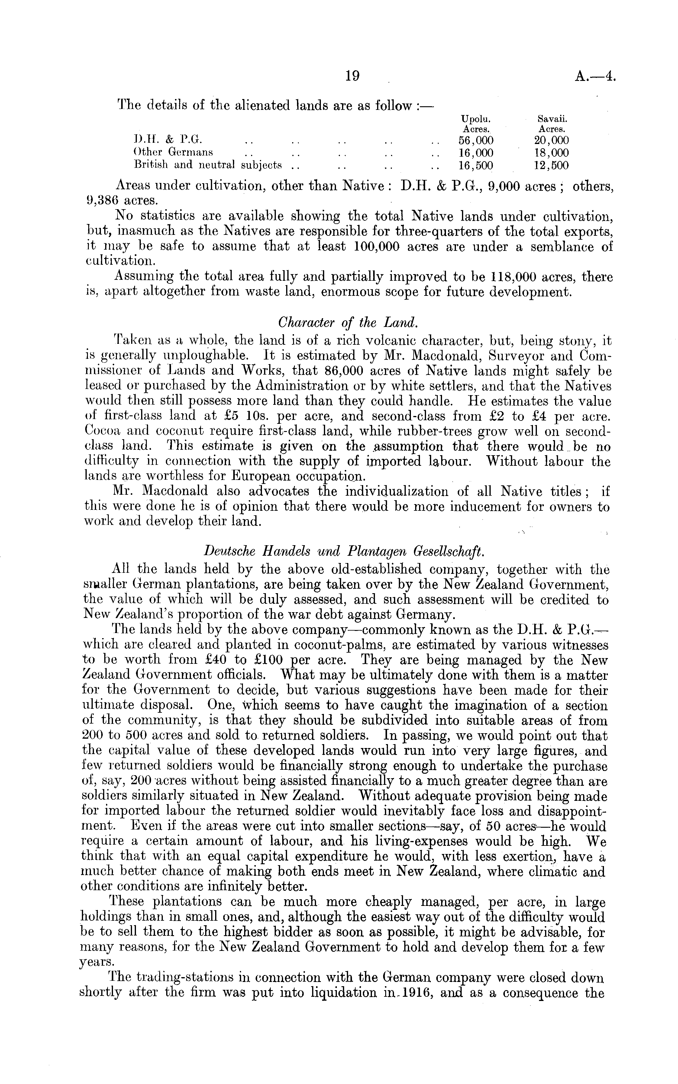 The details of the alienated lands are as follow :— Upolu. Savaii. Acres. Acres. D.H. & P.G. .. .. .. .. .. 56,000 20,000 Other Germans .. .. .. .. .. 16,000 18,000 British and neutral subjects .. .. .. .. 16,500 12,500 Areas under cultivation, other than Native : D.H. & P.G., 9,000 acres ; others, 9,386 acres. No statistics are available showing the total Native lands under cultivation, but, inasmuch as the Natives are responsible for three-quarters of the total exports, it may be safe to assume that at least 100,000 acres are under a semblance of cultivation. Assuming the total area fully and partially improved to be 118,000 acres, there is, apart altogether from waste land, enormous scope for future development. Character of the Land. Taken as a whole, the land is of a rich volcanic character, but, being stony, it is generally unploughable. It is estimated by Mr. Macdonald, Surveyor and Commissioner of Lands and Works, that 86,000 acres of Native lands might safely be leased or purchased by the Administration or by white settlers, and that the Natives would then still possess more land than they could handle. He estimates the value of first-class land at £5 10s. per acre, and second-class from £2 to £4 per acre. Cocoa and coconut require first-class land, while rubber-trees grow well on secondclass land. This estimate is given on the assumption that there would be no difficulty in connection with the supply of imported labour. Without labour the lands are worthless for European occupation. Mr. Macdonald also advocates the individualization of all Native titles ; if this were done he is of opinion that there would be more inducement for owners to work and develop their land. o i Deutsche Handels und Plantagen Gesellschaft. All the lands held by the above old-established company, together with the smaller German plantations, are being taken over by the New Zealand Government, the value of which will be duly assessed, and such assessment will be credited to New Zealand's proportion of the war debt against Germany. The lands held by the above company —commonly known as the D.H. & P.G.— which are cleared and planted in coconut-palms, are estimated by various witnesses to be worth from £40 to £100 per acre. They are being managed by the New Zealand Government officials. What may be ultimately done with them is a matter for the Government to decide, but various suggestions have been made for their ultimate disposal. One, Which seems to have caught the imagination of a section of the community, is that they should be subdivided into suitable areas of from 200 to 500 acres and sold to returned soldiers. In passing, we would point out that the capital value of these developed lands would run into very large figures, and few returned soldiers would be financially strong enough to undertake the purchase of, say, 200 acres without being assisted financially to a much greater degree than are soldiers similarly situated in New Zealand. Without adequate provision being made for imported labour the returned soldier would inevitably face loss and disappointment. Even if the areas were cut into smaller sections —say, of 50 acres —he would require a certain amount of labour, and his living-expenses would be high. We think that with an equal capital expenditure he would, with less exertion, have a much better chance of making both ends meet in New Zealand, where climatic and other conditions are infinitely better. These plantations can be much more cheaply managed, per acre, in large holdings than in small ones, and, although the easiest way out of the difficulty would be to sell them to the highest bidder as soon as possible, it might be advisable, for many reasons, for the New Zealand Government to hold and develop them for a few years. The trading-stations in connection with the German company were closed down shortly after the firm was put into liquidation in 1916, and as a consequence the