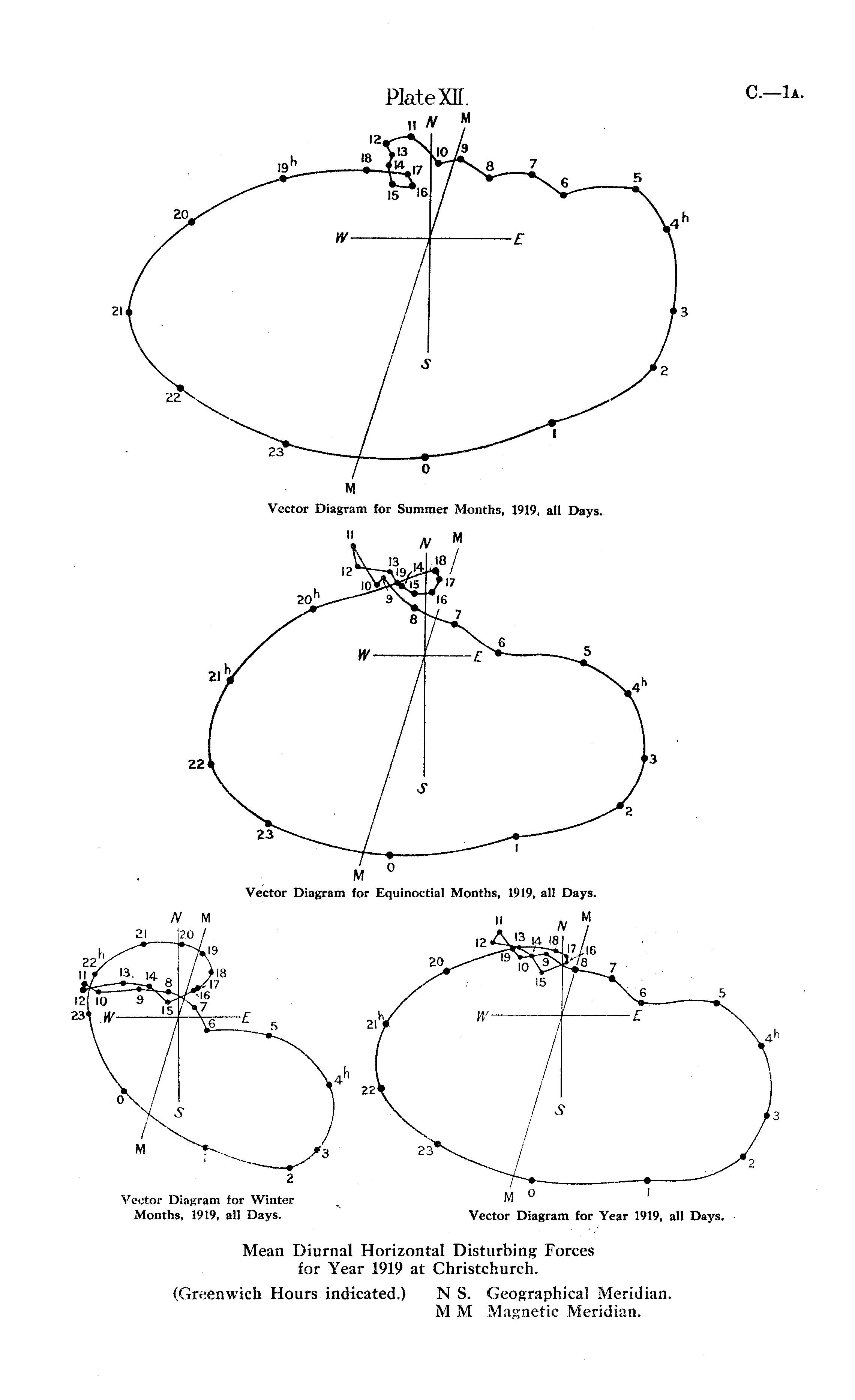 Mean Diurnal Horizontal Disturbing Forces for Year 1919 at Christchurch. (Greenwich Hours indicated.) NS. Geographical Meridian. M M Magnetic Meridian.