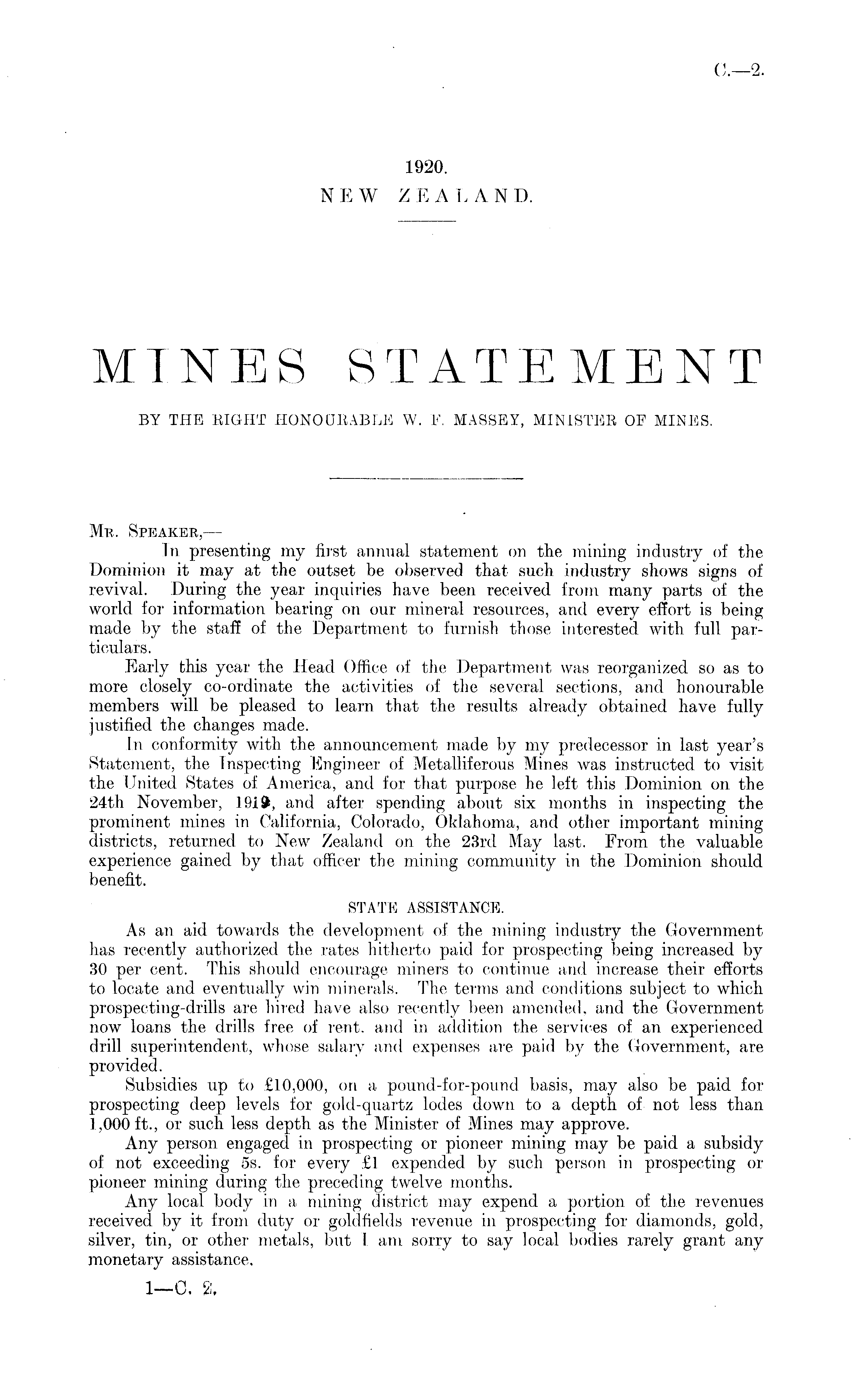 MINES STATEMENT BY THE RIGHT HONOURABLE W. F. MASSEY, MINISTER OF MINES.