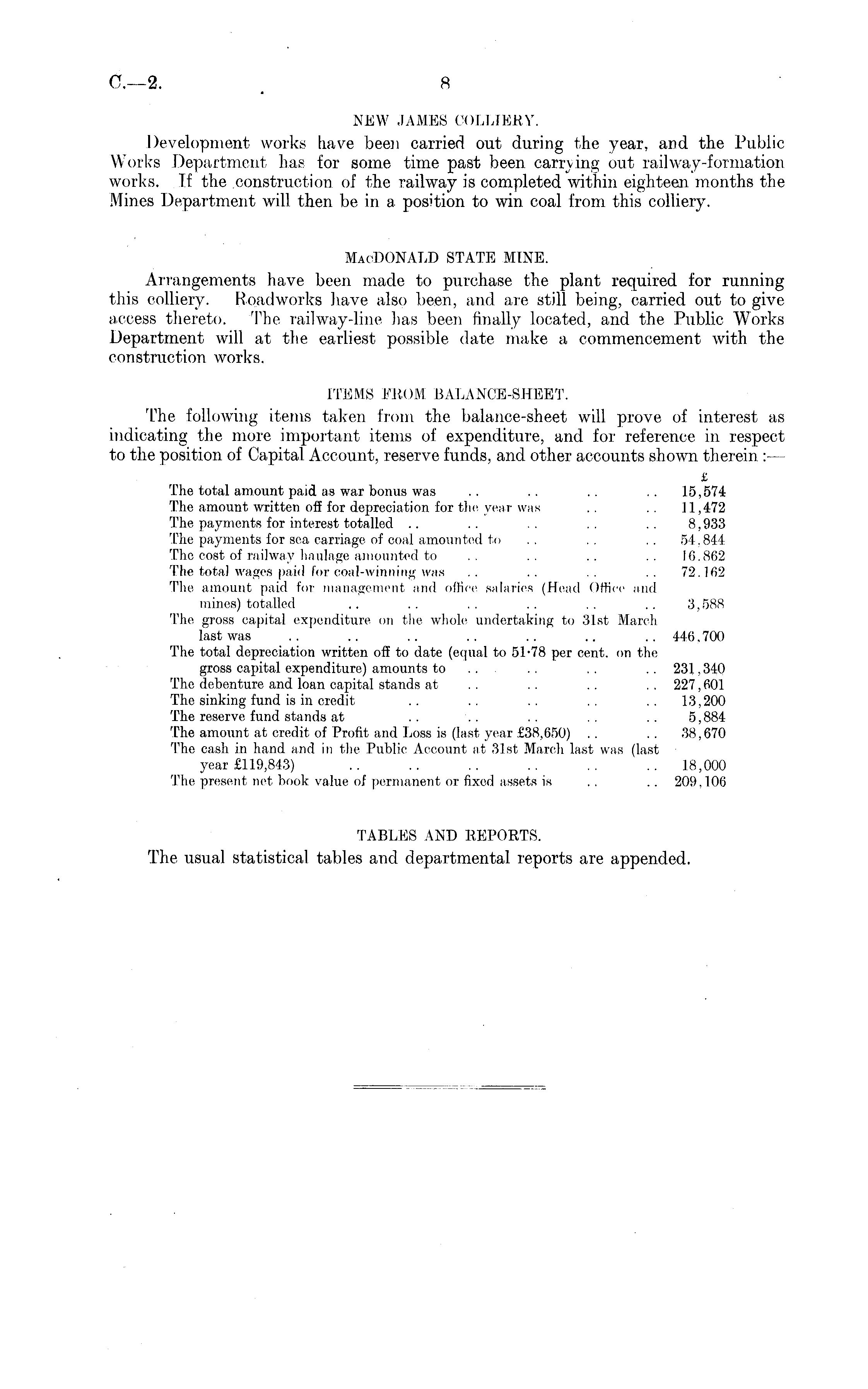 NEW JAMES COLLIERY. Development works have been carried out during the year, and the Public Works Department has for some time past been carrying out railway-formation works. If the construction of the railway is completed within eighteen months the Mines Department will then be in a position to win coal from this colliery. MacDONALD STATE MINE. Arrangements have been made to purchase the plant required for running this colliery. Roadworks have also been, and are still being, carried out to give access thereto. The railway-line has been finally located, and the Public Works Department will at the earliest possible date make a commencement with the construction works. [TE MS FE() M BA LANCE-8118 ET. The following items taken from the balance-sheet will prove of interest as indicating the more important items of expenditure, and for reference in respect to the position of Capital Account, reserve funds, and other accounts shown therein :— £ The total amount paid as war bonus was .. .. .. .. 15,574 The amount written off for depreciation for the year was .. .. 11,472 The payments for interest totalled .. .. .. .. .. 8,933 The payments for sea carriage of coal amounted to .. .. .. 54.844 The cost of railway haulage amounted to .. .. .. 16.862 The total wages paid for coal-winning was .. .. .. .. 72.162 The amount paid for management and office salaries (Head Office and mines) totalled .. .. .. .. .. .. 3.588 The gross capital expenditure on the whole undertaking to 31 si March last was .. .. .. .. .. .. .. 446.700 The total depreciation written oft' to date (equal to 51-78 per cent, on the gross capital expenditure) amounts to .. .. .. .. 231,340 The debenture and loan capital stands at .. .. .. .. 227,601 The sinking fund is in credit .. .. .. .. .. 13,200 The reserve fund stands at .. .. .. 5,884 The amount at credit of Profit and Loss is (last year £38,650) .. .. 38,670 The cash in hand and in the Public Account at 31st March last was (last year £119,843) .. .. .. .. .. .. 18,000 The present net book value of permanent or fixed assets is .. .. 209.106 TABLES AND REPOBTS. The usual statistical tables and departmental reports are appended.