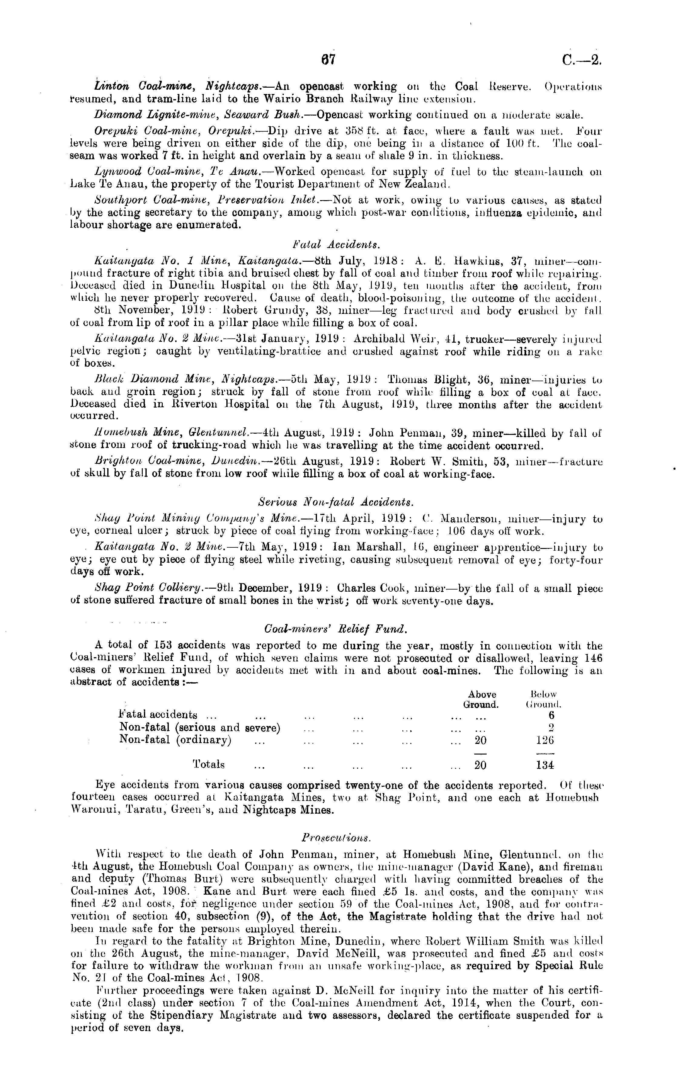 Linton Coal-mine, Nightcaps. —An opencast working on the Coal Reserve. Operations resumed, and tram-line laid to the Wairio Branch Railway line extension. Diamond Lignite-mine, Seaward Bush. —Opencast working continued on a moderate scale. Orepuki Coal-mine, Orepuki. —Dip drive at 358 ft. at face, where a fault was met. Four levels were being driven on either side of the dip, one being in a distance of 100 ft. The coalseam was worked 7 ft. in height and overlain by a seam of shale 9 in. in thickness. Lynwood Coal-mine, Te Anau. —Worked opencast for supply of fuel to the steam-launch on Lake Te Anau, the property of the Tourist Department of New Zealand. Southport Goal-mine, Preservation Inlet. —Not at work, owing to various causes, as stated by the acting secretary to the company, among which post-war conditions, influenza epidemic, and labour shortage are enumerated. Fatal Accidents. Kaitangata No. 1 Mine, Kaitangata. —Bth July, 1918: A. E. Hawkins, 37, miner—compound fracture of right tibia and bruised chest by fall of coal and timber from roof while repairing. Deceased died in Dunedin Hospital on the Bth May, 1919, ten months after the accident, from which he never properly recovered. Cause of death, blood-poisoning, the outcome of the accident. Bth November, 1919: Robert Grundy, 38, miner—leg fractured and body crushed by fall of coal from lip of roof in a pillar place while filling a box of coal. Kaitangata No. 2 Mine. —31st January, 1919 : Archibald Weir, 41, trucker—severely injured pelvic region; caught by ventilating-brattice and crushed against roof while riding on a rake of boxes. Black Diamond Mine, Nightcaps. —sth May, 1919 : Thomas Blight, 36, miner—injuries to back and groin region; struck by fall of stone from roof while filling a box of coal ai face Deceased died in Riverton Hospital on the 7th August, 1919, three months after the accident occurred. Homebush Mine, Glentunnel. —4th August, 1919 : John Peuiuan, 39, miner—-killed by fall of stone from roof of trucking-road which he was travelling at the time accident occurred. Brighton Coal-mine, Dunedin. —26th August, 1919: Robert W. Smith, 53, miner—fracture of skull by fall of stone from low roof while filling a box of coal at working-face. Serious Non-fatal Accidents. Shay Point Mining Company's Mine. —l7th April, 1919: ('. Mauderson, miner—injury to eye, corneal ulcer; struck by piece of coal flying from working-face; 106 days off work. Kaitangata No. 2 Mine. —7th May, 1919: lan Marshall, 16, engineer apprentice—injury to eye; eye out by piece of flying steel while riveting, causing subsequent removal of eye; forty-four days off work. Shag Point Colliery. —9th December, 1919 : Charles Cook, miner—by the fall of a small piece of stone suffered fracture of small bones in the wrist; off work seventy-one days. Coal-miners' Relief Fund. A total of 153 accidents was reported to me during the year, mostly in connection with the Coal-miners' Relief Fund, of which seven claims were not prosecuted or disallowed, leaving 146 eases of workmen injured by accidents met with in and about coal-mines. The following is an abstract of accidents:— Above Below Ground. Ground. Fatal accidents ... ... ... ... ... 6 Non-fatal (serious and severe) ... ... ... 2 Non-fatal (ordinary) ... ... ... ... ... 20 126 Totals ... ... ... ... ... 20 134 Eye accidents from various causes comprised twenty-one of the accidents reported. Of these fourteen cases occurred at Kaitangata Mines, two at Shag Point, and one each at Homebush Waronui, Taratu, Green's, and Nightcaps Mines. Prosecutions. With respect to the death of John Penman, miner, at Homebush Mine, Glentunnel. on the 4th August, the Homebush Coal Company as owners, I he mine-manager (David Kane), and fireman and deputy (Thomas Burt) were subsequently charged with having committed breaches of the Coal-mines Act, 1908. Kane and Burt were each fined .£5 Is. and costs, and the company was fined £2 and costs, for negligence under section 59 of the Coal-mines Act, 1908, and for contravention of section 40, subsection (9), of the Act, the Magistrate holding that the drive had not been made safe for the persons employed therein. In regard to the fatality at Brighton Mine, Dunedin, where Robert William Smith was killed on the 26th August, the mine-manager, David McNeill, was prosecuted and fined £5 and costs for failure to withdraw the workman from an unsafe working-place, as required by Special Rule No. 21 of the Coal-mines Act, 1908. further proceedings were taken against D. McNeill for inquiry into the matter of his certificate (2nd class) under section 7 of the Coal-mines Amendment Act, 1914, when the Court, consisting of the Stipendiary Magistrate and two assessors, declared the certificate suspended for a period of seven days.