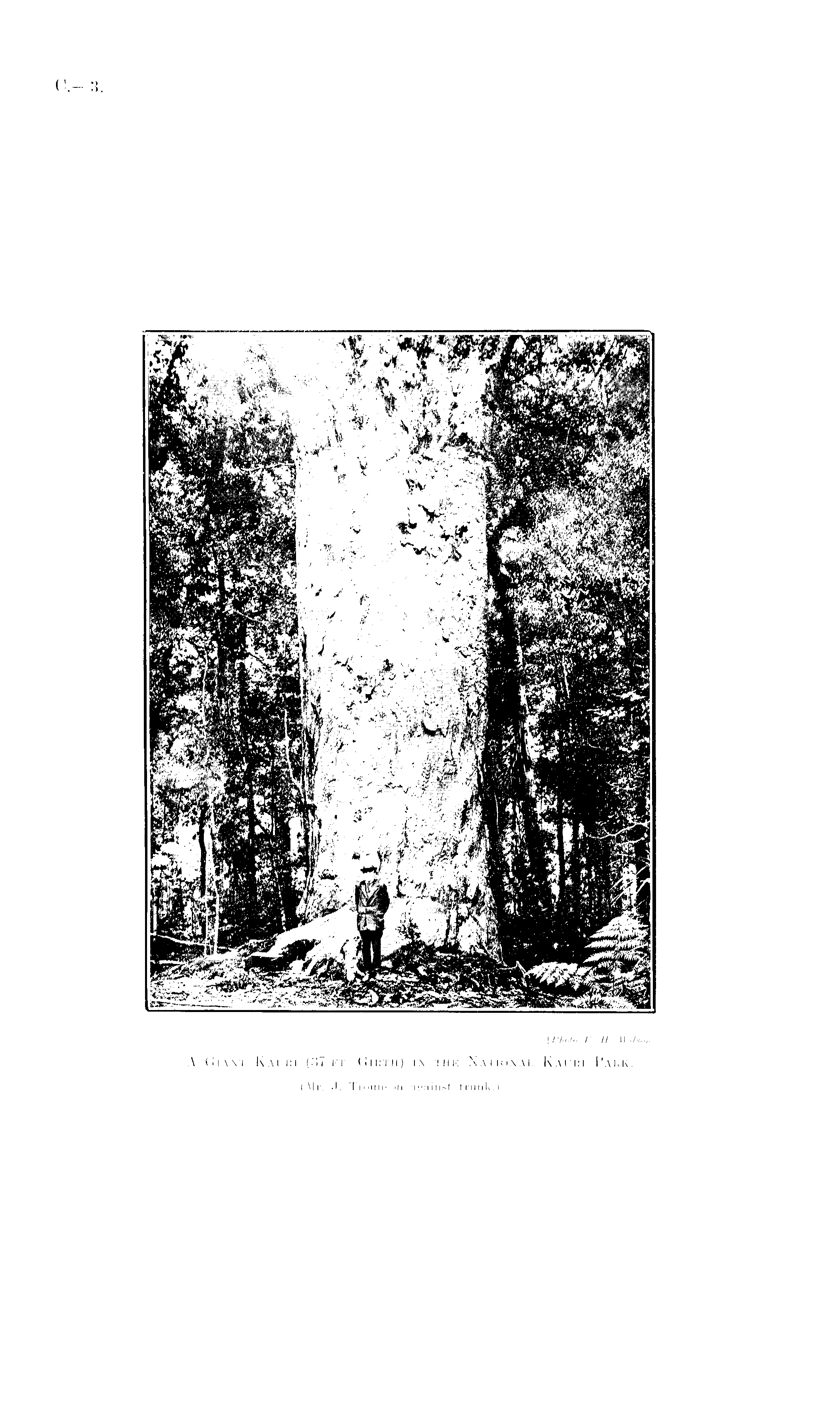 A Giant Kauri (37 ft. Girth) in the National Kauri Park. (Mr. J. Trounson against trunk.)