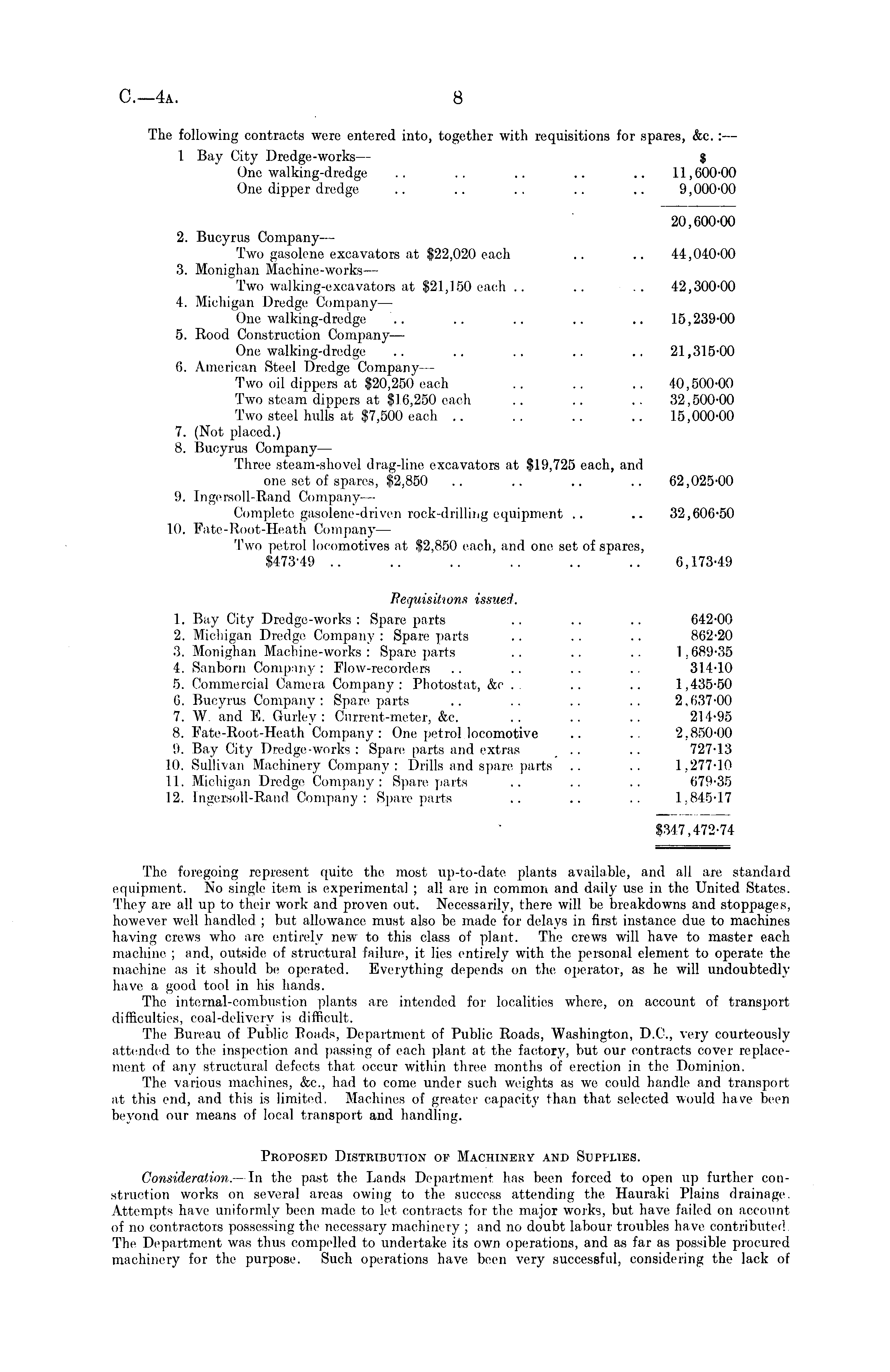 The following contracts were entered into, together with requisitions for spares, &c. : — 1 Bay City Dredge-works— $ One walking-dredge .. .. .. .. .. 11,600-00 One dipper dredge .. .. .. .. .. 9,000-00 20,600-00 2. Bucyrus Company— Two gasolene excavators at $22,020 each .. .. 44,040-00 3. Monighan Machine-works — Two walking-excavators at $21,150 each .. .. .. 42,300-00 4. Michigan Dredge Company— One walking-dredge .. .. .. .. .. 15,239-00 5. Rood Construction Company— One walking-dredge .. .. .. .. .. 21,315-00 6. American Steel Dredge Company — Two oil dippers at $20,250 each . . .. .. 40,500-00 Two steam dippers at $16,250 each .. .. .. 32,500-00 Two steel hulls at $7,500 each .. .. .. .. 15,000-00 7. (Not placed.) 8. Bucyrus Company — Three steam-shovel drag-line excavators at $19,725 each, and one set of spares, $2,850 .. .. .. .. 62,025-00 9. Tngersoll-Rand Company— Complete gasolene-driven rock-drilling equipment .. .. 32,606-50 10. Fate-Root-Heath Company — Two petrol locomotives at $2,850 each, and one set of spares, $473-49 .. .. .. .. .. .. 6,173-49 Requisitions issued. 1. Bay City Dredge-works: Spare parts .. .. .. 642-00 2. Michigan Dredge Company: Spare parts .. .. .. 862-20 3. Monighan Machine-works: Spare parts .. .. .. 1,689-35 4. Sanborn Company : Flow-recorders .. .. .. .. 314-10 5. Commercial Camera Company: Photostat, &c . . .. .. 1,435-50 6. Bucyrus Company: Spare parts .. .. .. .. 2,637-00 7. W. and E. Gurley : Current-meter, &c. .. .. .. 214-95 8. Fate-Root-Heath Company: One petrol locomotive .. .. 2.850-00 9. Bay City Dredge-works : Spare parts and extras .. .. 727-13 10. Sullivan Machinery Company: Drills and spare parts .. .. 1,277-10 11. Michigan Dredge Company : Spare parts .. .. .. 679-35 12. Ingersoll-Rand Company: Spare parts .. .. .. 1,845-17 $347,472-74 The foregoing represent quite the most up-to-date plants available, and all are standard equipment. No single item is experimental ; all are in common and daily use in the United States. They are all up to their work and proven out. Necessarily, there will be breakdowns and stoppages, however well handled ; but allowance must also be made for delays in first, instance due to machines having crews who are entirely new to this class of plant. The crews will have to master each machine ; and, outside of structural failure, it lii"' entirely with the personal element to operate the machine as it should be operated. Everything depends on the operator, as he will undoubtedly have a good tool in his hands. The internal-combustion plants are intended for localities where, on account of transport difficulties, coal-delivery is difficult. The Bureau of Publio Boads, Department of Public, Roads, Washington, D.C., very courteously attended to the inspection and passing of each plant at the factory, but our contracts cover replacement of any structural defects that occur within three months of erection in the Dominion. The various machines, &c, had to come under such weights as we could handle and transport at this end, and this is limited. Machines of greater capacity than that selected would have been beyond our means of local transport and handling. Proposed Distribution of Machinery and Supplies. Consideration. — In the past the Lands Department has been forced to open up further construction works on several areas owing to the success attending the. Hauraki Plains drainage. Attempts have uniformly been made to let contracts for the major works, but have failed on account of no contractors possessing the necessary machinery ; and no doubt labour troubles have contributed The Department was thus compelled to undertake its own operations, and as far as possible procured machinery for the purpose. Such operations have been very successful, considering the lack of