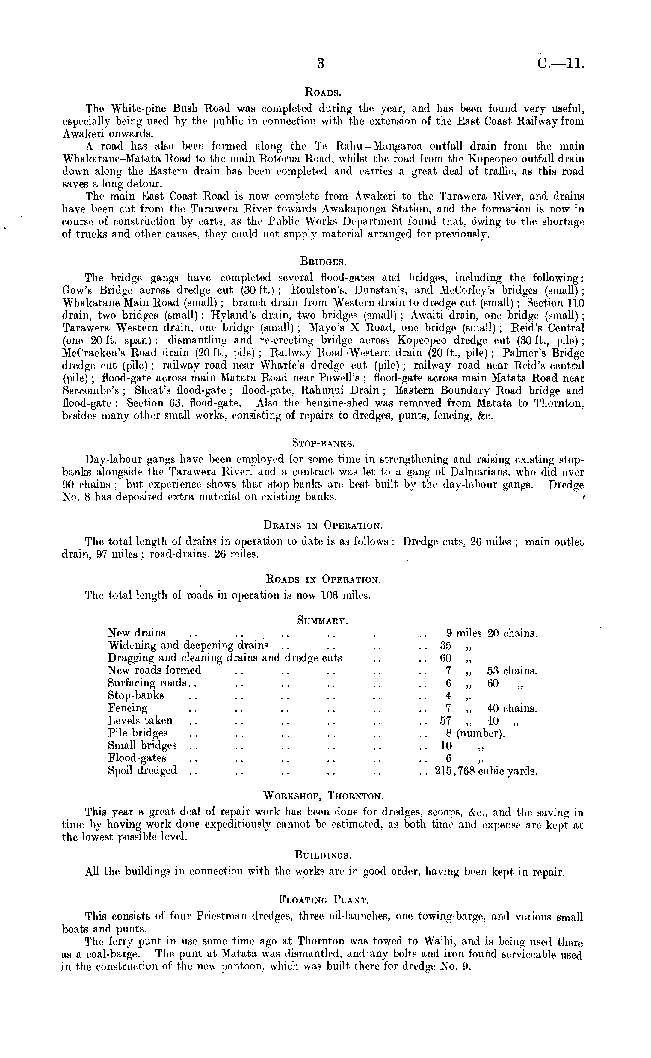 Roads. The White-pine Bush Road was completed during the year, and has been found very useful, especially being used by the public, in connection with the extension of the East Coast Railwayfrom Awakeri onwards. A road has also been formed along the Te Rahu-Mangaroa outfall drain from the main Whakatane-Matata Road to the main Rotorua Road, whilst the road from the Kopeopeo outfall drain down along the Eastern drain has been completed and carries a great deal of traffic, as this road saves a long detour. The main East Coast Road is now complete from Awakeri to the Tarawera River, and drains have been cut from the Tarawera River towards Awakaponga Station, and the formation is now in course of construction by carts, as the Public. Works Department found that, owing to the shortage of trucks and other causes, they could not supply material arranged for previously. Bridges. The bridge gangs have completed several flood-gates and bridges, including the following: Gow's Bridge across dredge cut (30ft.); Roulston's, Dunstan's, and McCorley's bridges (small); Whakatane Main Road (small) ; branch drain from Western drain to dredge cut (small) ; Section 110 drain, two bridges (small) ; Hyland's drain, two bridges (small) ; Awaiti drain, one bridge (small) ; Tarawera Western drain, one bridge (small) ; Mayo's X Road, one. bridge (small) ; Reid's Central (one 20ft. span); dismantling and re-erecting bridge across Kopeopeo dredge cut (30ft., pile); McCracken's Road drain (20 ft., pile); Railway Road-Western drain (20 ft., pile); Palmer's Bridge dredge cut (pile); railway road near Wharfe's dredge cut (pile); railway road near Reid's central (pile); flood-gate across main Matata Road near Powell's ; flood-gate across main Matata Road near Seccombe's ; Sheat's flood-gate ; flood-gate, Rahunui Drain ; Eastern Boundary Road bridge and flood-gate ; Section 63, flood-gate. Also the benzine-shed was removed from Matata to Thornton, besides many other small works, consisting of repairs to dredges, punts, fencing, &c. Stop-banks. Day-labour gangs have been employed for some time in strengthening and raising existing stopbanks alongside the Tarawera River, and a contract was let to a gang of Dalmatians, who did over 90 chains ; hut experience shows that stop-banks are best built by the day-labour gangs. Dredge No. 8 has deposited extra material on existing banks. / Drains tn Operation. The total length of drains in operation to date is as follows : Dredge cuts, 26 miles ; main outlet drain, 97 miles; road-drains, 26 miles. Roads in Operation. The total length of roads in operation is now 106 miles. Summary. New drains .. .. .. .. .. .. 9 miles 20 chains. Widening and deepening drains .. .. . . .. 35 ~ Dragging and cleaning drains and dredge cuts .. .. 60 ~ New roads formed .. .. . . . . . . 7 ~ 53 chains. Surfacing roads.. .. .. .. .. . . 6 ~ 60 ~ Stop-banks .. .. .. .. .. . . 4 ~ Fencing . . .. .. .. .. .. 7 „ 40 chains. Levels taken .. .. .. .. .. .. 57 ~ 40 „ Pile bridges .. .. . . .. .. . . 8 (number). Small bridges .. .. .. .. .. 10 ~ Flood-gates .. .. . . .. . . .. 6 ~ Spoil dredged .. .. .. .. .. .. 215,768 cubic yards. Workshop, Thornton. This year a great deal of repair work has been done for dredges, scoops, &c., and the saving in time by having work done expeditiously cannot be estimated, as both time and expense are kept at the lowest possible level. Buildings. All the buildings in connection with the works are in good order, having been kept in repair, Floating Plant. This consists of four Priestman dredges, three oil-launches, one towing-barge, and various small boats and punts. The ferry punt in use. some, time ago at Thornton was towed to Waihi, and is being used there as a coal-barge. The punt at Matata was dismantled, and any bolts and iron found serviceable used in the construction of the new pontoon, which was built there for dredge No. 9.