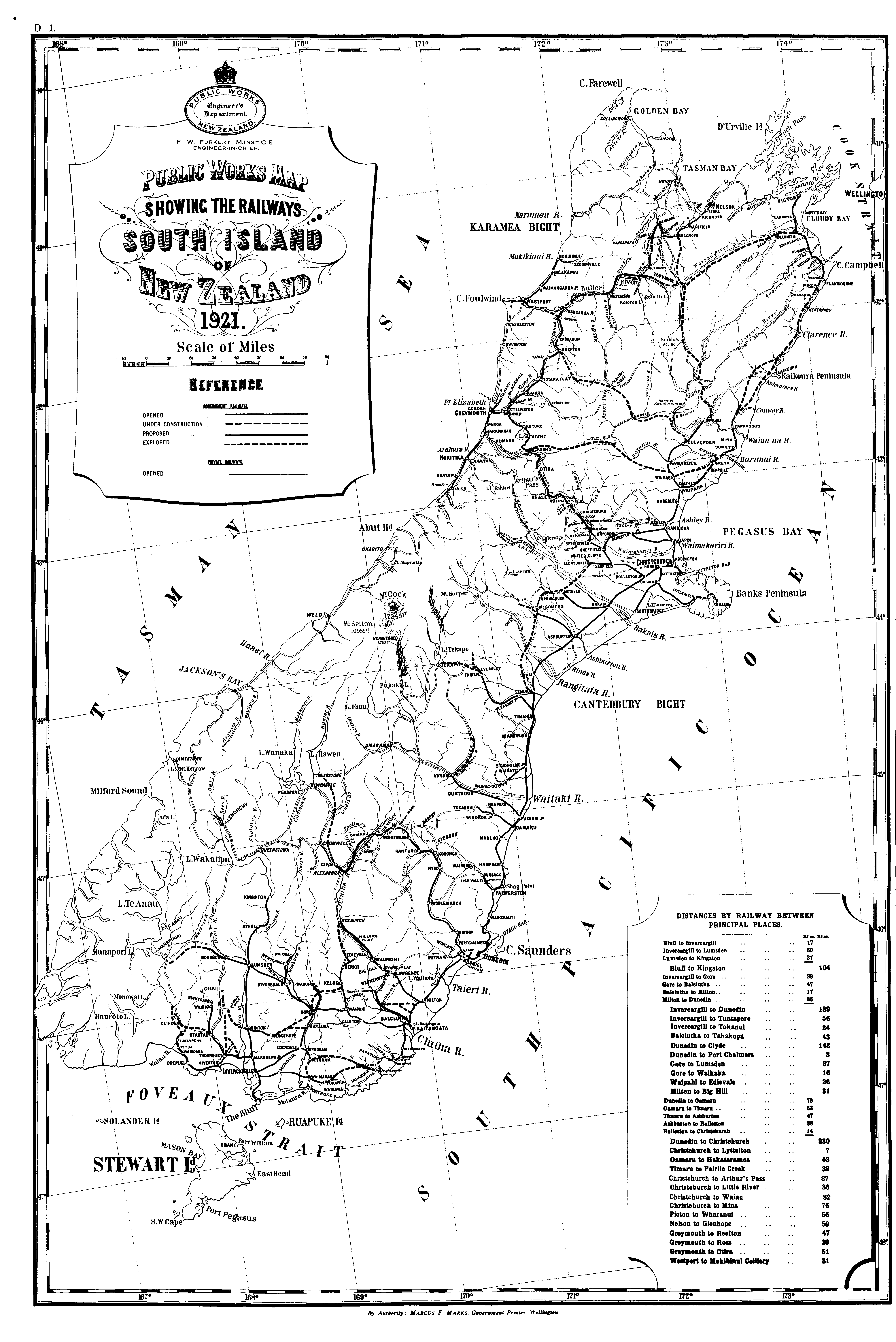 Public Works Map SHOWING THE RAILWAYS SOUTH ISLAND OF New Zealand 1921.