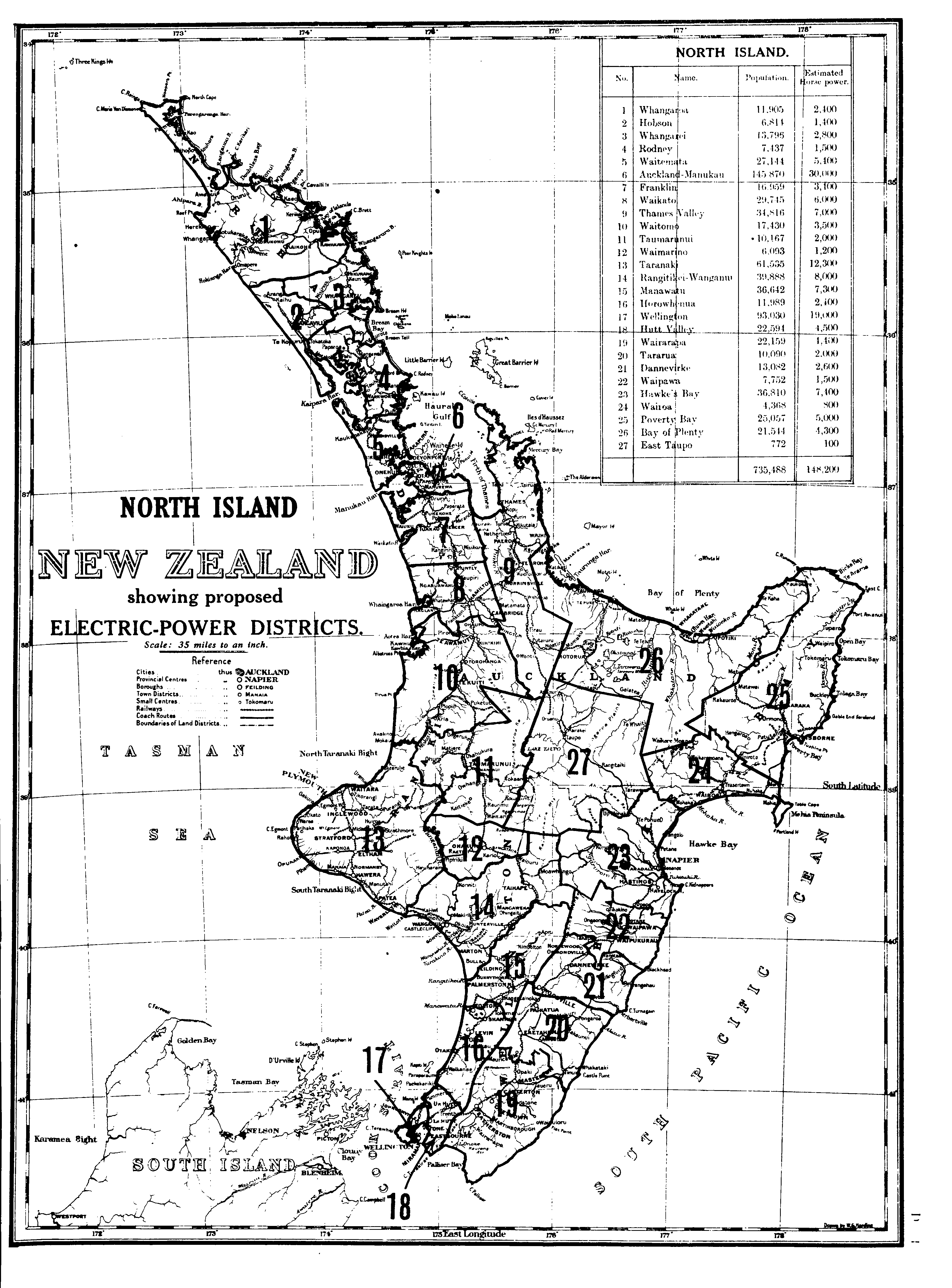 NORTH ISLAND NEW ZEALAND showing proposed ELECTRIC-POWER DISTRICTS.