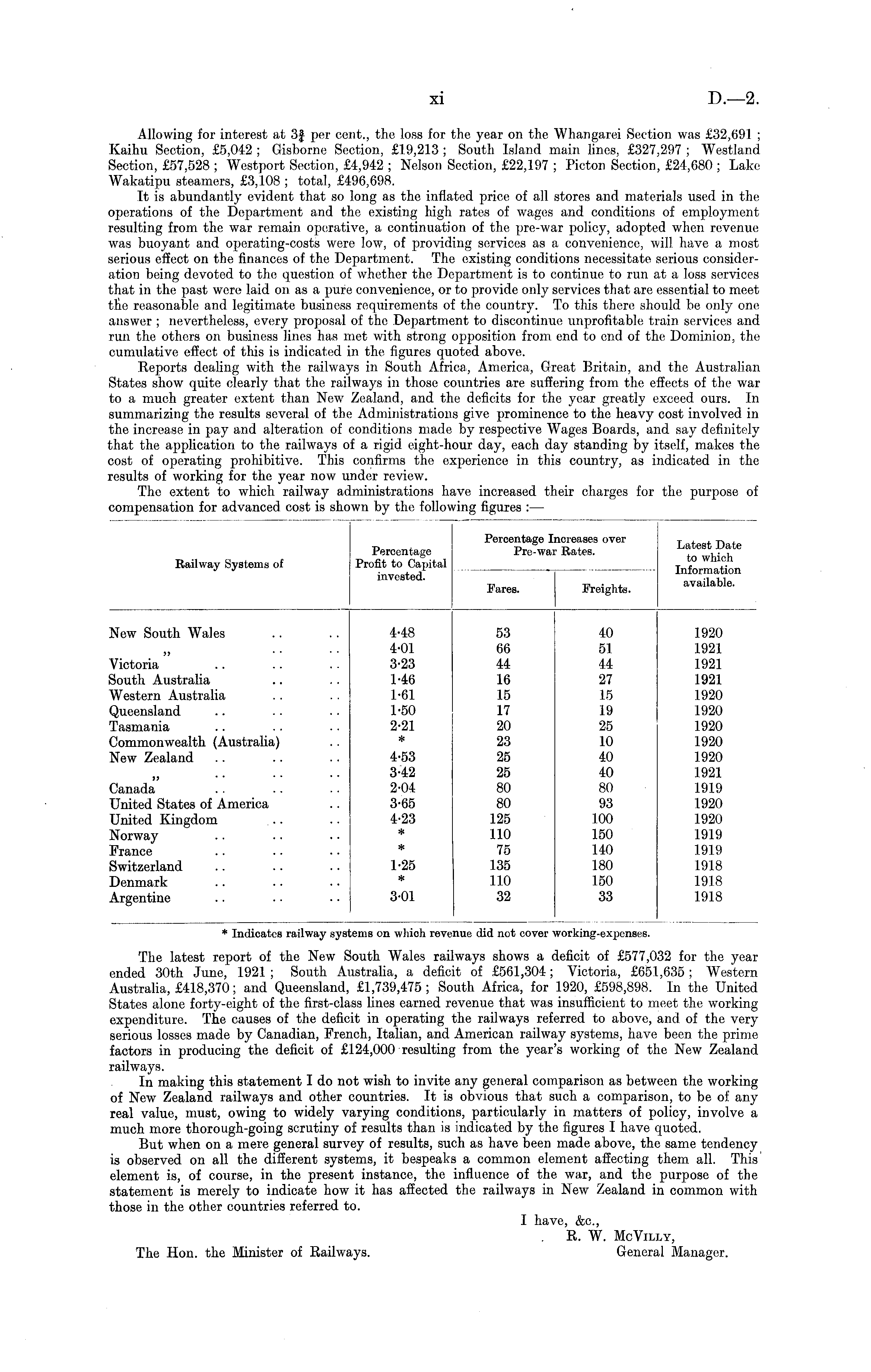 The latest report of the New South Wales railways shows a deficit of £577,032 for the year ended 30th June, 1921 ; South Australia, a deficit of £561,304; Victoria, £651,635 ; Western Australia, £418,370; and Queensland, £1,739,475; South Africa, for 1920, £598,898. In the United States alone forty-eight of the first-class lines earned revenue that was insufficient to meet the working expenditure. The causes of the deficit in operating the railways referred to above, and of the very serious losses made by Canadian, French, Italian, and American railway systems, have been the prime factors in producing the deficit of £124,000 resulting from the year's working of the New Zealand railways. In making this statement I do not wish to invite any general comparison as between the working of New Zealand railways and other countries. It is obvious that such a comparison, to be of any real value, must, owing to widely varying conditions, particularly in matters of policy, involve a much more thorough-going scrutiny of results than is indicated by the figures I have quoted. But when on a mere general survey of results, such as have been made above, the same tendency is observed on all the different systems, it bespeaks a common element affecting them all. This element is, of course, in the present instance, the influence of the war, and the purpose of the statement is merely to indicate how it has affected the railways in New Zealand in common with those in the other countries referred to. I have, &c, R. W. McVilly, The Hon. the Minister of Railways. General Manager.