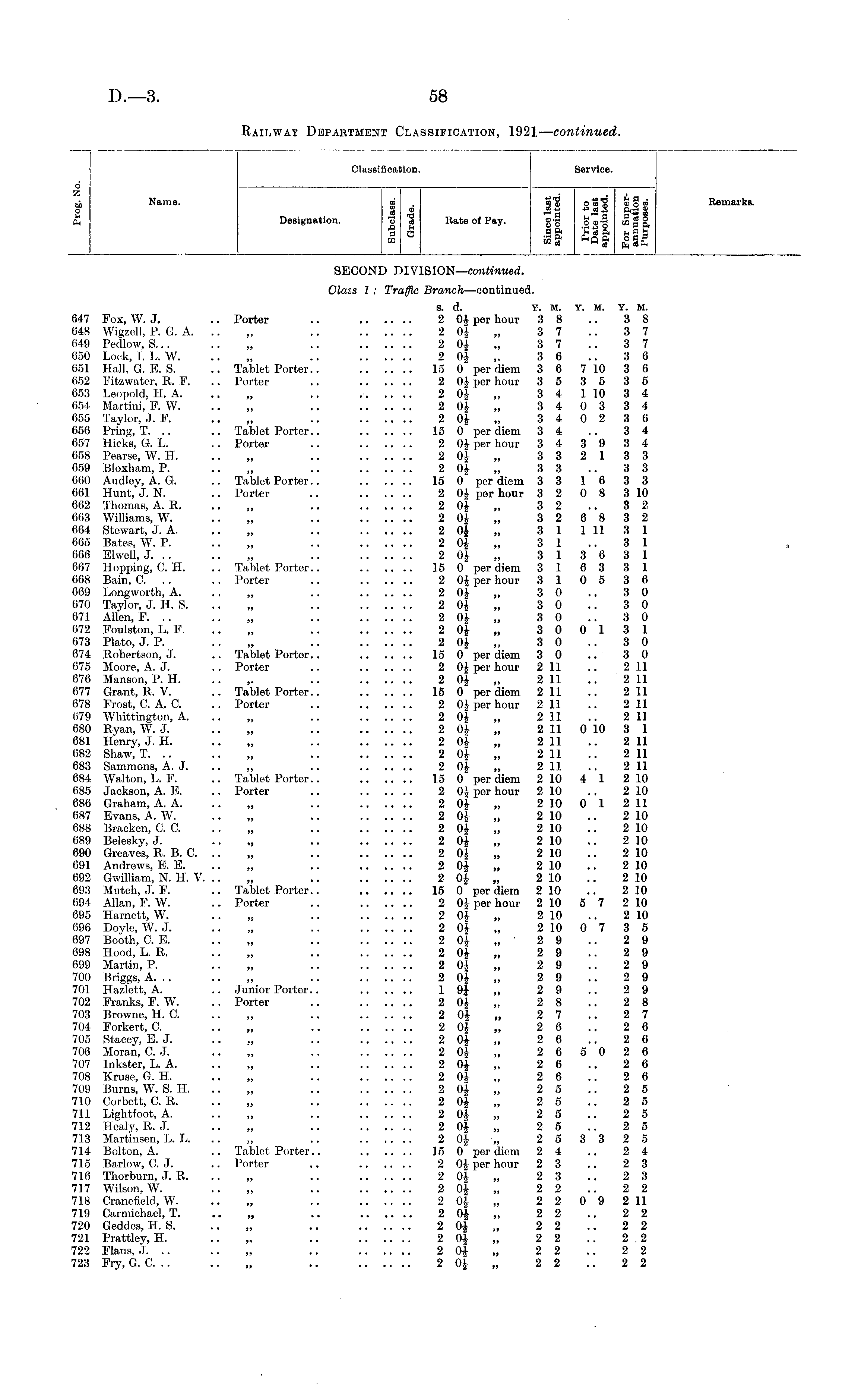Classification. Service. 6 cub © fa Ph Name. CO a £ 0 CO fa03 | | s! 0 gl sit fa~ a .2 So if 9 ft £ a - 9 O m am 5 r 5«o 0 04 t, a S O0? fe C3P-. Remarks. Designation. ■3 a ci Kate of Fay. SECOND DIVISION— continued. Class 1 : Traffic Branch —continued. 647 Fox, W. J. 648 Wigzell, P. G. A. 649 Pedlow, S... 650 Lock, I. L. W. 651 Hall, G. E. S. 652 Fitzwater, R. F. 653 Leopold, H. A. 654 Martini, F. W. 655 Taylor, J. F. 656 Pring, T. .. 657 Hicks, G. L. 658 Pearse, W. H. 659 Bloxham, P. 660 Audlev, A. G. 661 Hunt," J. N. 662 Thomas, A. R. 663 Williams, W. 664 Stewart, J. A. 665 Bates, W. P. 666 Elwell, J. .. 667 Hopping, C H. 668 Bain, C .. 669 Longworth, A. 670 Taylor, J. H. S. 671. Allen, F. .. 672 Foulston, L. F. 673 Plato, J. P. 674 Robertson, J. 675 Moore, A. J. 676 Manson, P. H. 677 Grant, R. V. 678 Frost, C. A. C 679 Whittington, A. 680 Ryan, W. J. 681 Henry, J. H. 682 Shaw, T. .. 683 Sammons, A. J. 684 Walton, L. F. 685 Jackson, A. E. 686 Graham, A. A. 087 Evans, A. W. 688 Bracken, C C 689 Belesky, J. 690 Greaves, R. B. C 691 Andrews, E. E. 692 Gwilliam, N. H. V. .. 693 Mutch. J. F. 694 Allan, F. W. 695 Harnett, W. 696 Doyle, W. J. 697 Booth, C. E. 698 Hood, L. R. 699 Martin, P. 700 Briggs, A. .. 701 Hazlctt, A. 702 Franks, F. W. 703 Browne, H. C. 704 Forkert, C 705 Stacey, E. J. 700 Moran, C. J. 707 Inkster, L. A. 708 Kruse, G. H. 709 Burns, W. S. H. 710 Corbett, C R. 711 Lightfoot, A. 712 Healy, R. J. 713 Martinseri, L. L. 714 Bolton, A. 715 Barlow, C J. 716 Thorburn, J. R. 717 Wilson, W. 718 Crancfiold, W. 719 Carmichael, T. 720 Geddes, H. S. 721 Prattley, H. 722 Flaus, J. 723 Fry, G. C. .. Porter Tablet Porter.. Porter Tablet Porter.. Portor 33 • • Tablet Porter.. Porter >» ■ * ii • • a • • Tablet Porter.. Porter ii • ■ Tablet Porter.. Porter Tablet Porter.. Porter 37 ■ • 33 • • Tablet Porter.. Porter 31 • • II • * Tablet Porter.. Porter 19 • • 11 • • Junior Porter.. Porter ii • • a • • ii • • 13 • * 11 • • Tablet Porter.. Porter a • • a • • tt • • 11 • • 8. d. Y. M. 2 0i per hour 3 8 2 0J „ 3 7 2 0* „ 3 7 2 0-J ,. 3 6 15 0 per diem 3 6 2 0J per hour 3 5 2 OJ „ 3 4 2 0J „ 3 4 2 0J „ 3 4 15 0 per diem 3 4 2 0i per hour 3 4 2 OJ „ 3 3 2 0J „ 3 3 15 0 per diem 3 3 2 0J per hour 3 2 2 0J „ 3 2 2 0J „ 3 2 2 Of „ 3 1 2 0J „ 3 1 2 0J „ 3 1 15 0 per diem 3 1 2 0J per hour 3 1 2 OJ „ 3 0 2 04 „ 3 0 2 0* „ 3 0 2 Of „ 3 0 2 0* „ 3 0 15 0 per diem 3 0 2 0J per hour 2 11 2 0J „ 2 11 15 0 per diem 2 11 2 OJ per hour 2 11 2 Of 2 11 2 0J „ 2 11 2 0* „ 2 11 2 0i „ 2 11 2 Of „ 2 11 15 0 per diem 2 10 2 0J per hour 2 10 2 0J „ 2 10 2 0* „ 2 10 2 0J „ 2 10 2 0J „ 2 10 2 0J „ 2 10 2 0J „ 2 10 2 0* „ 2 10 15 0 per diem 2 10 2 0* per hour 2 10 2 0*" „ 2 10 2 0J „ 2 10 2 0i „ • 2 9 2 0i „ 2 9 2 0i „ 2 9 2 0J „ 2 9 1 9J „ 2 9 2 Of „ 2 8 2 0J „ 2 7 2 Of „ 2 0 2 Of „ 2 6 2 0J „ 2 6 2 0J „ 2 6 2 0* „ 2 0 2 0J „ 2 5 2 0J „ 2 5 2 0J „ 2 5 2 0J „ 2 5 2 0J „ 2 5 16 0 per diem 2 4 2 0J per hour 2 3 2 Of „ 2 3 2 0J „ 2 2 2 0J „ 2 2 2 Of „ 2 2 2 0J „ 2 2 2 0* „ 2 2 2 0J „ 2 2 2 Of „ 2 2 Y. M. 7 io 3 5 1 10 0 3 0 2 3"9 2 1 l'fl 0 8 6 8 1 11 s'e 6 3 0 5 0 1 o io 4 1 o"i 5 7 o"7 s"o 3 3 o"9 Y. M. 3 8 3 7 3 7 3 6 3 fl 3 5 3 4 3 4 3 fl 3 4 3 4 3 3 3 3 3 3 3 10 3 2 3 2 3 1 3 1 3 1 3 1 3 6 3 0 3 0 3 0 3 I 3 0 3 0 2 11 2 11 2 11 2 11 2 11 3 1 2 11 2 11 2 11 2 10 2 10 2 11 2 10 2 10 2 10 2 10 2 10 2 10 2 10 2 10 2 10 3 5 2 9 2 9 2 9 2 9 2 9 2 8 2 7 2 6 2 6 2 6 2 6 2 6 2 5 2 5 2 5 2 5 2 5 2 4 2 3 2 3 2 2 2 11 2 2 2 2 2 ,2 2 2 2 2 ■