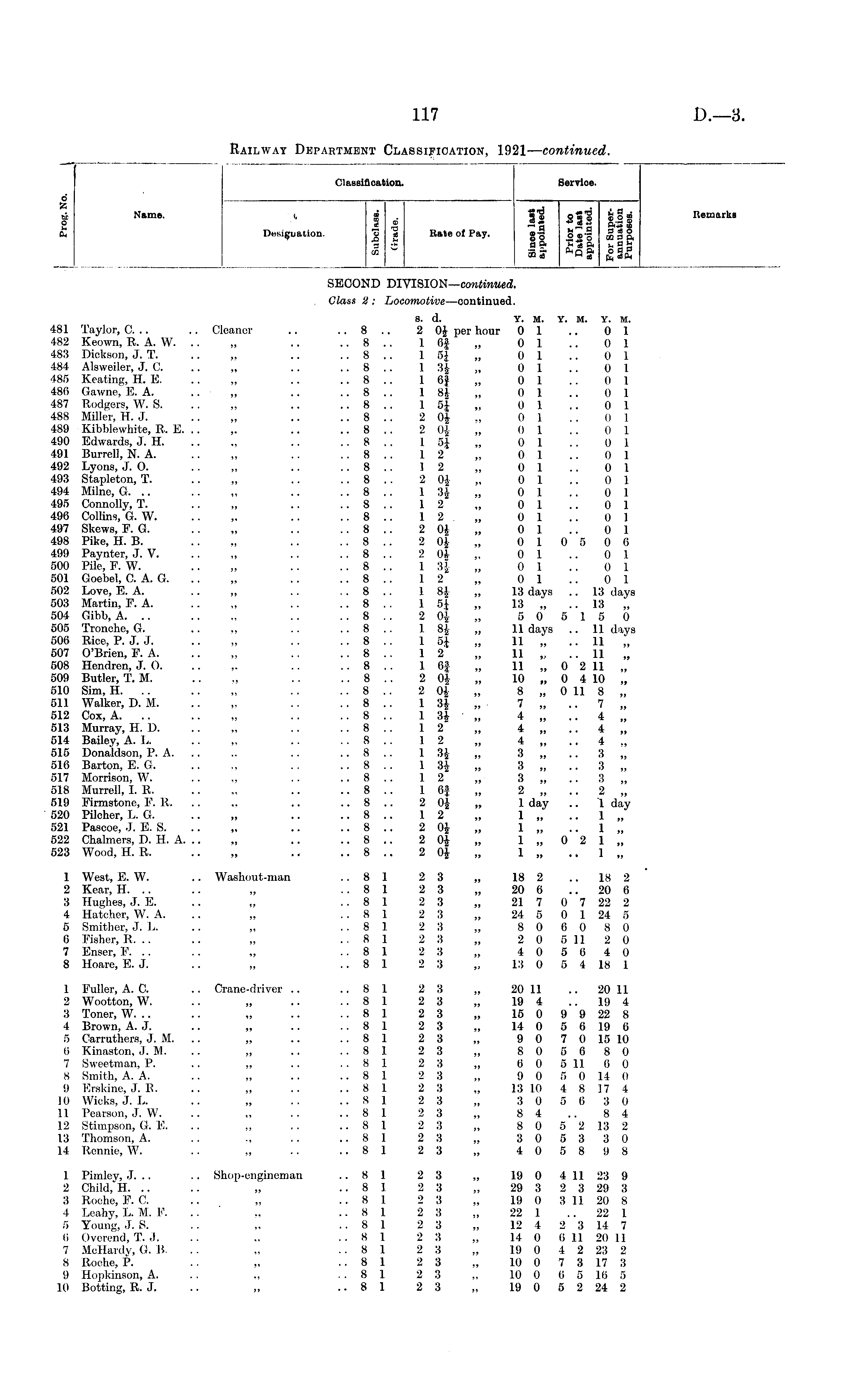 Classification. Seryice. 6 A A o fa a Name. Dchiguation. 0. s A | J CO w Rate of Pay. 3 i if .9 S CO 3 -Sis fa- 3 52'3 if 1 2 1 a Q n Mi ft.o co 3 ca o CO 3 ft fa 3 fa baa Remarks SECOND DIVISION— continued. Class 2 : Locomotive —continued. £1 Taylor, 0. .. ,82 Keown, R. A. W. .. 183 Dickson, J. T. t 84 Alsweiler, J. C. -85 Keating, H. E. 186 Gawne, E. A. 187 Rodgers, W. S. 188 Miller, H. J. 189 Kibblewhite, R. E. .. 190 Edwards, J. H. 191 Burrell, N. A. 192 Lyons, ,1. 0. 193 Stapleton, T. 194 Milne, G. .. 195 Connolly, T. 196 Collins, G. W. 197 Skews, F. G. 198 Pike, H. B. 199 Paynter, J. V. 100 Pile, F. W. 101 Goebel, 0. A. G. i02 Love, E. A. (08 Martin, F. A. .04 Gibb, A. .. 105 Tronehe, G. 106 Rice, P. J. J. 107 O'Brien, F. A. 108 Hendren, J. O. 109 Butler, T. M. 110 Sim, H. .. ill Walker, D. M. >12 Cox, A. .. 113 Murray, H. D. >14 Bailey, A. L. 115 Donaldson, P. A. >16 Barton, E. G. S17 Morrison, W. >18 Murrcll, I. R. >19 Firmstone, F. R. 120 Pilcher, L. G. 121 Pascoe, J. E. S. >22 Chalmers, D. H. A. .. .23 Wood, H. R. Cleaner S. d. Y. M. Y. M. Y. M. . . 8 .. 2 0J por hour 0 1 .. 0 1 .. 8 .. 16} „ 0 1 .. 0 1 .. 8 .. 15} „ 0 1 .. 0 1 .. 8 .. 1 31 „ 0 1 .. 0 1 .. 8 .. 16} „ 0 1 .. 0 1 .. 8 .. 1 84 „ 0 1 .. 0 1 .. 8 .. 15} „ 0 1 .. 0 1 .. 8 .. 2 0J ., 0 1 . . 0 1 .. 8 .. 2 OJ „ 0 1 .. 0 1 .. 8 .. 15} „ 0 1 .. 0 1 .. 8 .. 12 „ 0 1 .. 0 1 .. 8 .. 12 „ 0 1 .. 0 1 .. 8 . . 2 0J „ 0 1 .. 0 1 .. 8 .. 1 3J „ 0 1 .. 0 1 .. 8 .. 12 „ 0 1 .. 0 1 ..8.. 1 2 „ 01 .. 01 .. 8 .. 2 0J „ 0 1 .. 0 1 .. 8 .. 2 0J „ 0 10 5 0 6 .. 8 . . 2 04 „ 0 1 .. 0 1 .. 8 .. 1 3J „ 0 1 .. 0 1 .. 8 .. 12 „ 0 1 .. 0 1 .. 8 . . 1 84 „ 13 days .. 13 days .. 8 . . 15} „ 13 „ .. 13 ;, . . 8 . . 2 0-1 „ 5 0 5 15 0 .. 8 .. 18* „ 11 days .. 11 davs .. 8 . . 15} „ 11 „ .. 11 „ .. 8 .. 12 „ 11 „ .. 11 „ .. 8 ... 16} „ 11 „ 0 2 11 „ .. 8 . . 2 0J „ 10 „ 0 4 10 „ .. 8 .. 2 0J „ 8 „ 0 11 8 „ ■ • 8 .. 1 84 „ 7 „ .. 7 „ .. 8 .. 1 3J „ 4 „ .. 4 „ .. 8 . . 12 „ 4 „ .. 4 „ . . 8 . . 12 „ 4 „ .. 4 ., .. 8 .. 1 3J „ 3 „ .. 3 „ .. 8 .. 1 8J „ 3 „ .. 3 „ .. 8 .. 12 „ 3 „ .. 3 „ .. 8 .. 16} „ 2 „ .. 2 „ .. 8 .. 2 0J „ 1 day .. 1 day .. 8 .. 12 „ 1 „ .. 1 „ .. 8 .. 2 OJ „ 1 „ .. 1 „ • • 8 .. 2 0J „ 1 „ 0 2 1 „ .. 8 .. 2 0J „ 1 „ .. 1 „ 1 West, E. W. 2 Kear, H. .. 3 Hughes, J. E. 4 Hatcher, W. A. 5 Smither, J. L. 6 Fisher, R. .. 7 Enser, F. .. 8 Hoare, E. J. Washout-man ..8 1 2 3 „ 18 2 18 2 ..8 1 2 3 „ 20 6 20 6 ..8 1 2 3 „ 21 7 0 7 22 2 ..81 23 „ 24 5 0 1 24 5 ..81 23 „ 806080 ..81 23 „ 2051120 ..81 23 „ 405640 ..8 1 2 3 „ 13 0 5 4 18 1 1 Fuller, A. C 2 Wootton, W. 3 Toner, W. .. 4 Brown, A. J. 5 Carruthers, J. M. 6 Kinaston, J. M. 7 Sweetman, P. 8 Smith, A. A. 9 Erskine, J. B. 10 Wicks, J. L. 11 Pearson, J. W. 12 Stimpson, G. E. 13 Thomson, A. 14 Rennie, AV. Crane-driver .. ..8 1 2 3 „ 20 11 .. 20 11 ..8 1 2 3 „ 19 4 19 4 ... 8 '1 2 3 „ 15 0 9 9 22 8 ..8 1 2 3 „ 14 0 5 6 19 6 ..8 1 2 3 „ 9 0 7 0 15 10 ..81 23 „ 805080 ..81 23 „ 6 0 5 11 6 0 ..8 1 2 3 „ 9 0 5 0 14 0 ..8 1 2 3 „ 13 10 4 8 17 4 ..8 1 2 3 „ 3 0 5 6 3 0 ..8 1 2 3 „ 8 4 .. 8 4 ..8 1 2 3 „ 8 0 5 2 13 2 ..8 1 2 3 „ 3 0 5 3 3 0 ..8 1 2 3 „ 4 0 5 8 9 8 1 Pimlev, J. .. 2 Child," H. .. 3 Roche, F. C 4 Leahy, L. M. F. 5 Young, J. S. 6 Overend, T. J. 7 Mcllardy, G. B. 8 Roche, P. 9 Hopkinaon, A. 10 Botting, R. J. Shop-enginemau ..8 1 2 3 „ 19 0 4 11 23 9 ..8 1 2 3 „ 29 3 2 3 29 3 ..81 23 „ 19 0 3 11 20 8 ..8 1 2 3 „ 22 1 .. 22 1 ..8 1 2 3 „ 12 4 2 3 14 7 ..8 1 2 3 „ 14 0 6 11 20 11 ..81 23 „ 19 0 4 2 23 2 ..8 1 2 3 „ 10 0 7 3 17 3 ..8 1 2 3 „ 10 0 6 5 16 5 ..8 1 2 3 „ 19 0 5 2 24 2